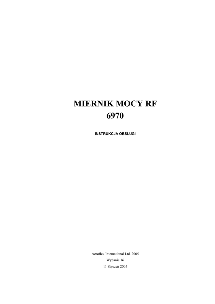 MIERNIK MOCY RF 6970 INSTRUKCJA OBSŁUGI Aeroflex International Ltd. 2005 Wydanie 16 11 Styczeń 2005 Miernik mocy RF 6970 Instrukcja obsługi SPIS TREŚCI ŚRODKI OSTROŻNOŚCI ..............................................................................................................3 Symbole niebezpieczeństwa.......................................................................................................3 Ogólne warunki użytkowania ......................................................................................................3 informacje ogólne...........................................................................................................................4 Przyjęte konwencje.....................................................................................................................4 cechy przyrządu i Zastosowanie .................................................................................................4 DOKŁADNOŚĆ ..........................................................................................................................5 Funkcje obsługowe.....................................................................................................................5 Dane techniczne.........................................................................................................................6 OPcje i akcesoria........................................................................................................................9 OBSŁUGIWANE SENSORY MOCY ...........................................................................................9 Deklaracja zgodności................................................................................................................11 Instalacja .....................................................................................................................................12 Sprawdzenie wizualne ..............................................................................................................12 Wymagania na zasilanie...........................................................................................................12 Sprawdzenie początkowe .........................................................................................................14 Czyszczenie .............................................................................................................................14 Czyszczenie okienka LCD ........................................................................................................14 Obsługa .......................................................................................................................................15 Układ panelu ............................................................................................................................15 KLAWIATURA..........................................................................................................................15 Wyświetlacz .............................................................................................................................18 Uwagi o obsłudze klawiatury I WYŚWIELCZA LCD...................................................................19 Przygotowanie do pracy ...........................................................................................................19 Funkcje KLAWISZY..................................................................................................................21 Zero ......................................................................................................................................21 Cal ........................................................................................................................................21 Jednostki ..............................................................................................................................22 Zakres...................................................................................................................................22 Granica dolna........................................................................................................................22 Granica górna .......................................................................................................................22 Wskazywanie szczytów.........................................................................................................23 Korekcja wypełnienia.............................................................................................................23 Funkcja względnych dB.........................................................................................................23 Inne funkcje..............................................................................................................................24 Uśrednianie...........................................................................................................................24 Zapisywanie przy wyłączaniu zasilania..................................................................................24 Automatyczne wyłączanie zasilania.......................................................................................25 Podsumowanie procedury pomiarowej......................................................................................25 Przygotowanie ......................................................................................................................25 Wykonywanie pomiarów........................................................................................................26 Tryby testowania automatycznego............................................................................................26 Resetowanie MIKROKONTROLERA ........................................................................................26 Ostrzeżenie przed przeciążeniem SENSORa ...................................