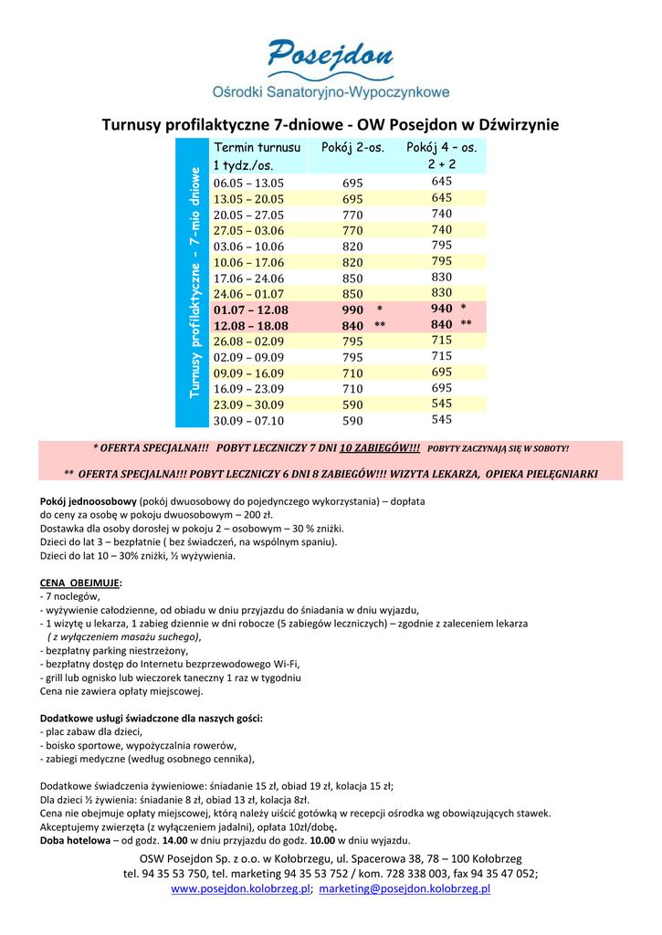Turnusy profilaktyczne - 7-mio dniowe Turnusy profilaktyczne 7-dniowe - OW Posejdon w Dźwirzynie Termin turnusu 1 tydz./os. 06.05 – 13.05 13.05 – 20.05 20.05 – 27.05 27.05 – 03.06 03.06 – 10.06 10.06 – 17.06 17.06 – 24.06 24.06 – 01.07 01.07 – 12.08 12.08 – 18.08 26.08 – 02.09 02.09 – 09.09 09.09 – 16.09 16.09 – 23.09 23.09 – 30.09 30.09 – 07.10 Pokój 2-os. 695 695 770 770 820 820 850 850 990 * 840 ** 795 795 710 710 590 590 Pokój 4 – os. 2+2 645 645 740 740 795 795 830 830 940 * 840 ** 715 715 695 695 545 545 * OFERTA SPECJALNA!!! POBYT LECZNICZY 7 DNI 10 ZABIEGÓW!!! POBYTY ZACZYNAJĄ SIĘ W SOBOTY! ** OFERTA SPECJALNA!!! POBYT LECZNICZY 6 DNI 8 ZABIEGÓW!!! WIZYTA LEKARZA, OPIEKA PIELĘGNIARKI Pokój jednoosobowy (pokój dwuosobowy do pojedynczego wykorzystania) – dopłata do ceny za osobę w pokoju dwuosobowym – 200 zł. Dostawka dla osoby dorosłej w pokoju 2 – osobowym – 30 % zniżki. Dzieci do lat 3 – bezpłatnie ( bez świadczeń, na wspólnym spaniu). Dzieci do lat 10 – 30% zniżki, ½ wyżywienia. CENA OBEJMUJE: - 7 noclegów, - wyżywienie całodzienne, od obiadu w dniu przyjazdu do śniadania w dniu wyjazdu, - 1 wizytę u lekarza, 1 zabieg dziennie w dni robocze (5 zabiegów leczniczych) – zgodnie z zaleceniem lekarza ( z wyłączeniem masażu suchego), - bezpłatny parking niestrzeżony, - bezpłatny dostęp do Internetu bezprzewodowego Wi-Fi, - grill lub ognisko lub wieczorek taneczny 1 raz w tygodniu Cena nie zawiera opłaty miejscowej. Dodatkowe usługi świadczone dla naszych gości: - plac zabaw dla dzieci, - boisko sportowe, wypożyczalnia rowerów, - zabiegi medyczne (według osobnego cennika), Dodatkowe świadczenia żywieniowe: śniadanie 15 zł, obiad 19 zł, kolacja 15 zł; Dla dzieci ½ żywienia: śniadanie 8 zł, obiad 13 zł, kolacja 8zł. Cena nie obejmuje opłaty miejscowej, którą należy uiścić gotówką w recepcji ośrodka wg obowiązujących stawek. Akceptujemy zwierzęta (z wyłączeniem jadalni), opłata 10zł/dobę. Doba hotelowa – od godz. 14.00 w dniu przyjazdu do godz. 10.00 w dniu wyjazdu. OSW Posejdon Sp. z o.o. w Kołobrzegu, ul. Spacerowa 38, 78 – 100 Kołobrzeg tel. 94 35 53 750, tel. marketing 94 35 53 752 / kom. 728 338 003, fax 94 35 47 052; www.posejdon.kolobrzeg.pl; [email protected]