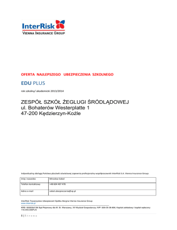 OFERTA NAJLEPSZEGO UBEZPIECZENIA SZKOLNEGO EDU PLUS rok szkolny/ akademicki 2013/2014 ZESPÓŁ SZKÓŁ ŻEGLUGI ŚRÓDLĄDOWEJ ul. Bohaterów Westerplatte 1 47-200 Kędzierzyn-Koźle Indywidualną obsługę Państwa placówki oświatowej zapewnia profesjonalny współpracownik InterRisk S.A. Vienna Insurance Group: Imię i nazwisko Mirosław Sobol Telefon kontaktowy +48 604 407 478 Adres e-mail [email protected] InterRisk Towarzystwo Ubezpieczeń Spółka Akcyjna Vienna Insurance Group www.interrisk.pl ------------------------------------------------------------------------------------------------------------------------------KRS: 0000054136 Sąd Rejonowy dla M. St. Warszawy, XII Wydział Gospodarczy; NIP: 526-00-38-806, Kapitał zakładowy i kapitał wpłacony: 118.440.000PLN 1|Strona Szanowni Państwo, InterRisk S.A. Vienna Insurance Group ma przyjemność przedstawić Państwu specjalną ofertę szkolną EDU PLUS. Nasza Spółka od 18 lat otacza ochroną ubezpieczeniową prawie 2 miliony Klientów. W 2006 roku dołączyliśmy do Grupy VIENNA INSURANCE (VIG) poprzez pozyskanie nowego akcjonariusza - Wiener Städtische Versicherung AG Vienna Insurance Group. VIG jest jednym z największych europejskich koncernów ubezpieczeniowych, ze 180-letnią tradycją, zajmujący wiodącą pozycję w rankingu międzynarodowych grup ubezpieczeniowych w Europie Środkowo – Wschodniej. InterRisk S.A. Vienna Insurance Group zajmuje piatą pozycję wśród największych ubezpieczycieli w Polsce działających w sektorze ubezpieczeń osobowych i majątkowych. Wyróżniamy się na polskim rynku ubezpieczeniowym dynamiką rozwoju firmy (wzrost zebranej składki w 2010 roku o 36% wobec roku 2009), atrakcyjną ofertą ubezpieczeniową, dbałością o bezpieczeństwo osób Ubezpieczonych, profesjonalną obsługą Klientów oraz rosnącym zaufaniem coraz liczniejszej grupy Klientów. W 2009 r. w uznawanym za najbardziej obiektywną klasyfikację spółek rynkowych corocznym rankingu Instytutu Nauk Ekonomicznych Polskiej Akademii Nauk (pod patronatem Ministerstwa Gospodarki) nasza Spółka otrzymała trzeci raz z rzędu wyróżnienie za konsekwentną realizację polityki i strategii przedsiębiorstwa oraz pozycję lidera wśród najbardziej dynamicznych i najbardziej efektywnych przedsiębiorstw w Polsce. Obserwując wnikliwie zmiany zachodzące na rynku, doskonalimy i uatrakcyjniamy nasze produkty tak, aby w jak największym stopniu zaspokajały potrzeby ubezpieczeniowe naszych obecnych jak i przyszłych Klientów. Efektem tych prac jest specjalna oferta szkolna Następstw Nieszczęśliwych Wypadków EDU PLUS, która mamy nadzieję, że spełni Państwa oczekiwania w razie wystąpienia nieszczęśliwego wypadku bądź choroby, które to pomimo naszych wszelkich trosk i opieki mogą przydarzyć się naszym Pociechom. Korzyści płynące z ubezpieczenia młodzieży szkolnej mogą zrekompensować, bądź stanowić bardzo wielką pomoc materialną dla rodziców, opiekunów w przypadku leczenia choroby, bądź skutków nieszczęśliwych wypadków. W nadchodzącym roku szkolnym chcielibyśmy Państwu zaoferować do wyboru trzy unikalne Opcje ubezpieczenia, w ramach których oprócz standardowych świadczeń (śmierć w wyniku nieszczęśliwego wypadku – w tym zawał serca i udar mózgu, uszczerbek na zdrowiu w wyniku NNW, trwałe inwalidztwo częściowe, zwrot kosztów nabycia wyrobów medycznych, będących przedmiotami ortopedycznymi i środków pomocniczych, zwrot kosztów przekwalifikowania zawodowego osób niepełnosprawnych, złamania jednej lub więcej kości w wyniku nieszczęśliwego wypadku) InterRisk S.A. Vienna Insurance Group gwarantuje pomoc finansową w przypadku zachorowania na sepsę, ataku padaczki, pogryzienia przez psa, zatrucia różnymi gazami, bądź substancjami chemicznymi, porażeniem prądem, bądź piorunem, czy też utraty rodzica na skutek nieszczęśliwego wypadku. Każda z wybranych Opcji może zostać rozszerzona o dowolnie wybrane Świadczenie Dodatkowe. W nadchodzącym roku szkolnym mają Państwo do wyboru aż 14 różnych świadczeń: śmierć w wyniku wypadku komunikacyjnego, oparzenia, odmrożenia, pobyt w szpitalu w wyniku nieszczęśliwego wypadku lub choroby, 10 rodzajów najpoważniejszych zachorowań, które mogą wystąpić w wieku dziecięcym lub młodzieńczym oraz zachorowań najbardziej odczuwalnych w grupie zawodowej nauczycieli, operacje plastyczne, operacje w wyniku nieszczęśliwego wypadku lub choroby, zwrot kosztów leczenia lub leczenia stomatologicznego, zasiłek dzienny za każdy dzień pełnej niezdolności do nauki lub pracy, a także świadczenie w przypadku zdiagnozowania wrodzonej wady serca, bądź świadczenie z tytułu uciążliwości leczenia. Ten wyjątkowy zakres można wzbogacić o świadczenia Assistance EDU PLUS, w ramach których uczniowie, studenci, którzy ulegli nieszczęśliwemu wypadkowi mają możliwość skorzystania z indywidualnych korepetycji, natomiast personel Państwa placówki oświatowej może skorzystać z pomocy rehabilitacyjnej, czy też tak bardzo ważnej w dzisiejszych czasach, pomocy medycznej. Ufamy, że InterRisk S.A. Vienna Insurance Group stanie się Państwa partnerem, z którym będziecie współpracować w zakresie ubezpieczeń w nadchodzącym roku szkolnym/ akademickim. Dzięki swej wyjątkowej elastyczności program pozwala w bardzo łatwy sposób skonstruować zakres ubezpieczenia zgodnie z rzeczywistymi Państwa potrzebami i oczekiwaniami. Prezentowany program ubezpieczeniowy jest propozycją, którą zawsze możemy zmodyfikować. Jesteśmy do Państwa dyspozycji, aby szczegółowo przybliżyć naszą unikalną ofertę i zaproponować rozwiązania, których Państwo oczekujecie. Z poważaniem ……………………………………………………… InterRisk S.A. Vienna Insurance Group 2|Strona KORZYŚCI DLA DZIECI, UCZNIÓW, STUDENTÓW UBEZPIECZONYCH 1. Ochrona ubezpieczeniowa w ciągu przez 24 godz. 