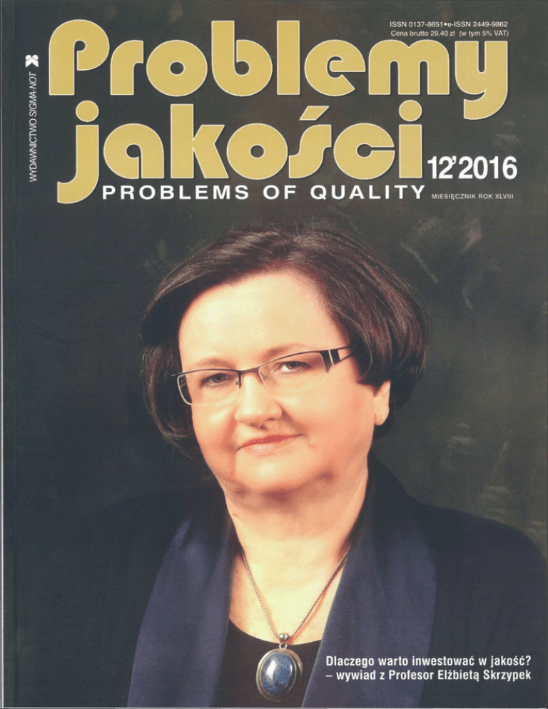 Szanowni Państwo, W końcu listopada br. miało miejs ce wyjątkowe wydarzenie jakościowe - XIX Międzynarodowa Konferencja Na ukowa -„Jakość i logistyka w procesach zarządzania organizacją w gospodarce sieciowej". Konferencje organizowane od dziewiętnastu lat przez Panią Profesor Elżbietę Skrzypek stanowią wyjątkową okazję do wymiany myśli, wiedzy i doświadczeń, a także są olbrzymią inspiracją do podejmowania nowych wyzwań badawczych i nauko wych. Wszystkich Państwa, którzy nie doświadczyli jeszcze prawdziwej uczty intelektualnej, zachęcam do udziału w ko lejnej Jubileuszowej Konferencji w Kazimierzu Dolnym. Już dziś proszę uzupełnić kalendarze o termin 24-26 listopada 2017 roku. Uwaga! Udział w konferencji uzależnia! Problemu # & I Cl KO/0112 2016 B ^■■1 Bi B MIESIĘCZNIK PROBLEMS OF OUALITY Spis Artykuły 8 treści są recenzowane Koncepcje, metody, narzędzia Anna Mazur, Agnieszka Stachowiak Ocena dojrzałości organizacyjnej Zapraszam do lektury naszych artykułów. Z okazji zbliżających się Świąt Bożego Narodzenia pro szę przyjąć najlepsze życzenia radosnych dni wypełnionych melodią kolęd i obecnością bliskich i życzliwych ludzi. Niech powszedni zgiełk ucichnie, a w sercach zagości spokój. Wie le optymizmu, wiary i pogody ducha na cały 2017 rok życzy ,<sr #H w kontekście zwinnego zarządzania ® Wywiad Dlaczego warto inwestować w jakość? - wywiad z prof. zw. dr hab. Elżbietą Skrzypek 3 Małgorzata Wierzbicka ; Koncepcje, metody, narzędzia Marek T. Roszak Integracja wymagań systemowych w ujęciu procesowym Mariola Jastrzębska Zrównoważona gospodarka materiałami kompozytowymi Redaktor naczelna: Małgorzata Wierzbicka a jakość życia Sekretarz redakcji: Agata Szurgit Adam Skrzypek Redaktor honorowy: Tomasz Strzelecki Sztuczna inteligencja - szanse i zagrożenia Stali współpracownicy: dr Piotr Rogala, dr hab. inż. Marek Roszak, mgr Jakub Syta Realizacja graficzno-techniczna i druk: Drukarnia Wydawnictwa SIGMA-NOT 01-595 Warszawa, ul. ks. J. Popiełuszki 21 Adres redakcji ul. Ratuszowa 11, pok. 730,00-950 Warszawa, skr. poczt. 1004 tel. 22 654 96 89; e-mail: [email protected] WYDAWNICTWO SIGMA-NOT Ratuszowa 11,00-950 Warszawa, Skr. poczt. 1004 tel.: 22 818 09 18, 22 818 98 32, faks: 22 619 21 87 Internet: http://sigma-not.pl Prenumerata: e-mail: [email protected] Sekretariat: e-mail: [email protected] RADA NAUKOWO-PROGRAMOWA: prof. Gilmar Ferreira Batalha, prof. zw. dr hab. Tadeusz Borys, prof. Tom Bramorski, prof. zw. dr hab. Marek Bugdol, prof. zw. dr hab. Krystyna Cholewicka-Goździk, prof. Su Mi Dahlgaard-Park, ing. Martina Dzubakova, PhD, prof. Sandra Muizniece-Brasava, prof. Jaroslav Nenadal, prof. Jiri Plura, dr inż. Mirosław Recha, prof. Jurgita Sekliuckiene, prof. zw. dr hab. Elżbieta Skrzypek, prof. zw. dr hab. inż. Stanisław Tkaczyk, prof. zw. dr hab. Maciej Urbaniak LISTA RECENZENTÓW: prof. zw. dr hab. Marek Bugdol, prof. zw. dr hab. Krystyna Cholewicka-Goździk, prof. dr hab. inż. Jan Figurski, prof. nadzw. dr hab. inż. Piotr Grudowski, prof. nadzw. dr hab. inż. Józef Gruszka, dr inż. Wiesław Klimczak, prof. zw. dr hab. Krystyna Lisiecka, dr hab. inż. Agnieszka Misztal, prof. dr hab. inż. Leszek Pacholski, prof. nadzw. dr hab. inż. Marek Roszak, prof. zw. dr hab. Elżbieta Skrzypek, dr hab. Małgorzata Sławińska, dr hab. inż. Andrzej Świderski, prof. zw. dr hab. inż. Stanisław Tkaczyk, prof. dr hab. inż. Edwin Tytyk, prof. zw. dr hab. Maciej Urbaniak, prof. nadzw. dr hab. Małgorzata Z. Wiśniewska, prof. nadzw. dr hab. Zofia Zymonik, dr Janusz Zymonik Reklamy przyjmuje: Redakcja: tel.: 22 654 96 89, faks: 22 619 21 87 e-mail: [email protected] Dział Reklamy i Marketingu Wydawnictwa Tel./faks 22 827 43 65; e-mail: [email protected] Za treść ogłoszeń i reklam redakcja nie odpowiada. Zastrzegamy sobie prawo niezbędnych skrótów w nadesłanych materiałach. Materiałów niezamówionych redakcja nie zwraca. nakład do 3000 egz. ISSN 0137-8651 e-ISSN 2449-9862 a może nowa jakość? ® Jakość w branży motoryzacyjnej Krystyna Lisiecka, Justyna Pawlisz Zarządzanie reklamacjami w przedsiębiorstwie branży motoryzacyjnej - cz. 2 2B Iwona Grabarek Nowe wyzwania w projektowaniu innowacyjnych systemów transportowych 35 4 prasy zagranicznej Piotr Rogala Zarządzanie informacjami w przedsiębiorstwach stosujących Model Doskonałości EFQM 44 Felieton Jakub Syta Ochrona wygenerowanej wartości 45 Co nowego w Klubie POLSKIE FORUM ISO 9000 Marek Roszak Klub jakości... jedyny taki... 46 Varia Opinia o książce Krzysztofa Zymonika pt.„Odpowiedzialność za produkt w zarządzaniu innowacyjnym przedsiębiorstwem" Spis treśc i podawany jest w internecie - www.sigma-not.pl Za publikację artykułów w „Problemach Jakości” Ministerstwo Nauki i Szkolnictwa Wyższego przyznało 11 punktów. 43