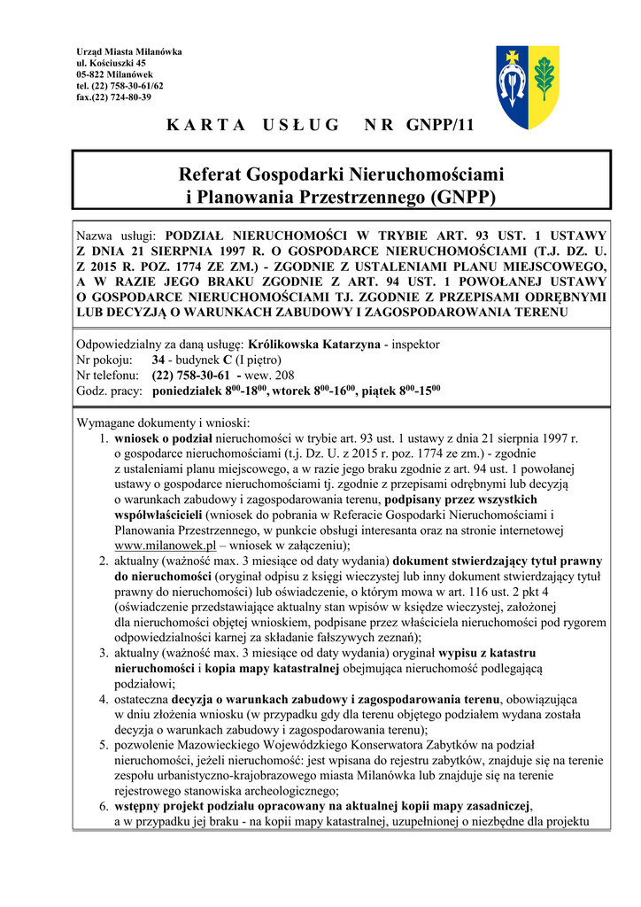 Urząd Miasta Milanówka ul. Kościuszki 45 05-822 Milanówek tel. (22) 758-30-61/62 fax.(22) 724-80-39 KARTA USŁUG N R GNPP/11 Referat Gospodarki Nieruchomościami i Planowania Przestrzennego (GNPP) Nazwa usługi: PODZIAŁ NIERUCHOMOŚCI W TRYBIE ART. 93 UST. 1 USTAWY Z DNIA 21 SIERPNIA 1997 R. O GOSPODARCE NIERUCHOMOŚCIAMI (T.J. DZ. U. Z 2015 R. POZ. 1774 ZE ZM.) - ZGODNIE Z USTALENIAMI PLANU MIEJSCOWEGO, A W RAZIE JEGO BRAKU ZGODNIE Z ART. 94 UST. 1 POWOŁANEJ USTAWY O GOSPODARCE NIERUCHOMOŚCIAMI TJ. ZGODNIE Z PRZEPISAMI ODRĘBNYMI LUB DECYZJĄ O WARUNKACH ZABUDOWY I ZAGOSPODAROWANIA TERENU Odpowiedzialny za daną usługę: Królikowska Katarzyna - inspektor Nr pokoju: 34 - budynek C (I piętro) Nr telefonu: (22) 758-30-61 - wew. 208 Godz. pracy: poniedziałek 800-1800, wtorek 800-1600, piątek 800-1500 Wymagane dokumenty i wnioski: 1. wniosek o podział nieruchomości w trybie art. 93 ust. 1 ustawy z dnia 21 sierpnia 1997 r. o gospodarce nieruchomościami (t.j. Dz. U. z 2015 r. poz. 1774 ze zm.) - zgodnie z ustaleniami planu miejscowego, a w razie jego braku zgodnie z art. 94 ust. 1 powołanej ustawy o gospodarce nieruchomościami tj. zgodnie z przepisami odrębnymi lub decyzją o warunkach zabudowy i zagospodarowania terenu, podpisany przez wszystkich współwłaścicieli (wniosek do pobrania w Referacie Gospodarki Nieruchomościami i Planowania Przestrzennego, w punkcie obsługi interesanta oraz na stronie internetowej www.milanowek.pl – wniosek w załączeniu); 2. aktualny (ważność max. 3 miesiące od daty wydania) dokument stwierdzający tytuł prawny do nieruchomości (oryginał odpisu z księgi wieczystej lub inny dokument stwierdzający tytuł prawny do nieruchomości) lub oświadczenie, o którym mowa w art. 116 ust. 2 pkt 4 (oświadczenie przedstawiające aktualny stan wpisów w księdze wieczystej, założonej dla nieruchomości objętej wnioskiem, podpisane przez właściciela nieruchomości pod rygorem odpowiedzialności karnej za składanie fałszywych zeznań); 3. aktualny (ważność max. 3 miesiące od daty wydania) oryginał wypisu z katastru nieruchomości i kopia mapy katastralnej obejmująca nieruchomość podlegającą podziałowi; 4. ostateczna decyzja o warunkach zabudowy i zagospodarowania terenu, obowiązująca w dniu złożenia wniosku (w przypadku gdy dla terenu objętego podziałem wydana została decyzja o warunkach zabudowy i zagospodarowania terenu); 5. pozwolenie Mazowieckiego Wojewódzkiego Konserwatora Zabytków na podział nieruchomości, jeżeli nieruchomość: jest wpisana do rejestru zabytków, znajduje się na terenie zespołu urbanistyczno-krajobrazowego miasta Milanówka lub znajduje się na terenie rejestrowego stanowiska archeologicznego; 6. wstępny projekt podziału opracowany na aktualnej kopii mapy zasadniczej, a w przypadku jej braku - na kopii mapy katastralnej, uzupełnionej o niezbędne dla projektu podziału elementy zagospodarowania terenu (ilość egzemplarzy równa jest ilości stron postępowania + 2 egzemplarze – w tym 1 oryginał); 7. rzuty poziome ścian oddzielenia przeciwpożarowego usytuowane na całej wysokości budynku od fundamentu do przekrycia dachu lub opinia osoby posiadającej uprawnienia budowlane poświadczająca powyższe (w przypadku gdy proponowany podział powoduje także podział budynku); 8. aktualny odpis z właściwego rejestru w przypadku, jeżeli wnioskodawcą nie jest osoba fizyczna np. KRS; 9. pełnomocnictwo, w przypadku występowania w imieniu właściciela/użytkownika wieczystego nieruchomości podlegającej podziałowi; 10. protokół z przyjęcia granic nieruchomości; 11. wykaz zmian gruntowych; 12. wykaz synchronizacyjny, jeżeli oznaczenie działek gruntu w katastrze nieruchomości jest inne niż w księdze wieczystej; 13. mapa z projektem podziału opracowana w wyniku prac geodezyjnych i kartograficznych, których rezultaty zawiera operat techniczny wpisany do ewidencji materiałów zasobu Powiatowego Ośrodka Dokumentacji Geodezyjnej i Kartograficznej w Grodzisku Mazowieckim. załączniki nr 10 do 13 dołącza się po uzyskaniu pozytywnej opinii (postanowienia). Opłaty: nie podlegają opłacie Ustawowy termin odbioru postanowienia: 30 dni od dnia złożenia kompletnego wniosku Ustawowy termin odbioru decyzji: 30 dni od dnia dostarczenia załączników wymienionych w punktach 10-13 Tryb odwoławczy od postanowienia: zażalenie wniesione, za pośrednictwem Burmistrza Miasta Milanówka, do Samorządowego Kolegium Odwoławczego w terminie 7 dni od dnia otrzymania postanowienia. Tryb odwoławczy od decyzji: odwołanie wniesione, za pośrednictwem Burmistrza Miasta Milanówka, do Samorządowego Kolegium Odwoławczego w terminie 14 dni od dnia otrzymania decyzji. Odbiór: osobiście lub za pośrednictwem poczty Uwagi: dopuszcza się możliwość odbioru przez inną osobę pod warunkiem okazania pełnomocnictwa Podstawa prawna: 1. ustawa z dnia 21 sierpnia 1997 r. o gospodarce nieruchomościami (tekst jednolity - Dz. U. z 2015 r. poz. 1774 ze zm.) 2. rozporządzenie z dnia 7 grudnia 2004 r. Rady Ministrów w sprawie sposobu i trybu dokonywania podziałów nieruchomości (Dz. U. z 2004 r. Nr 268, poz. 2663) 3. ustawa z dnia 14 czerwca 1960 r. Kodeks Postępowania Administracyjnego (tekst jednolity - Dz. U. z 2016 r., poz. 23) 4. ustawa z dnia 9 września 2000 r. o opłacie skarbowej (tekst jednolity - Dz. U. z 2015 r. poz. 783 ze zm.) Uwaga: Aktualność kart jest sprawdzana nie rzadziej niż raz na trzy miesiące Opracował: Zatwierdził: Katarzyna Królikowska – inspektor Anna Fabisiak – kierownik Ref. GNPP data 06.05.2015 r. data 06.05.2015 r.