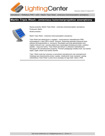 Utworzono: wtorek, 07 marzec 2017 Oświetlenie > Reflektory PAR > LED > Martin Tripix Wash - zmieniacz kolorów/projektor zewnętrzny Martin Tripix Wash - zmieniacz kolorów/projektor zewnętrzny Nazwa produktu: Martin Tripix Wash - zmieniacz kolorów/projektor zewnętrzny Producent: Martin Model produktu: Martin Tripix Wash - zmieniacz kolorow/projektor zewnętrzny Tripix Wash jest atrakcyjnym z wyglądu i nowoczesnym naświetlaczem IP66 korzystającym z diod LED w trzech kolorach. Doskonale jednolite mieszanie barw odbywa się bezpośrednio w soczewce. Rezultatem jest brak jakichkolwiek cieni między kolorami oraz szeroka paleta barw zawierająca fantastyczne biele, subtelne pastele i nasycone kolory. Tripix Wash jest łatwym w obsłudze naświetlaczem oferującym 64 zainstalowane programy. Promień padającego światła może być bardzo wąski, wąski, średni oraz bardzo szeroki. Tripix Wash może być używany w warunkach zewnętrznych oraz wewnętrznych. Instalacje jest niesamowicie prosta i szybka. Użytkownik może rozstawić szereg naświetlaczy Tripix Wash w parę minut używając do tego kabli także z IP66. http://www.lcdistribution.pl | [email protected] | | Strona 1/1