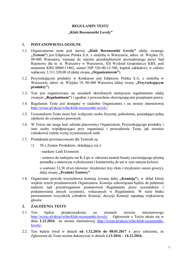REGULAMIN TESTU „Klub Recenzentki Lovely” 1. POSTANOWIENIA OGÓLNE 1.1. Organizatorem testu pod nazwą „Klub Recenzentki Lovely” (dalej zwanego „Testem”) jest Edipresse Polska S.A. z siedzibą w Warszawie, adres: ul. Wiejska 19, 00-480 Warszawa, wpisana do rejestru przedsiębiorców prowadzonego przez Sąd Rejonowy dla m. st. Warszawy w Warszawie, XII Wydział Gospodarczy KRS, pod numerem KRS 0000111462, numer NIP 526-00-12-586, kapitał zakładowy w całości wpłacony 2.311.320,00 zł (dalej zwana „Organizatorem”). 1.2. Przyrzekającym produkty w Konkursie jest Edipresse Polska S.A. z siedzibą w Warszawie, adres: ul. Wiejska 19, 00-480 Warszawa (dalej zwany „Przyrzekającym produkty”). 1.3. Test jest organizowany na zasadach określonych niniejszym regulaminem (dalej zwanym „Regulaminem”) i zgodnie z powszechnie obowiązującymi przepisami prawa. 1.4. Regulamin Testu jest dostępny w siedzibie Organizatora i na stronie internetowej http://wizaz.pl/akcje/wibo/klub-recenzentki-lovely/ 1.5. Uczestnikiem Testu może być wyłącznie osoba fizyczna, pełnoletnia, posiadająca pełną zdolność do czynności prawnych. 1.6. W Teście nie mogą brać udziału pracownicy Organizatora, Przyrzekającego produkty i inne osoby współpracujące przy organizacji i prowadzeniu Testu, jak również członkowie rodzin wyżej wymienionych osób. 1.7. Produktami przeznaczonymi dla Testerek są: 1) 50 x Zestaw Produktów, składający się z: - maskary Lash Extension - zestawu do makijażu ust K-Lips w odcieniu neutral beauty zawierającego płynną pomadkę o matowym wykończeniu i konturówkę do ust w tym samym kolorze o wartości 33,38 zł/szt (słownie: trzydzieści trzy złote i trzydzieści osiem groszy), dalej zwany „Produkt Testowy” 1.8. Organizator powoła trzyosobową komisję (zwaną dalej „Komisją”), w skład której wejdzie trzech przedstawicieli Organizatora. Komisja zobowiązana będzie do pełnienia nadzoru nad przestrzeganiem postanowień Regulaminu przez uczestników i podejmowania innych czynności, wskazanych w Regulaminie. W razie braku porozumienia wszystkich członków Komisji, decyzje Komisji zapadają większością głosów. 2. ZAŁOŻENIA TESTU 2.1. Test będzie przeprowadzony na stronach serwisu internetowego http://wizaz.pl/akcje/wibo/klub-recenzentki-lovely/ . Ogłoszenie o Teście ukaże się w dniu 1.12.2016 na stronie internetowej http://wizaz.pl/akcje/wibo/klub-recenzentkilovely/. 2.2. Test będzie trwał w dniach od 1.12.2016 do 08.01.2017 r. przy założeniu, że Zgłoszenia do Testu można dokonywać w dniach 1.12.2016 – 14.12.2016. 1 2.3 Rozwiązanie Testu, w tym lista Testerek, zostanie ogłoszone na stronie internetowej http://wizaz.pl/akcje/wibo/klub-recenzentki-lovely/ w terminie nie później niż do dnia 20.12.2016 r. 3. ZASADY PROWADZENIA TESTU 3.1. W celu wzięcia udziału w Teście uczestnik powinien: 1) wypełnić formularz zgłoszeniowy znajdujący się na stronie internetowej http://wizaz.pl/akcje/wibo/klub-recenzentki-lovely/, w tym złożyć stosowne oświadczenia i udzielić stosownych zgód stanowiących integralną część formularza zgłoszeniowego; 2) wypełnić ankietę i udzielić odpowiedzi na znajdujące się w formularzu zgłoszeniowym pytanie otwarte: „Napisz, dlaczego chciałabyś wziąć udział w teście kosmetyków Lovely” (dalej zwanej „Odpowiedzią”); 3) przesłać formularz zgłoszeniowy do Organizatora za pomocą znajdującego się na dole formularza przycisku „Wyślij zgłoszenie”. 4) podać dane osobowe niezbędne do wysyłki Produktu 3.2. Jeden uczestnik może wziąć udział w Teście tylko jeden raz. 3.3. Spośród wszystkich poprawnie przesłanych Odpowiedzi na pytanie otwarte, Komisja wybierze 50 najlepszych Odpowiedzi. Przy wyborze najlepszych Odpowiedzi Komisja będzie się kierować własnym uznaniem, biorąc pod uwagę walory artystyczne Odpowiedzi, w szczególności oryginalność i pomysłowość uczestnika – autora Odpowiedzi. Nie ma znaczenia kolejność zgłoszeń. 3.4. Testerkami w liczbie 50 zostaną uczestnicy, których Odpowiedzi na pytanie otwarte zostaną uznane przez Komisję za najlepsze zgodnie z pkt 3.4 powyżej, zwani dalej „Testerami”. Produkty zostaną przyznane po spełnieniu warunków określonych w Regulaminie. 3.5. Uczestnik oświadcza, że Odpowiedź na pytanie otwarte jest unikalną treścią, stworzoną przez niego specjalnie w celu wzięcia udziału w Teście, jak również, że nie jest publikowana w innych serwisach internetowych. 3.6. Uczestnik niniejszym oświadcza, że: (i) jest jedynym autorem Odpowiedzi zgłoszonej przez niego do Testu; (ii) Odpowiedź nie narusza praw osób trzecich; (iii) w przypadku, jeżeli Odpowiedź stanowi utwór, w rozumieniu ustawy z dnia 4 lutego 1994 r. o prawie autorskim i prawach pokrewnych, przysługują mu autorskie prawa majątkowe do Odpowiedzi, w zakresie niezbędnym do udzielenia licencji (iv) Odpowiedź nie stanowi opracowania w rozumieniu ustawy z dnia 4 lutego 1994 r. o prawie autorskim i prawach pokrewnych. 3.7. Odpowiedzi na pytanie otwarte nie spełniające wymogów Regulaminu będą wykluczane z Testu przez Organizatora. 3.8. Do dnia 03.01.2017 r. Testerka otrzyma wiadomość drogą mailową z linkiem do ankiety wynikowej, którą zobowiązana jest wypełnić do dnia 08.01.2017 r. (zwanej dalej „Ankietą Wynikową”). 3.9. Do dnia 03.01.2017 r. Testerka otrzyma wiadomość mailową z prośbą o zamieszczenie swojej opinii o testowanym Produkcie w Katalogu Kosmetyku Wszech Czasów. 2 3.10. Organizator oświadcza, że dane osobowe uczestnika w zakresie: imię i nazwisko, adres email, numer telefonu komórkowego i adres zamieszkania, będą przetwarzane przez Organizatora w celu realizacji umowy przystąpienia do Testu i jego prawidłowego przeprowadzenia lub marketingu bezpośredniego własnych produktów Organizatora i Przyrzekającego produkt. Organizator gwarantuje prawo wglądu uczestnika 