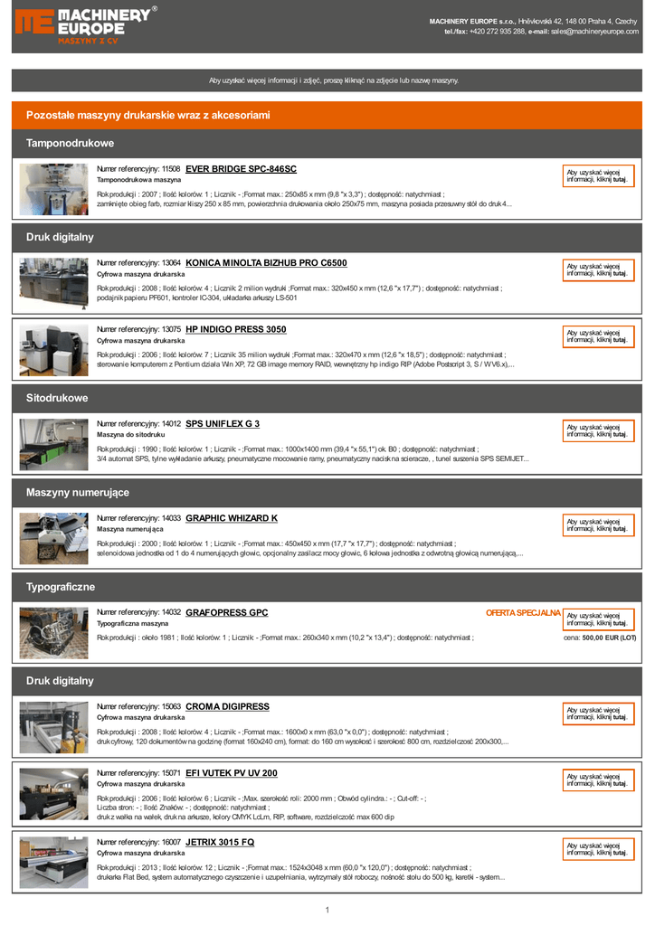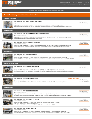 MACHINERY EUROPE s.r.o., Hněvkovská 42, 148 00 Praha 4, Czechy tel./fax: +420 272 935 288, e-mail: [email protected] Aby uzyskać więcej informacji i zdjęć, proszę kliknąć na zdjęcie lub nazwę maszyny. Pozostałe maszyny drukarskie wraz z akcesoriami Tamponodrukowe Numer referencyjny: 11508 EVER BRIDGE SPC-846SC Aby uzyskać więcej informacji, kliknij tutaj. Tamponodrukowa maszyna Rok produkcji : 2007 ; Ilość kolorów: 1 ; Licznik: - ;Format max.: 250x85 x mm (9,8 "x 3,3") ; dostępność: natychmiast ; zamknięte obieg farb, rozmiar kliszy 250 x 85 mm, powierzchnia drukowania około 250x75 mm, maszyna posiada przesuwny stół do druk 4... Druk digitalny Numer referencyjny: 13064 KONICA MINOLTA BIZHUB PRO C6500 Aby uzyskać więcej informacji, kliknij tutaj. Cyfrowa maszyna drukarska Rok produkcji : 2008 ; Ilość kolorów: 4 ; Licznik: 2 milion wydruki ;Format max.: 320x450 x mm (12,6 "x 17,7") ; dostępność: natychmiast ; podajnik papieru PF601, kontroler IC-304, układarka arkuszy LS-501 Numer referencyjny: 13075 HP INDIGO PRESS 3050 Aby uzyskać więcej informacji, kliknij tutaj. Cyfrowa maszyna drukarska Rok produkcji : 2006 ; Ilość kolorów: 7 ; Licznik: 35 milion wydruki ;Format max.: 320x470 x mm (12,6 "x 18,5") ; dostępność: natychmiast ; sterowanie komputerem z Pentium działa Win XP, 72 GB image memory RAID, wewnętrzny hp indigo RIP (Adobe Postscript 3, S / W V6.x),... Sitodrukowe Numer referencyjny: 14012 SPS UNIFLEX G 3 Aby uzyskać więcej informacji, kliknij tutaj. Maszyna do sitodruku Rok produkcji : 1990 ; Ilość kolorów: 1 ; Licznik: - ;Format max.: 1000x1400 mm (39,4 "x 55,1") ok. B0 ; dostępność: natychmiast ; 3/4 automat SPS, tylne wykładanie arkuszy, pneumatyczne mocowanie ramy, pneumatyczny nacisk na scieracze, , tunel suszenia SPS SEMIJET... Maszyny numerujące Numer referencyjny: 14033 GRAPHIC WHIZARD K Aby uzyskać więcej informacji, kliknij tutaj. Maszyna numerująca Rok produkcji : 2000 ; Ilość kolorów: 1 ; Licznik: - ;Format max.: 450x450 x mm (17,7 "x 17,7") ; dostępność: natychmiast ; selenoidowa jednostka od 1 do 4 numerujących głowic, opcjonalny zasilacz mocy głowic, 6 kołowa jednostka z odwrotną głowicą numerującą,... Typograficzne Numer referencyjny: 14032 GRAFOPRESS GPC OFERTA SPECJALNA Aby uzyskać więcej informacji, kliknij tutaj. Typograficzna maszyna Rok produkcji : około 1981 ; Ilość kolorów: 1 ; Licznik: - ;Format max.: 260x340 x mm (10,2 "x 13,4") ; dostępność: natychmiast ; cena: 500,00 EUR (LOT) Druk digitalny Numer referencyjny: 15063 CROMA DIGIPRESS Aby uzyskać więcej informacji, kliknij tutaj. Cyfrowa maszyna drukarska Rok produkcji : 2008 ; Ilość kolorów: 4 ; Licznik: - ;Format max.: 1600x0 x mm (63,0 "x 0,0") ; dostępność: natychmiast ; druk cyfrowy, 120 dokumentów na godzinę (format 160x240 cm), format: do 160 cm wysokosć i szerokosć 800 cm, rozdzielczosć 200x300,... Numer referencyjny: 15071 EFI VUTEK PV UV 200 Aby uzyskać więcej informacji, kliknij tutaj. Cyfrowa maszyna drukarska Rok produkcji : 2006 ; Ilość kolorów: 6 ; Licznik: - ;Max. szerokość roli: 2000 mm ; Obwód cylindra.: - ; Cut-off: - ; Liczba stron: - ; Ilość Znaków: - ; dostępność: natychmiast ; druk z wałka na wałek, druk na arkusze, kolory CMYK LcLm, RIP, software, rozdzielczość max 600 dip Numer referencyjny: 16007 JETRIX 3015 FQ Aby uzyskać więcej informacji, kliknij tutaj. Cyfrowa maszyna drukarska Rok produkcji : 2013 ; Ilość kolorów: 12 ; Licznik: - ;Format max.: 1524x3048 x mm (60,0 "x 120,0") ; dostępność: natychmiast ; drukarka Flat Bed, system automatycznego czyszczenie i uzupełniania, wytrzymały stół roboczy, nośność stołu do 500 kg, karetki - system... 1 MACHINERY EUROPE s.r.o., Hněvkovská 42, 148 00 Praha 4, Czechy tel./fax: +420 272 935 288, e-mail: [email protected] Numer referencyjny: 16021 PRESSTEK 46 DI IMAGING Aby uzyskać więcej informacji, kliknij tutaj. Digitalna maszyna ofsetowa Rok produkcji : 2005 ; Ilość kolorów: 4 ; Licznik: 6 milion wydruki ;Format max.: 340x460 x mm (13,4 "x 18,1") ; dostępność: natychmiast ; urządzenie nie odwracając, automatyczne mycie wałków farbowych, cylindra dociskowego, obciągów, technologia bezwodnego druku ofsetowego z... Typograficzne Numer referencyjny: 16031 VICTORIA 820 Aby uzyskać więcej informacji, kliknij tutaj. Typograficzna maszyna Rok produkcji : 1969 ; Ilość kolorów: 1 ; Licznik: - ;Format max.: 520x720 mm (20,5 "x 28,3") ok. B2 ; dostępność: natychmiast ; tylko do sztancowania Druk digitalny Numer referencyjny: 16043 EFI VUTEK QS3220 OFERTA SPECJALNA Aby uzyskać więcej informacji, kliknij tutaj. Cyfrowa maszyna drukarska Rok produkcji : 2009 ; Ilość kolorów: 7 ; Licznik: - ;Format max.: 3200x0 x mm (126,0 "x 0,0") ; dostępność: natychmiast ; Fleksograficzne Numer referencyjny: 16073 NILPETER F 280 6 Aby uzyskać więcej informacji, kliknij tutaj. Fleksograficzna maszyna Rok produkcji : około 1999 ; Ilość kolorów: 6 ; Licznik: - ;Max. szerokość roli: 290 mm ; Obwód cylindra.: - ; Cut-off: - ; Liczba stron: - ; Ilość Znaków: - ; dostępność: natychmiast ; max. szerokość druku 290 mm, cylindry drukujące 60 - 120, 6 x flexo agregat, 6 x suszenie UV, 3 x agregat rotacyjny tnący Numer referencyjny: 16078 NIELSEN + PETERSEN B 200- 4 Aby uzyskać więcej informacji, kliknij tutaj. Fleksograficzna maszyna Rok produkcji : około 1985 ; Ilość kolorów: 4 ; Licznik: - ;Max. szerokość roli: 222 mm ; Obwód cylindra.: - ; Cut-off: - ; Liczba stron: - ; Ilość Znaków: - ; dostępność: natychmiast ; max. szerokość druku 210 mm, napęd 1/8“, wałki drukujące 60 - 120 zębowe, wałki lakierujące 55 - 103 zębowe, cięcie rotacyjne 60 - 120... Druk digitalny Numer referencyjny: 16097 EFI VUTEK GS 3250 LX Pro OFERTA SPECJALNA Aby uzyskać więcej informacji, kliknij tutaj. Cyfrowa maszyna drukarska Rok produkcji : 2014 ; Ilość kolorów: 8 ; Licznik: - ;Max. szerokoś