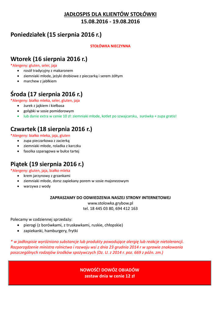 JADŁOSPIS DLA KLIENTÓW STOŁÓWKI 15.08.2016 - 19.08.2016 Poniedziałek (15 sierpnia 2016 r.) STOŁÓWKA NIECZYNNA Wtorek (16 sierpnia 2016 r.) *Alergeny: gluten, seler, jaja • rosół tradycyjny z makaronem • ziemniaki młode, jeżyki drobiowe z pieczarką i serem żółtym • marchew z jabłkiem Środa (17 sierpnia 2016 r.) *Alergeny: białko mleka, seler, gluten, jaja • żurek z jajkiem i kiełbasa • gołąbki w sosie pomidorowym • lub danie extra w cenie 10 zł: ziemniaki młode, kotlet po szwajcarsku, surówka + zupa gratis! Czwartek (18 sierpnia 2016 r.) *Alergeny: białko mleka, jaja, gluten • zupa pieczarkowa z zacierką • ziemniaki młode, roladka z karczku • fasolka szparagowa w bułce tartej Piątek (19 sierpnia 2016 r.) *Alergeny: gluten, jaja, białko mleka • krem jarzynowy z grzankami • ziemniaki młode, dorsz zapiekany porem w sosie majonezowym • warzywa z wody ZAPRASZAMY DO ODWIEDZENIA NASZEJ STRONY INTERNETOWEJ www.stolowka.grybow.pl tel. 18 445 03 80, 694 412 163 Polecamy w codziennej sprzedaży: • pierogi (z borówkami, z truskawkami, ruskie, chłopskie) • zapiekanki, hamburgery, frytki * w jadłospisie wyróżniono substancje lub produkty powodujące alergię lub reakcje nietolerancji. Rozporządzenie ministra rolnictwa i rozwoju wsi z dnia 23 grudnia 2014 r w sprawie znakowania poszczególnych rodzajów środków spożywczych (Dz. U. z 2014 r. poz. 669 z późn. zm.) NOWOŚĆ! DOWÓZ OBIADÓW zestaw dnia w cenie 12 zł