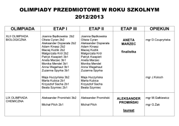 OLIMPIADY PRZEDMIOTOWE W ROKU SZKOLNYM 2012/2013