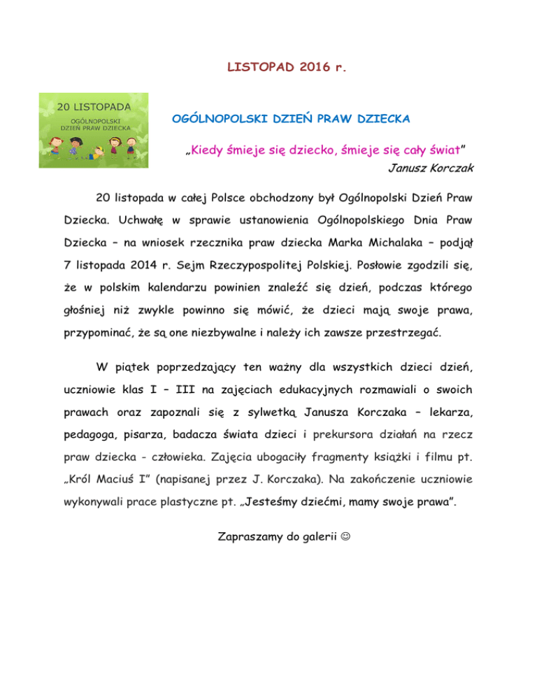LISTOPAD 2016 r. „Kiedy śmieje się dziecko, śmieje się cały świat”