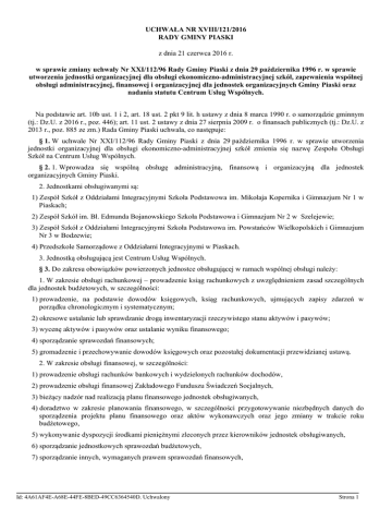 UCHWAŁA NR XVIII/121/2016 RADY GMINY PIASKI z dnia 21 czerwca 2016 r. w sprawie zmiany uchwały Nr XXI/112/96 Rady Gminy Piaski z dnia 29 października 1996 r. w sprawie utworzenia jednostki organizacyjnej dla obsługi ekonomiczno-administracyjnej szkół, zapewnienia wspólnej obsługi administracyjnej, finansowej i organizacyjnej dla jednostek organizacyjnych Gminy Piaski oraz nadania statutu Centrum Usług Wspólnych. Na podstawie art. 10b ust. 1 i 2, art. 18 ust. 2 pkt 9 lit. h ustawy z dnia 8 marca 1990 r. o samorządzie gminnym (tj.: Dz.U. z 2016 r., poz. 446); art. 11 ust. 2 ustawy z dnia 27 sierpnia 2009 r. o finansach publicznych (tj.: Dz.U. z 2013 r., poz. 885 ze zm.) Rada Gminy Piaski uchwala, co następuje: § 1. W uchwale Nr XXI/112/96 Rady Gminy Piaski z dnia 29 października 1996 r. w sprawie utworzenia jednostki organizacyjnej dla obsługi ekonomiczno-administracyjnej szkół zmienia się nazwę Zespołu Obsługi Szkół na Centrum Usług Wspólnych. § 2. 1. Wprowadza się wspólną obsługę administracyjną, finansową i organizacyjną dla jednostek organizacyjnych Gminy Piaski. 2. Jednostkami obsługiwanymi są: 1) Zespół Szkół z Oddziałami Integracyjnymi Szkoła Podstawowa im. Mikołaja Kopernika i Gimnazjum Nr 1 w Piaskach; 2) Zespół Szkół im. Bł. Edmunda Bojanowskiego Szkoła Podstawowa i Gimnazjum Nr 2 w Szelejewie; 3) Zespół Szkół z Oddziałami Integracyjnymi Szkoła Podstawowa im. Powstańców Wielkopolskich i Gimnazjum Nr 3 w Bodzewie; 4) Przedszkole Samorządowe z Oddziałami Integracyjnymi w Piaskach. 3. Jednostką obsługującą jest Centrum Usług Wspólnych. § 3. Do zakresu obowiązków powierzonych jednostce obsługującej w ramach wspólnej obsługi należy: 1. W zakresie obsługi rachunkowej – prowadzenie ksiąg rachunkowych z uwzględnieniem zasad szczególnych dla jednostek budżetowych, w szczególności: 1) prowadzenie, na podstawie dowodów księgowych, ksiąg rachunkowych, ujmujących zapisy zdarzeń w porządku chronologicznym i systematycznym; 2) okresowe ustalanie lub sprawdzanie drogą inwentaryzacji rzeczywistego stanu aktywów i pasywów; 3) wycenę aktywów i pasywów oraz ustalanie wyniku finansowego; 4) sporządzanie sprawozdań finansowych; 5) gromadzenie i przechowywanie dowodów księgowych oraz pozostałej dokumentacji przewidzianej ustawą. 2. W zakresie obsługi finansowej, w szczególności: 1) prowadzenie obsługi rachunków bankowych i wydzielonych rachunków dochodów, 2) prowadzenie obsługi finansowej Zakładowego Funduszu Świadczeń Socjalnych, 3) bieżący nadzór nad realizacją planu finansowego jednostek obsługiwanych, 4) doradztwo w zakresie planowania finansowego, w szczególności przygotowywanie niezbędnych danych do sporządzenia projektu planu finansowego oraz aktów wykonawczych oraz jego zmiany w trakcie roku budżetowego, 5) wykonywanie dyspozycji środkami pieniężnymi zleconych przez kierowników jednostek obsługiwanych, 6) sporządzanie jednostkowych sprawozdań budżetowych, 7) sporządzanie innych, wymaganych prawem sprawozdań finansowych, Id: 4A61AF4E-A68E-44FE-8BED-49CC6364540D. Uchwalony Strona 1 8) sporządzanie list wynagrodzeń pracowników jednostek obsługiwanych, 9) dokonywanie wypłat wynagrodzeń oraz naliczanie i odprowadzanie związanych z tym świadczeń obligatoryjnych na rzecz Zakładu Ubezpieczeń Społecznych oraz Urzędu Skarbowego, 10) sporządzanie deklaracji dla Urzędu Skarbowego oraz Zakładu Ubezpieczeń Społecznych, 11) przygotowywanie i opracowywanie danych do sprawozdania o średniorocznym wynagrodzeniu nauczycieli w zakresie wypłaconych kwot wynagrodzeń, 12) sprawowanie nadzoru nad wykorzystaniem przyznanych jednostkom obsługiwanym środków finansowych wg kryterium celowości, oszczędności i zgodności z prawem. 3. W zakresie obsługi administracyjno-organizacyjnej, w szczególności: 1) prowadzenie akt osobowych dyrektorów jednostek obsługiwanych, 2) gromadzenie, weryfikacja i aktualizacja danych w systemie informacji oświatowej (SIO) oraz w rejestrze szkół i placówek oświatowych (RSPO), 3) opiniowanie arkuszy organizacyjnych jednostek obsługiwanych przez ich przedłożeniem do zatwierdzenia, 4) przygotowywanie projektów regulaminów konkursowych, projektów uchwał dotyczących tworzenia, przekształcenia bądź likwidacji obsługiwanych jednostek i projektów innych dokumentów o organizacyjnym charakterze, 5) koordynacja działań promujących edukację i rozwijających gminne zasoby oświaty, 6) inne prace zlecone przez Wójta Gminy. § 4. Jednostka obsługująca współdziała z dyrektorami jednostek obsługiwanych w celu zapewnienia właściwych warunków funkcjonowania. § 5. Kierownik jednostki obsługującej jest odpowiedzialny za gospodarkę finansową jednostek obsługiwanych w zakresie obowiązków powierzonych niniejszą uchwałą oraz za rachunkowość i sprawozdawczość jednostek obsługiwanych na zasadach określonych w art. 53 ust. 2 ustawy z dnia 27 sierpnia 2009 r. o finansach publicznych. § 6. Nadaje się Statut Centrum Usług Wspólnych w brzmieniu określonym w załączniku Nr 1 do niniejszej uchwały. § 7. Wykonanie uchwały powierza się Wójtowi Gminy Piaski. § 8. Traci moc uchwała Nr XXV/172/2008 Rady Gminy Piaski z dnia 30 października 2008 r. w sprawie statutu gminnej jednostki organizacyjnej o nazwie „Zespół Obsługi Szkół”. § 9. Uchwała wchodzi w życie z dniem 1 stycznia 2017 roku. Przewodnicząca Rady Gminy Irena Różalska Id: 4A61AF4E-A68E-44FE-8BED-49CC6364540D. Uchwalony Strona 2 Załącznik do Uchwały Nr XVIII/121/2016 Rady Gminy Piaski z dnia 21 czerwca 2016 r. STATUT CENTRUM USŁUG WSPÓLNYCH Rozdział 1. Postanowienia ogólne § 1. 1. Centrum Usług Wspólnych, znane dalej Centrum jest gminną jednostką organizacyjną działającą na zasadach jednostki budżetowej. 2. Centrum działa na podstawie powszechnie obowiązujących przepisów prawa oraz niniejszego Statutu. 3. Centrum ma 
