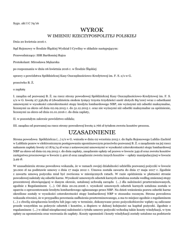 Sygn. akt I C 79/16 WYROK W IMIENIU RZECZYPOSPOLITEJ POLSKIEJ Dnia 20 kwietnia 2016 r. Sąd Rejonowy w Środzie Śląskiej Wydział I Cywilny w składzie następującym: Przewodniczący: SSR Bartłomiej Rajca Protokolant: Mirosława Mękarska po rozpoznaniu w dniu 06 kwietnia 2016 r. w Środzie Śląskiej sprawy z powództwa Spółdzielczej Kasy Oszczędnościowo-Kredytowej im. F. S. z/s w G. przeciwko B. Ż. o zapłatę I. zasądza od pozwanej B. Ż. na rzecz strony powodowej Spółdzielczej Kasy Oszczędnościowo-Kredytowej im. F. S. z/s w G. kwotę 27.336,89 zł (dwadzieścia siedem tysięcy trzysta trzydzieści sześć złotych 89/100) wraz z odsetkami umownymi w wysokości czterokrotności stopy kredytu lombardowego NBP, nie wyższymi niż odsetki maksymalne, liczonymi za okres od dnia 02.09.2015 r. do 31.12.2015 r. oraz nie wyższymi niż odsetki maksymalne za opóźnienie, liczonymi za okres od dnia 01.01.2016 r. do dnia zapłaty, II. w pozostałym zakresie powództwo oddala; III. zasądza od pozwanej na rzecz strony powodowej kwotę 2.766 zł tytułem zwrotu kosztów procesu. UZASADNIENIE Strona powodowa Spółdzielcza (...) z/s w G. wniosła w dniu 02 września 2015 r. do Sądu Rejonowego Lublin-Zachód w Lublinie pozew w elektronicznym postępowaniu upominawczym przeciwko pozwanej B. Ż. o zasądzenie na jej rzecz nakazem zapłaty kwoty 27.879,74 zł wraz z ustawowymi umownymi w wysokości czterokrotności stopy lombardowej NBP za okres od dnia 02.09.2015 r. do dnia zapłaty, zasądzenie opłaty od pozwu w kwocie 349 zł oraz zwrotu kosztów zastępstwa procesowego w kwocie 2.400 zł oraz zasądzenie zwrotu innych kosztów – opłaty manipulacyjnej w kwocie 3,49 zł. W uzasadnieniu strona powodowa wskazała, że w ramach swojej działalności udzieliła pozwanej pożyczki w kwocie 30.000 zł na podstawie umowy z dnia 17 maja 2012 r. Umowa została zawarta do dnia 17 maja 2017 r. Zgodnie z zawarta umową pożyczka miał być zwrócona w miesięcznych ratach. W razie opóźnienia w płatności stronie powodowej należały się odsetki karne. Wysokość umownych odsetek karnych ustalona została według zmiennej stopy procentowej obowiązującej w danym okresie, ustalonej uchwałą zarządu (...) dla należności przeterminowanych, zgodnie z Regulaminem (...). Od dnia 20.02.2006 r. wysokość umownych odsetek karnych ustalona została w oparciu o oprocentowanie kredytu lombardowego ogłaszanego przez NBP. Na dzień wniesienia pozwu odsetki karne określone zostały w wysokości czterokrotności stopy lombardowej NBP w stosunku rocznym. Strona powodowa wskazała również, że w przypadku powstania zadłużenia przeterminowanego, a ma to miejsce zgodnie z regulaminem (...) z chwilą niespłacenia kredytu lub jego raty w terminie, dokonywane przez pożyczkobiorców wpłaty są zaliczane przede wszystkim na pokrycie odsetek i kosztów, a dopiero w dalszej kolejności na kapitał pożyczki. Zgodnie z regulaminem (...) w skład niespłaconej należności z tytułu umowy pożyczki wchodzą także koszty windykacji, w tym opłaty za upomnienia oraz wezwania do zapłaty. Koszty upomnień i koszty windykacji zostały ustalone na podstawie uchwały zarządu (...) ustanawiającej stawi opłat za wezwania. Pożyczkobiorca zawierając umowę pożyczki potwierdził zapoznanie się z wysokością kosztów, które będą go obciążać w razie nieterminowego regulowania rat pożyczki. Strona powodowa wskazała, że wszystkie koszty dodatkowe, a to odsetki karne oraz koszty upomnień oraz windykacji zostały naliczone na skutek nieprzestrzegania przez pożyczkobiorcę planu spłaty. Opóźnienia w spłacie zadłużenia spowodowały konieczność podjęcia czynności przez zewnętrzną firmę windykacyjną. Wysokość opłat windykacyjnych przewidziana została w uchwałach zarządu (...), do przestrzegania których pożyczkobiorca jest zobowiązany jako członek Spółdzielni. Strona powodowa wyjaśniła, że wysokość opłaty z tytułu windykacji terenowej została ustalona w odniesieniu do wysokości kwoty zadłużenia. Strona powodowa oświadczyła, że podstawa do pobierania opłaty z tytułu windykacji wynika z mocy postanowień Regulaminu (...), który stanowi obligatoryjną i wiążącą dla dłużników część umowy. Z zapisów tego Regulaminu wynika, że strona powodowa jest uprawniona do pobierania prowizji i opłat określonych w Tabeli prowizji i opłat związanych z obsługą kredytu i pożyczki. Jako opłaty związane z obsługą kredytu lub pożyczki, opłaty windykacyjne obciążają dłużnika na mocy postanowień Regulaminu. Opłata za podejmowane czynności windykacyjne naliczana jest w chwili przekazania przeterminowanej należności do firmy, nie zależy zaś od rezultatu jej działań. Strona powodowa wskazała, że pozwana jako pożyczkobiorczyni mimo zobowiązania wynikającego z umowy, nie regulowała rat pożyczki w ustalonych przez strony terminach. Z tego powodu strona powodowa uzyskała podstawę do wypowiedzenia stosunku umownego. Wypowiedzenie umowy zostało skutecznie doręczone pozwanej pod adres wskazany przez pozwaną w okresie obowiązywania umowy pożyczki, zgodnie z obowiązkiem informowania o zmianach adresu zamieszkania i adresu do korespondencji, skutkując wymagalnością roszczenia w dniu 12 września 2014 r. Ponadto strona powodowa podniosła, że przepis art. 14 ustawy o kredycie konsumenckim przyznaje pożyczkodawcy prawo wypowiedzenia umowy o kredyt konsumencki w razie opóźnienia konsumenta z zapłatą rat kredytowych. Wypowiedzenie jest możliwe, jeśli konsument zalega z zapłatą części bądź całości rat w sumie o wartości równej co najmniej dwóm pełnym ratom – jak to miało miejsce w przypadku pozwanej. Strona powodowa wskazała, że wymagalność zadłużenia w niniejszej sprawie ustalona została w oparciu o wypowiedzenie umowy pożyczki. Strona powodowa wskazała, że pozwana wystąpiła do pożyczkodawcy z wnioskiem o umożliw
