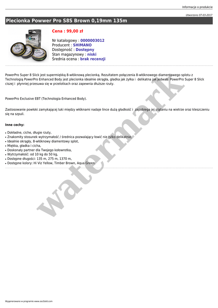 Informacje o produkcie Utworzono 07-03-2017 Plecionka Powwer Pro S8S Brown 0,19mm 135m Cena : 99,00 zł Nr katalogowy : 0000003012 Producent : SHIMANO Dostępność : Dostępny Stan magazynowy : niski Średnia ocena : brak recenzji er m ar k PowerPro Super 8 Slick jest supermiękką 8-włóknową plecionką. Rezultatem połączenia 8-włóknowego diamentowego splotu z Technologią PowerPro Enhanced Body jest plecionka idealnie okrągła, gładka jak żyłka i delikatna jak jedwab. PowerPro Super 8 Slick ciszej i płynniej przesuwa się w przelotkach oraz zapewnia dłuższe rzuty. PowerPro Exclusive EBT (Technologia Enhanced Body). Zastosowanie powłoki zamykającej luki między włóknami nadaje lince dużą gładkość i zapobiega jej plątaniu na wietrze oraz kleszczeniu się na szpuli. Inne cechy: ● ● ● ● ● ● ● w at ● Dokładne, ciche, długie rzuty, Znakomity stosunek wytrzymałość / średnica pozwalający łowić nie tylko delikatnie, Idealnie okrągły, 8-włóknowy diamentowy splot, Miękka, gładka i cicha, Doskonały partner dla Twojego kołowrotka, Wytrzymałość: od 10 kg do 50 kg, Dostępne długości: 135 m, 275 m, 1370 m, Dostępne kolory: Hi Viz Yellow, Timber Brown, Aqua Green. Wygenerowano w programie www.oscGold.com