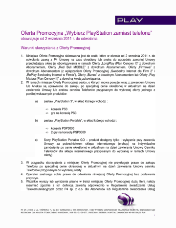 Oferta Promocyjna „Wybierz PlayStation zamiast telefonu” obowiązuje od 2 września 2011 r. do odwołania. Warunki skorzystania z Oferty Promocyjnej 1. Niniejsza Oferta Promocyjna skierowana jest do osób, które w okresie od 2 września 2011 r. do odwołania zawrą z P4 Umowę na czas określony lub aneks do uprzednio zawartej Umowy przedłuŜający okres jej obowiązywania w ramach Oferty „LongPlay (Plan Cenowy II)” z dowolnym Abonamentem, Oferty „Red Bull MOBILE” z dowolnym Abonamentem, Oferty „Firmowa” z dowolnym Abonamentem (z wyłączeniem Oferty Promocyjnej „Swobodny Internet dla Firm 2” i „RePlay Swobodny Internet w Firmie”), Oferty „Biznes” z dowolnym Abonamentem lub Oferty „Play Mixtura (Plan Cenowy II)” z dowolną kwotą zobowiązania. 2. W ramach niniejszej Oferty Promocyjnej osoby, o których mowa powyŜej wraz z zawarciem Umowy lub Aneksu są uprawnione do zakupu po specjalnej cenie określonej w aktualnym na dzień zawierania Umowy lub aneksu cenniku Telefonów przypisanym do wybranej oferty jednego z poniŜej wskazanych produktów: a) zestaw „PlayStation 3”, w skład którego wchodzi : • • b) zestaw „PlayStation Portable”, w skład którego wchodzi : • • c) konsola PS3 gra na konsolę PS3 konsola PSP3000 2 gry na konsolę PSP3000 Sony PlayStation Portable GO – produkt dostępny tylko i wyłącznie przy zawarciu Umowy za pośrednictwem sklepu internetowego (e-shop) na indywidualne zamówienie po cenie określonej w aktualnym na dzień zawierania Umowy Cenniku Telefonów dla sklepu internetowego przypisanym do wybranej w ramach Umowy oferty) 3. W przypadku skorzystania z niniejszej Oferty Promocyjnej nie przysługuje prawo do zakupu Telefonu po specjalnej cenie określonej w aktualnym na dzień zawierania Umowy cenniku Telefonów przypisanym do wybranej oferty. 4. Operator zastrzega sobie prawo do odwołania niniejszej Oferty Promocyjnej bez podawania przyczyn. 5. Wszelkie wyrazy lub wyraŜenia pisane w treści niniejszej Oferty Promocyjnej duŜą literą naleŜy rozumieć zgodnie z ich definicją zawartą odpowiednio w Regulaminie świadczenia Usług Telekomunikacyjnych przez P4 sp. z o.o. dla Abonentów lub Regulaminie świadczenia Usług P4 SP. Z O.O. / UL. TAŚMOWA 7 / 02-677 WARSZAWA / KRS 0000217207 / XIII WYDZIAŁ GOSPODARCZY KRAJOWEGO REJESTRU SĄDOWEGO SĄD REJONOWY DLA MIASTA STOŁECZNEGO WARSZAWY / NIP 951-21-20-077 / REGON 015808609 / KAPITAŁ ZAKŁADOWY 48 456 500,00 PLN 1 Telekomunikacyjnych przez P4 sp. z o.o. dla Abonentów Mix II. 6. Warunki niniejszej Oferty Promocyjnej dostępne są na stronie internetowej www.play.pl. 7. P4 zastrzega, iŜ dostępność zestawów, o których mowa w pkt 2, uzaleŜniona jest od aktualnych stanów magazynowych P4. P4 SP. Z O.O. / UL. TAŚMOWA 7 / 02-677 WARSZAWA / KRS 0000217207 / XIII WYDZIAŁ GOSPODARCZY KRAJOWEGO REJESTRU SĄDOWEGO SĄD REJONOWY DLA MIASTA STOŁECZNEGO WARSZAWY / NIP 951-21-20-077 / REGON 015808609 / KAPITAŁ ZAKŁADOWY 48 456 500,00 PLN 2