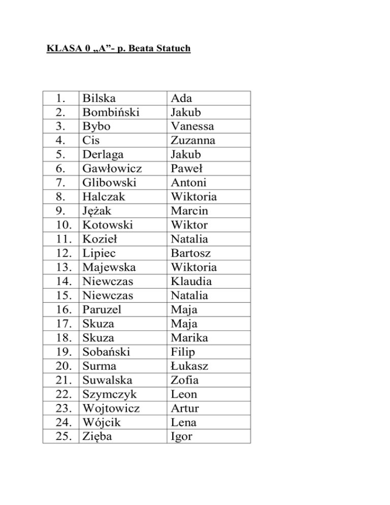 KLASA 0 „A”- p. Beata Statuch 1. 2. 3. 4. 5. 6. 7. 8. 9. 10. 11. 12. 13. 14. 15. 16. 17. 18. 19. 20. 21. 22. 23. 24. 25. Bilska Bombiński Bybo Cis Derlaga Gawłowicz Glibowski Halczak Jężak Kotowski Kozieł Lipiec Majewska Niewczas Niewczas Paruzel Skuza Skuza Sobański Surma Suwalska Szymczyk Wojtowicz Wójcik Zięba Ada Jakub Vanessa Zuzanna Jakub Paweł Antoni Wiktoria Marcin Wiktor Natalia Bartosz Wiktoria Klaudia Natalia Maja Maja Marika Filip Łukasz Zofia Leon Artur Lena Igor KLASA 0 „B”- p. Barbara Zacharska 1. 2. 3. 4. 5. 6. 7. 8. 9. 10. 11. 12. 13. 14. 15. 16. 17. 18. 19. 20. 21. 22. 23. 24. 25. Barańska Bremer Cichocki Cygan Falkiewicz Gajewska Głowacki Kasperkiewicz Kowalczyk Kutera Masłowska Miśkiewicz Moskwa Niewczas Nowak Piątek Pietroń Rębowska Roman Roman Rzeszutek Sikora Wiedro Wiśniewska Zawadzka Zofia Bartosz Franciszek Magdalena Dawid Zuzanna Jan Miłosz Patrycja Bogna Maja Kacper Bartosz Aleks Wiktor Kryspin Lena Nikola Dawid Julia Piotr Lena Barbara Oliwia Małgorzata