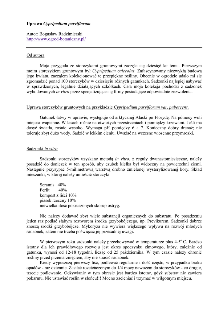 Uprawa Cypripedium parviflorum Autor: Bogusław Radzimierski http://www.ogrod-botaniczny.pl/ Od autora. Moja przygoda ze storczykami gruntowymi zaczęła się dziesięć lat temu. Pierwszym moim storczykiem gruntowym był Cypripedium calceolus. Zafascynowany niezwykłą budową jego kwiatu, zacząłem kolekcjonować te przepiękne rośliny. Obecnie w ogrodzie udało mi się zgromadzić ponad 100 storczyków w dziesięciu różnych gatunkach. Sadzonki najlepiej nabywać w sprawdzonych, legalnie działających szkółkach. Cała moja kolekcja pochodzi z sadzonek wyhodowanych in vitro przez specjalizujące się firmy posiadające odpowiednie zezwolenia. Uprawa storczyków gruntowych na przykładzie Cypripedium parviflorum var. pubescens. Gatunek łatwy w uprawie, występuje od arktycznej Alaski po Florydę. Na północy woli miejsca wapienne. W lasach rośnie na otwartych przestrzeniach i pomiędzy krzewami. Jeśli ma dosyć światła, rośnie wysoko. Wymaga pH pomiędzy 6 a 7. Konieczny dobry drenaż; nie toleruje zbyt dużo wody. Sadzić w lekkim cieniu. Uważać na wczesne wiosenne przymrozki. Sadzonki in vitro Sadzonki storczyków uzyskane metodą in vitro, z reguły dwunastomiesięczne, należy posadzić do doniczek w ten sposób, aby czubek kiełka był widoczny na powierzchni ziemi. Następnie przysypać 5-milimetrową warstwą drobno zmielonej wysterylizowanej kory. Skład mieszanki, w której należy umieścić storczyki: Seramis 40% Perlit 40% kompost z liści 10% piasek rzeczny 10% niewielka ilość pokruszonych skorup ostryg. Nie należy dodawać zbyt wiele substancji organicznych do substratu. Po posadzeniu jeden raz podlać słabym roztworem środka grzybobójczego, np. Previkurem. Sadzonki dobrze znoszą środki grzybobójcze. Mykoryza nie wywiera większego wpływu na rozwój młodych sadzonek, zatem nie trzeba poświęcać jej przesadnej uwagi. W pierwszym roku sadzonki należy przechowywać w temperaturze plus 4-5o C. Bardzo istotny dla ich prawidłowego rozwoju jest okres spoczynku zimowego, który, zależnie od gatunku, wynosi od 12-18 tygodni, licząc od 25 października. W tym czasie należy chronić rośliny przed przemarznięciem, aby nie stracić sadzonek. Kiedy wypuszczą pierwszy liść, podlewać regularnie i dość często, w przypadku braku opadów - raz dziennie. Zasilać rozcieńczonym do 1/4 mocy nawozem do storczyków - co drugie, trzecie podlewanie. Odżywianie w tym okresie jest bardzo istotne, gdyż substrat nie zawiera pokarmu. Nie ustawiać roślin w słońcu!!! Mocno zacieniać i trzymać w wilgotnym miejscu. Po roku sadzonki wyglądają inaczej, system korzeniowy jest silniej rozbudowany i możemy posadzić je do gruntu, po dodatkowym dodaniu 15-20% wysterylizowanego kompostu. Po dwóch latach storczyki wypuszczają dodatkowe liście i opieka nad nimi polega już wówczas tylko na zasilaniu dwa razy do roku nawozem do storczyków. Z reguły po 5 latach zakwitają. Oczywiście, wymagania wahają się w zależności od odmiany. Generalnie jednak, powyższe zalecenia pozwalają wierzyć w powodzenie uprawy większości odmian. Adresy szkółek specjalizujących się rozmnażaniem sadzonek storczyków posiadających świadectwo CITES. Helgard Kernstein, Garden-Orchideen AM Kirchenfeld 8 86316 Friedberg Germany Paul Christian RarePlants PO,Box 468 Wrexham,LL139XR UK http://rareplants.co.uk/ Werner Frosch Frankfurt/M Germany http://www.w-frosch.onlinehome.de Vermont Ladyslipper Company 56 Leduc Road New Haven, VT 05472-1000 U.S.A. http://www.vtladyslipper.com/ Literatura. A Botanical Magazine Monograph The Genus CYPRIPEDIUM Phillip Cribb The Royal Botanic Gardens, Kew, in association with Timber Press Published by Timber Pr (September, 1997) ISBN 0881924032