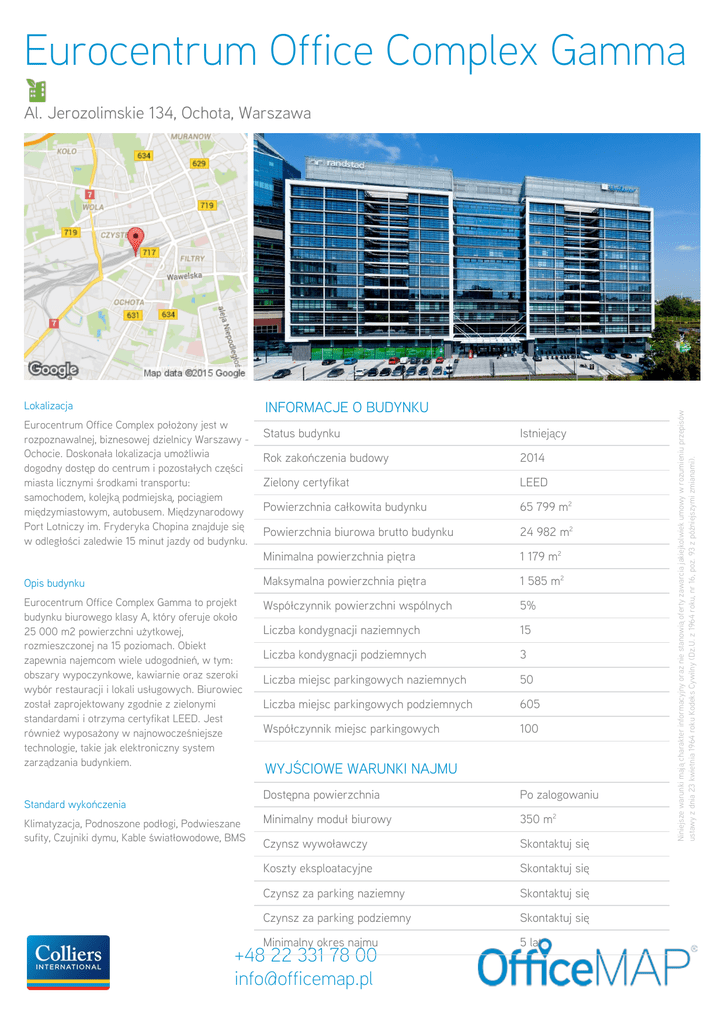 Eurocentrum Office Complex Gamma Lokalizacja INFORMACJE O BUDYNKU Eurocentrum Office Complex położony jest w rozpoznawalnej, biznesowej dzielnicy Warszawy Ochocie. Doskonała lokalizacja umożliwia dogodny dostęp do centrum i pozostałych części miasta licznymi środkami transportu: samochodem, kolejką podmiejską, pociągiem międzymiastowym, autobusem. Międzynarodowy Port Lotniczy im. Fryderyka Chopina znajduje się w odległości zaledwie 15 minut jazdy od budynku. Status budynku Istniejący Rok zakończenia budowy 2014 Zielony certyfikat LEED Powierzchnia całkowita budynku 65 799 m2 Powierzchnia biurowa brutto budynku 24 982 m2 Minimalna powierzchnia piętra 1 179 m2 Opis budynku Maksymalna powierzchnia piętra 1 585 m2 Eurocentrum Office Complex Gamma to projekt budynku biurowego klasy A, który oferuje około 25 000 m2 powierzchni użytkowej, rozmieszczonej na 15 poziomach. Obiekt zapewnia najemcom wiele udogodnień, w tym: obszary wypoczynkowe, kawiarnie oraz szeroki wybór restauracji i lokali usługowych. Biurowiec został zaprojektowany zgodnie z zielonymi standardami i otrzyma certyfikat LEED. Jest również wyposażony w najnowocześniejsze technologie, takie jak elektroniczny system zarządzania budynkiem. Współczynnik powierzchni wspólnych 5% Liczba kondygnacji naziemnych 15 Liczba kondygnacji podziemnych 3 Liczba miejsc parkingowych naziemnych 50 Liczba miejsc parkingowych podziemnych 605 Współczynnik miejsc parkingowych 100 Standard wykończenia Klimatyzacja, Podnoszone podłogi, Podwieszane sufity, Czujniki dymu, Kable światłowodowe, BMS WYJŚCIOWE WARUNKI NAJMU Dostępna powierzchnia Po zalogowaniu Minimalny moduł biurowy 350 m2 Czynsz wywoławczy Skontaktuj się Koszty eksploatacyjne Skontaktuj się Czynsz za parking naziemny Skontaktuj się Czynsz za parking podziemny Skontaktuj się Minimalny okres najmu 5 lat +48 22 331 78 00 [email protected] Niniejsze warunki mają charakter informacyjny oraz nie stanowią oferty zawarcia jakiejkolwiek umowy w rozumieniu przepisów ustawy z dnia 23 kwietnia 1964 roku Kodeks Cywilny (Dz.U. z 1964 roku, nr 16, poz. 93 z późniejszymi zmianami). Al. Jerozolimskie 134, Ochota, Warszawa