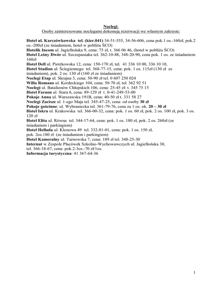 Noclegi: Osoby zainteresowane noclegami dokonują rezerwacji we własnym zakresie: Hotel ul. Karczówkowska tel. (kier.041) 34-51-555, 34-56-606, cena pok.1 os.-160zł, pok.2 os.-200zł (ze śniadaniem, hotel w pobliżu ŚCO) Hotelik Incom ul. Jagiellońska 9, cena: 75 zł, t. 366 06 46, (hotel w pobliżu ŚCO) Hotel Leśny Dwór ul. Szczepaniaka tel. 362-10-88, 348-20-90, cena pok. 1 os. ze śniadaniem 160zł Hotel Dell ul. Piotrkowska 12, cena: 150-170 zł, tel. 41 336 10 00, 336 10 10, Hotel Stadion ul. Ściegiennego tel. 368-77-15, cena: pok. 1 os. 115zł (130 zł ze śniadaniem), pok. 2 os. 130 zł (160 zł ze śniadaniem) Noclegi Etap ul. Skrajna 3, cena: 50-90 zł tel. 0 607 250 024 Willa Romano ul. Kordeckiego 104, cena: 50-70 zł, tel. 362 92 51 Noclegi ul. Batalionów Chłopskich 106, cena: 25-45 zł: t. 345 75 15 Hotel Faraon ul. Stara 6, cena: 89-129 zł t. 0-41-249-53-00 Pokoje Anna ul. Warszawska 191B, cena: 40-50 zł t. 331 58 27 Noclegi Zacisze ul. 1-ego Maja tel. 345-47-25, cena: od osoby 30 zł Pokoje gościnne: ul. Wybraniecka tel. 361-79-76, cena za 1 os. ok. 20 – 30 zł Hotel Iskra ul. Krakowska tel. 366-00-32, cena: pok. 1 os. 60 zł, pok. 2 os. 100 zł, pok. 3 os. 120 zł Hotel Elita ul. Równa tel. 344-17-64, cena: pok. 1 os. 180 zł, pok. 2 os. 260zł (ze śniadaniem i parkingiem) Hotel Hellada ul. Klonowa 49 tel. 332-81-01, cena: pok. 1 os. 150 zł, pok. 2os.180 zł (ze śniadaniem i parkingiem) Hotel Kameralny ul. Tarnowska 7, cena: 189 zł tel. 348-25-30 Internat w Zespole Placówek Szkolno-Wychowawczych ul. Jagiellońska 30, tel. 366-18-67, cena: pok.2-3os.-70 zł/1os. Informacja turystyczna: 41 367-64-36 1