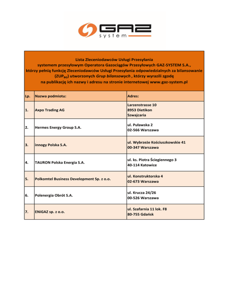 Lista Zleceniodawców Usługi Przesyłania systemem przesyłowym Operatora Gazociągów Przesyłowych GAZ-SYSTEM S.A., którzy pełnią funkcję Zleceniodawców Usługi Przesyłania odpowiedzialnych za bilansowanie (ZUPBG) utworzonych Grup bilansowych , którzy wyrazili zgodę na publikację ich nazwy i adresu na stronie internetowej www.gaz-system.pl Lp. Nazwa podmiotu: Adres: 1. Axpo Trading AG Larzenstrasse 10 8953 Dietikon Szwajcaria 2. Hermes Energy Group S.A. ul. Puławska 2 02-566 Warszawa 3. innogy Polska S.A. ul. Wybrzeże Kościuszkowskie 41 00-347 Warszawa 4. TAURON Polska Energia S.A. ul. ks. Piotra Ściegiennego 3 40-114 Katowice 5. Polkomtel Business Development Sp. z o.o. ul. Konstruktorska 4 02-673 Warszawa 6. Polenergia Obrót S.A. ul. Krucza 24/26 00-526 Warszawa 7. ENiGAZ sp. z o.o. ul. Szafarnia 11 lok. F8 80-755 Gdańsk