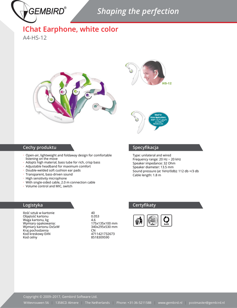 IChat Earphone, white color A4-HS-12 Cechy produktu Specyfikacja - Open-air, lightweight and foldaway design for comfortable listening on the move - Adopts high material, bass tube for rich, crisp bass - Adjustable headband for maximum comfort - Double-welded soft cushion ear pads - Transparent, bass-driven sound - High sensitivity microphone - With single-sided cable, 2.0 m connection cable - Volume control and MIC, switch Type: unilateral and wired Frequency range: 20 Hz ~ 20 kHz Speaker impedance: 32 Ohm Speaker diameter: 13.5 mm Sound pressure (at 1kHz/0db): 112 db +/3 db Cable length: 1.8 m Logistyka Certyfikaty Ilość sztuk w kartonie Objętość kartonu Waga kartonu, kg Wymiary opakowania: Wymiary kartonu DxSxW Kraj pochodzenia Kod kreskowy EAN Kod celny 40 0.053 4.6 175x135x100 mm 340x295x530 mm CN 4711421732673 8518309590 Copyright © 2009–2017, Gembird Software Ltd. ! " # $ ! "