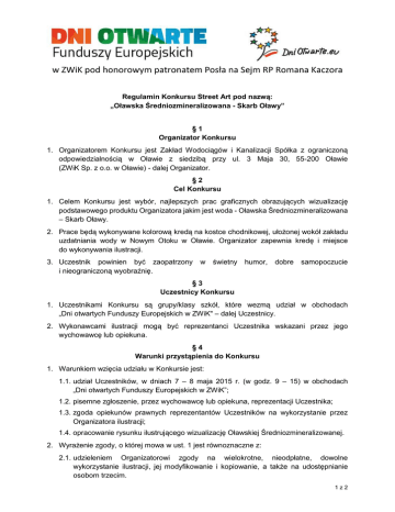 Regulamin Konkursu Street Art pod nazwą: „Oławska Średniozmineralizowana - Skarb Oławy” §1 Organizator Konkursu 1. Organizatorem Konkursu jest Zakład Wodociągów i Kanalizacji Spółka z ograniczoną odpowiedzialnością w Oławie z siedzibą przy ul. 3 Maja 30, 55-200 Oławie (ZWiK Sp. z o.o. w Oławie) - dalej Organizator. §2 Cel Konkursu 1. Celem Konkursu jest wybór, najlepszych prac graficznych obrazujących wizualizację podstawowego produktu Organizatora jakim jest woda - Oławska Średniozmineralizowana – Skarb Oławy. 2. Prace będą wykonywane kolorową kredą na kostce chodnikowej, ułożonej wokół zakładu uzdatniania wody w Nowym Otoku w Oławie. Organizator zapewnia kredę i miejsce do wykonywania ilustracji. 3. Uczestnik powinien być zaopatrzony i nieograniczoną wyobraźnię. w świetny humor, dobre samopoczucie §3 Uczestnicy Konkursu 1. Uczestnikami Konkursu są grupy/klasy szkół, które wezmą udział w obchodach „Dni otwartych Funduszy Europejskich w ZWiK" – dalej Uczestnicy. 2. Wykonawcami ilustracji mogą być reprezentanci Uczestnika wskazani przez jego wychowawcę lub opiekuna. §4 Warunki przystąpienia do Konkursu 1. Warunkiem wzięcia udziału w Konkursie jest: 1.1. udział Uczestników, w dniach 7 – 8 maja 2015 r. (w godz. 9 – 15) w obchodach „Dni otwartych Funduszy Europejskich w ZWiK”; 1.2. pisemne zgłoszenie, przez wychowawcę lub opiekuna, reprezentacji Uczestnika; 1.3. zgoda opiekunów prawnych reprezentantów Uczestników na wykorzystanie przez Organizatora ilustracji; 1.4. opracowanie rysunku ilustrującego wizualizację Oławskiej Średniozmineralizowanej. 2. Wyrażenie zgody, o której mowa w ust. 1 jest równoznaczne z: 2.1. udzieleniem Organizatorowi zgody na wielokrotne, nieodpłatne, dowolne wykorzystanie ilustracji, jej modyfikowanie i kopiowanie, a także na udostępnianie osobom trzecim. 1z2 2.2. wyrażeniem zgody na przetwarzanie danych osobowych dla potrzeb związanych z prawidłowym przebiegiem Konkursu (zgodnie z Ustawą z dn. 29.08.1997 roku o Ochronie Danych Osobowych Dz. U. Nr 133 poz.883). 2.3. zrzeczeniem się, na stałe, wszelkich praw autorskich do ilustracji oraz wszelkich wynikających z tego tytułu ewentualnych roszczeń na rzecz Organizatora. 2.4. wyrażeniem zgody na udostępnienie wizerunku Uczestników. 3. Przystąpienie do Konkursu oznacza wyrażenie zgody bez zastrzeżeń, na warunki niniejszego Regulaminu. §5 Nagrody 1. Nagrodami w Konkursie są: 1.1. nagroda pierwsza – wycieczka do Warszawy (w programie: zwiedzanie Muzeum Powstania Warszawskiego oraz Sejmu RP przy udziale Posła na Sejm RP Pana Romana Kaczora). 1.2. nagroda druga – wycieczka do Afrykarium we Wrocławskim ZOO. 1.3. nagroda trzecia - bilety do kina 3D w Ośrodku Współpracy Europejskiej ODRA, przy ul. Młyńskiej 3 w Oławie. 2. Imprezy, o których mowa w ust. 1 zostaną zorganizowane przez Organizatora Konkursu. W celu realizacji powyższego i dokonania niezbędnych rezerwacji, konieczna jest współpraca wychowawcy/opiekuna Uczestnika i powiadomienie Organizatora, w terminie do dnia 22 maja br. o preferowanych terminach wyjazdów. 3. Nagrody należy wykorzystać w terminie do dnia 30.09.2015 r. 4. Uczestnik zobowiązuje się do przekazania Organizatorowi zdjęć z udziału w wycieczkach, o których mowa w ust. 1 i wyraża zgodę na ich publikowanie przez Organizatora. §6 Zasady Konkursu 1. Ilustracje zostaną sfotografowane przez Organizatora po zakończeniu ich wykonywania przez Uczestnika. 2. Wyboru najlepszych prac dokona Komisja Konkursowa powołana przez Organizatora. 3. Od decyzji Organizatora nie przysługuje odwołanie. 4. Wyniki Konkursu zostaną opublikowane na stronie internetowej Organizatora oraz w lokalnych mediach. 5. Organizator może wprowadzić zmiany do Konkursu bez podania przyczyny. 6. Ogłoszenie oraz Regulamin niniejszego Konkursu Organizator zamieścił na swojej stronie internetowej www.zwik.olawa.pl §7 Harmonogram Konkursu 07.05.2015 r. Rozpoczęcie Konkursu 08.05.2015 r. Zakończenie opracowania ilustracji 13.05.2015 r. Wybór najlepszych prac 14-22.05.2015 r. Ogłoszenie wyników i wręczenie nagród 2z2