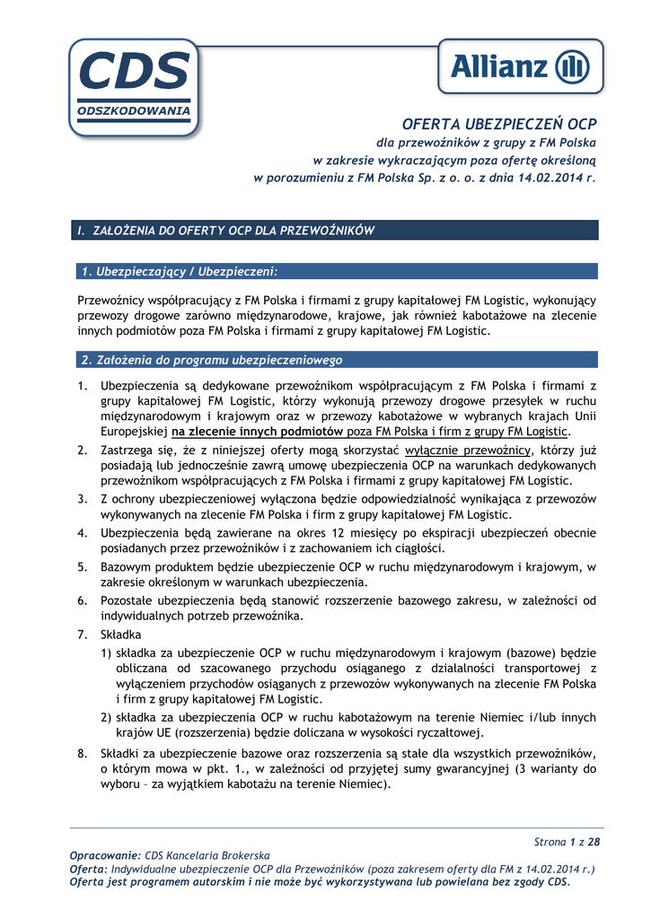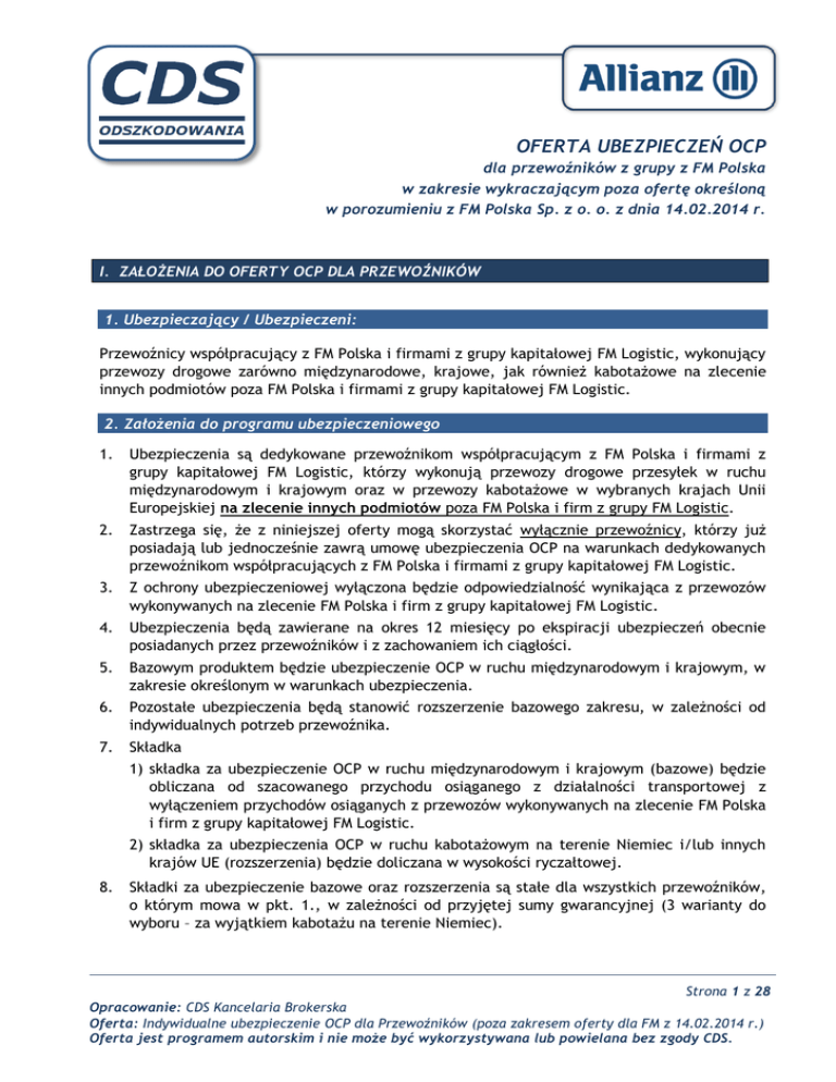 OFERTA UBEZPIECZEŃ OCP dla przewoźników z grupy z FM Polska w zakresie wykraczającym poza ofertę określoną w porozumieniu z FM Polska Sp. z o. o. z dnia 14.02.2014 r. I. ZAŁOŻENIA DO OFERTY OCP DLA PRZEWOŹNIKÓW 1. Ubezpieczający / Ubezpieczeni: Przewoźnicy współpracujący z FM Polska i firmami z grupy kapitałowej FM Logistic, wykonujący przewozy drogowe zarówno międzynarodowe, krajowe, jak również kabotażowe na zlecenie innych podmiotów poza FM Polska i firmami z grupy kapitałowej FM Logistic. 2. Założenia do programu ubezpieczeniowego 1. Ubezpieczenia są dedykowane przewoźnikom współpracującym z FM Polska i firmami z grupy kapitałowej FM Logistic, którzy wykonują przewozy drogowe przesyłek w ruchu międzynarodowym i krajowym oraz w przewozy kabotażowe w wybranych krajach Unii Europejskiej na zlecenie innych podmiotów poza FM Polska i firm z grupy FM Logistic. 2. Zastrzega się, że z niniejszej oferty mogą skorzystać wyłącznie przewoźnicy, którzy już posiadają lub jednocześnie zawrą umowę ubezpieczenia OCP na warunkach dedykowanych przewoźnikom współpracujących z FM Polska i firmami z grupy kapitałowej FM Logistic. 3. Z ochrony ubezpieczeniowej wyłączona będzie odpowiedzialność wynikająca z przewozów wykonywanych na zlecenie FM Polska i firm z grupy kapitałowej FM Logistic. 4. Ubezpieczenia będą zawierane na okres 12 miesięcy po ekspiracji ubezpieczeń obecnie posiadanych przez przewoźników i z zachowaniem ich ciągłości. 5. Bazowym produktem będzie ubezpieczenie OCP w ruchu międzynarodowym i krajowym, w zakresie określonym w warunkach ubezpieczenia. 6. Pozostałe ubezpieczenia będą stanowić rozszerzenie bazowego zakresu, w zależności od indywidualnych potrzeb przewoźnika. 7. Składka 1) składka za ubezpieczenie OCP w ruchu międzynarodowym i krajowym (bazowe) będzie obliczana od szacowanego przychodu osiąganego z działalności transportowej z wyłączeniem przychodów osiąganych z przewozów wykonywanych na zlecenie FM Polska i firm z grupy kapitałowej FM Logistic. 2) składka za ubezpieczenia OCP w ruchu kabotażowym na terenie Niemiec i/lub innych krajów UE (rozszerzenia) będzie doliczana w wysokości ryczałtowej. 8. Składki za ubezpieczenie bazowe oraz rozszerzenia są stałe dla wszystkich przewoźników, o którym mowa w pkt. 1., w zależności od przyjętej sumy gwarancyjnej (3 warianty do wyboru – za wyjątkiem kabotażu na terenie Niemiec). Strona 1 z 28 Opracowanie: CDS Kancelaria Brokerska Oferta: Indywidualne ubezpieczenie OCP dla Przewoźników (poza zakresem oferty dla FM z 14.02.2014 r.) Oferta jest programem autorskim i nie może być wykorzystywana lub powielana bez zgody CDS. OFERTA UBEZPIECZEŃ OCP dla przewoźników z grupy z FM Polska w zakresie wykraczającym poza ofertę określoną w porozumieniu z FM Polska Sp. z o. o. z dnia 14.02.2014 r. 9. Składki za ubezpieczenie bazowe oraz rozszerzenia będą stanowić składkę minimalną, która nie będzie podlegała zwrotowi. 10. Rozliczenie składki (w górę) nastąpi w terminie 20 dni po zakończeniu okresu ubezpieczenia, na podstawie informacji przekazanej przez Ubezpieczającego o rzeczywistych przychodach (bez Vat) osiągniętych w okresie ubezpieczenia. 11. W odniesieniu do przewoźników, którzy w ostatnim 12 miesięcznym okresie ubezpieczenia poprzedzającym zawarcie ubezpieczenia odnotowali szkodowość powyżej 60% lecz nie przekraczającą 90% stawka z programu podwyższona zostanie o 15%. W przypadku szkodowości przekraczającej 90% stawka ustalana będzie indywidualnie. Użyte w pkt. 9. określenie „szkodowość” oznacza: w przypadku nowej umowy ubezpieczenia zawieranej na warunkach oferty: Szkodowość – stosunek wypłaconych odszkodowań i wysokości rezerw w okresie ostatnich 12 m-cy do składki skalkulowanej według warunków oferty. w przypadku kontynuacji umowy ubezpieczenia zawartej na warunkach oferty: Szkodowość – stosunek wypłaconych odszkodowań i wysokości rezerw w okresie ostatnich 12 m-cy do składki zainkasowanej za ubezpieczenie zawarte w analogicznym okresie. 12. Składka za ubezpieczenie bazowe ulegnie zwiększeniu o składkę dodatkową, jeżeli będzie to wynikało z konieczności rozszerzenia ubezpieczenia o inne ubezpieczenia i zostanie dokonane równocześnie z zawarciem umowy ubezpieczenia bazowego lub w trakcie jej trwania. 13. W przypadku rozszerzenia zakresu ubezpieczenia o ryzyka dodatkowe w trakcie trwania umowy ubezpieczenia, zostanie naliczona składka dodatkowa; składka będzie naliczona proporcjonalnie do okresu jaki przypada od zgłoszenia do ubezpieczenia do zakończenia aktualnej polisy (liczona per dzień). 14. Składka minimalna łączna z polis zawartych w ramach programu dla przewoźników współpracujących z FM Polska i firmami z grupy kapitałowej FM Logistic zgodnie z Porozumieniem z dnia 14.02.2014 oraz z polis zawartych w ramach programu dla przewoźników współpracujących z FM Polska i firmami z grupy kapitałowej FM Logistic, którzy wykonują przewozy drogowe przesyłek w ruchu międzynarodowym i krajowym oraz przewozy kabotażowe w wybranych krajach Unii Europejskiej na zlecenie innych podmiotów poza FM Polska i firm z grupy FM Logistic nie może być niższa niż 5.000PLN. 15. Składki będą opłacane jednorazowo lub w przypadku, gdy składka łączna przekracza: 2.000 PLN – istnieje możliwość płatności w dwóch równych ratach (bez zwyżki składki) 3.000 PLN – w trzech równych ratach (bez zwyżki składki). 16. Płatność ratalna nie dotyczy składki z tytułu kabotażu, która musi być opłacona przed rozpoczęciem okresu ubezpieczenia. Strona 2 z 28 Opracowanie: CDS Kancelaria Brokerska Oferta: Indywidualne ubezpieczenie OCP dla Przewoźników (poza zakresem oferty dla FM z 14.02.2014 r.) Oferta jest programem autorskim i nie może być wykorzystywana lub powielana bez zgody CDS. OFERTA UBEZPIECZEŃ OCP dla przewoźników z grupy 