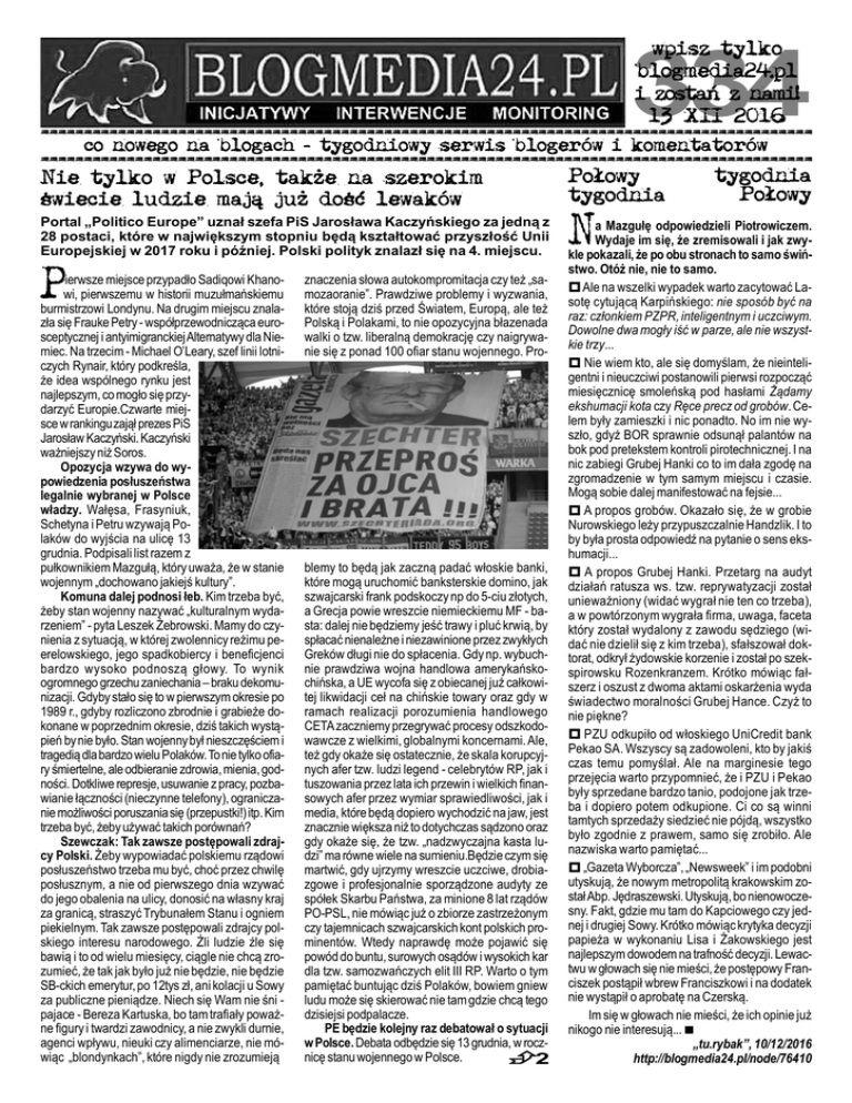 wpisz tylko blogmedia24.pl i zostañ z nami! 13 XII 2016 ========================================================================================== 334 co nowego na blogach - tygodniowy serwis blogerów i komentatorów ========================================================================================== tygodnia Po³owy Nie tylko w Polsce, tak¿e na szerokim Po³owy tygodnia œwiecie ludzie maj¹ ju¿ doœæ lewaków Portal „Politico Europe” uznał szefa PiS Jarosława Kaczyńskiego za jedną z 28 postaci, które w największym stopniu będą kształtować przyszłość Unii Europejskiej w 2017 roku i później. Polski polityk znalazł się na 4. miejscu. P ierwsze miejsce przypadło Sadiqowi Khanowi, pierwszemu w historii muzułmańskiemu burmistrzowi Londynu. Na drugim miejscu znalazła się Frauke Petry - współprzewodnicząca eurosceptycznej i antyimigranckiej Alternatywy dla Niemiec. Na trzecim - Michael O’Leary, szef linii lotniczych Rynair, który podkreśla, że idea wspólnego rynku jest najlepszym, co mogło się przydarzyć Europie.Czwarte miejsce w rankingu zajął prezes PiS Jarosław Kaczyński. Kaczyński ważniejszy niż Soros. Opozycja wzywa do wypowiedzenia posłuszeństwa legalnie wybranej w Polsce władzy. Wałęsa, Frasyniuk, Schetyna i Petru wzywają Polaków do wyjścia na ulicę 13 grudnia. Podpisali list razem z pułkownikiem Mazgułą, który uważa, że w stanie wojennym „dochowano jakiejś kultury”. Komuna dalej podnosi łeb. Kim trzeba być, żeby stan wojenny nazywać „kulturalnym wydarzeniem” - pyta Leszek Żebrowski. Mamy do czynienia z sytuacją, w której zwolennicy reżimu peerelowskiego, jego spadkobiercy i beneficjenci bardzo wysoko podnoszą głowy. To wynik ogromnego grzechu zaniechania – braku dekomunizacji. Gdyby stało się to w pierwszym okresie po 1989 r., gdyby rozliczono zbrodnie i grabieże dokonane w poprzednim okresie, dziś takich wystąpień by nie było. Stan wojenny był nieszczęściem i tragedią dla bardzo wielu Polaków. To nie tylko ofiary śmiertelne, ale odbieranie zdrowia, mienia, godności. Dotkliwe represje, usuwanie z pracy, pozbawianie łączności (nieczynne telefony), ograniczanie możliwości poruszania się (przepustki!) itp. Kim trzeba być, żeby używać takich porównań? Szewczak: Tak zawsze postępowali zdrajcy Polski. Żeby wypowiadać polskiemu rządowi posłuszeństwo trzeba mu być, choć przez chwilę posłusznym, a nie od pierwszego dnia wzywać do jego obalenia na ulicy, donosić na własny kraj za granicą, straszyć Trybunałem Stanu i ogniem piekielnym. Tak zawsze postępowali zdrajcy polskiego interesu narodowego. Źli ludzie źle się bawią i to od wielu miesięcy, ciągle nie chcą zrozumieć, że tak jak było już nie będzie, nie będzie SB-ckich emerytur, po 12tys zł, ani kolacji u Sowy za publiczne pieniądze. Niech się Wam nie śni pajace - Bereza Kartuska, bo tam trafiały poważne figury i twardzi zawodnicy, a nie zwykli durnie, agenci wpływu, nieuki czy alimenciarze, nie mówiąc „blondynkach”, które nigdy nie zrozumieją znaczenia słowa autokompromitacja czy też „samozaoranie”. Prawdziwe problemy i wyzwania, które stoją dziś przed Światem, Europą, ale też Polską i Polakami, to nie opozycyjna błazenada walki o tzw. liberalną demokrację czy naigrywanie się z ponad 100 ofiar stanu wojennego. Pro- blemy to będą jak zaczną padać włoskie banki, które mogą uruchomić banksterskie domino, jak szwajcarski frank podskoczy np do 5-ciu złotych, a Grecja powie wreszcie niemieckiemu MF - basta: dalej nie będziemy jeść trawy i pluć krwią, by spłacać nienależne i niezawinione przez zwykłych Greków długi nie do spłacenia. Gdy np. wybuchnie prawdziwa wojna handlowa amerykańskochińska, a UE wycofa się z obiecanej już całkowitej likwidacji ceł na chińskie towary oraz gdy w ramach realizacji porozumienia handlowego CETA zaczniemy przegrywać procesy odszkodowawcze z wielkimi, globalnymi koncernami. Ale, też gdy okaże się ostatecznie, że skala korupcyjnych afer tzw. ludzi legend - celebrytów RP, jak i tuszowania przez lata ich przewin i wielkich finansowych afer przez wymiar sprawiedliwości, jak i media, które będą dopiero wychodzić na jaw, jest znacznie większa niż to dotychczas sądzono oraz gdy okaże się, że tzw. „nadzwyczajna kasta ludzi” ma równe wiele na sumieniu.Będzie czym się martwić, gdy ujrzymy wreszcie uczciwe, drobiazgowe i profesjonalnie sporządzone audyty ze spółek Skarbu Państwa, za minione 8 lat rządów PO-PSL, nie mówiąc już o zbiorze zastrzeżonym czy tajemnicach szwajcarskich kont polskich prominentów. Wtedy naprawdę może pojawić się powód do buntu, surowych osądów i wysokich kar dla tzw. samozwańczych elit III RP. Warto o tym pamiętać buntując dziś Polaków, bowiem gniew ludu może się skierować nie tam gdzie chcą tego dzisiejsi podpalacze. PE będzie kolejny raz debatował o sytuacji w Polsce. Debata odbędzie się 13 grudnia, w rocznicę stanu wojennego w Polsce. 2 N a Mazgułę odpowiedzieli Piotrowiczem. Wydaje im się, że zremisowali i jak zwykle pokazali, że po obu stronach to samo świństwo. Otóż nie, nie to samo. Ale na wszelki wypadek warto zacytować Lasotę cytującą Karpińskiego: nie sposób być na raz: członkiem PZPR, inteligentnym i uczciwym. Dowolne dwa mogły iść w parze, ale nie wszystkie trzy... Nie wiem kto, ale się domyślam, że nieinteligentni i nieuczciwi postanowili pierwsi rozpocząć miesięcznicę smoleńską pod hasłami Żądamy ekshumacji kota czy Ręce precz od grobów. Celem były zamieszki i nic ponadto. No im nie wyszło, gdyż BOR sprawnie odsunął palantów na bok pod pretekstem kontroli pirotechnicznej. I na nic zabiegi Grubej Hanki co to im dała zgodę na zgromadzenie w tym samym miejscu i czasie. Mogą sobie dalej manifestować na fejsie... A propos grobów. Okazało się, że w grobie Nurowskiego leży przypuszczalnie H