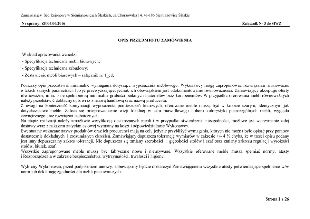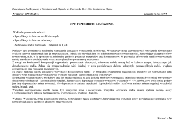 Zamawiający: Sąd Rejonowy w Siemianowicach Śląskich, ul. Chorzowska 14, 41-106 Siemianowice Śląskie Nr sprawy: ZP/04/06/2016 Załącznik Nr 3 do SIWZ OPIS PRZEDMIOTU ZAMÓWIENIA W skład opracowania wchodzi: - Specyfikacja techniczna mebli biurowych; - Specyfikacja techniczna zabudowy; - Zestawienie mebli biurowych – załącznik nr 1_cd; Poniższy opis przedstawia minimalne wymagania dotyczące wyposażenia meblowego. Wykonawcy mogą zaproponować rozwiązania równoważne o takich samych parametrach lub je przewyższające, jednak ich obowiązkiem jest udokumentowanie równoważności. Zamawiający akceptuje oferty równoważne, m.in. o ile spełnione są minimalne grubości podanych materiałów oraz komponentów. W przypadku oferowania mebli równoważnych należy przedstawić dokładny opis wraz z nazwą handlową oraz nazwą producenta. Z uwagi na konieczność kontynuacji wyposażenia pomieszczeń biurowych, oferowane meble muszą być w kolorze szarym, identycznym jak dotychczasowe meble. Zaleca się przeprowadzenie wizji lokalnej w celu prawidłowego doboru kolorystyki poszczególnych mebli, wyglądu zewnętrznego oraz rozwiązań technicznych. Na etapie realizacji należy umożliwić weryfikację dostarczanych mebli i w przypadku stwierdzenia niezgodności, możliwe jest wstrzymanie całej dostawy wraz z nakazem natychmiastowej wymiany na koszt i odpowiedzialność Wykonawcy. Ewentualne wskazane nazwy produktów oraz ich producenci mają na celu jedynie przybliżyć wymagania, których nie można było opisać przy pomocy dostatecznie dokładnych i zrozumiałych określeń. Zamawiający dopuszcza tolerancję wymiarów w zakresie +/- 4 % chyba, że w treści opisu podany jest inny dopuszczalny zakres tolerancji. Nie dopuszcza się zmiany szerokości i głębokości stołów i szaf oraz zmiany zakresu regulacji wysokości stołów, biurek, szaf. Wszystkie zaproponowane meble muszą być fabrycznie nowe i nieużywane. Wszystkie oferowane meble muszą spełniać normy, atesty i Rozporządzenia w zakresie bezpieczeństwa, wytrzymałości, trwałości i higieny. Wybrany Wykonawca, przed podpisaniem umowy, zobowiązany będzie dostarczyć Zamawiającemu wszystkie atesty potwierdzające spełnienie w/w norm lub deklarację zgodności dla mebli pracowniczych. Strona 1 z 26 Zamawiający: Sąd Rejonowy w Siemianowicach Śląskich, ul. Chorzowska 14, 41-106 Siemianowice Śląskie Nr sprawy: ZP/04/06/2016 Załącznik Nr 3 do SIWZ SPECYFIKACJA TECHNICZNA MEBLI BIUROWYCH UWAGA: w dokumentacji rysunkowej pomieszczenia 1.65 są 2 szafki opisane jako SP1 i 2 szafki opisane jako SP2 z których Zamawiający rezygnuje. W zamian za w/w szafki Zamawiający wprowadza: - biurko prostokątne o wymiarach 60 x 120 x 72 cm – 1 szt. - kontener mobilny 60 x 43 x 57,2 cm – 1 szt. - szafka uchylna 60x43x111,7 cm - 1 szt. Nr 1. Nazwa Wymiary Ilość Szafka z drzwiami przesuwnymi, o wymiarach szerokość 120/160 cm, wysokość 107,4 cm, głębokość 44,5cm. Korpus wykonany z płyty wiórowej obustronnie laminowanej o klasie higieniczności E1, obrzeże ABS dobrane pod kolor płyty. Top i front wykonany z płyty wiórowej obustronnie laminowanej o klasie higieniczności E1, wykonane z płyty wiórowej 18mm. Plecy wykonane z płyty Szafka (nadstawka) z grubości 12 mm, wpuszczane w boki i wieniec. Nie dopuszcza się pleców drzwiczkami przesuwnymi nakładanych. Top i korpus są ze sobą skręcone. Szafka posiada półki zamykanymi na klucz z 120x44,5x107,4 12 szt. konstrukcyjne wyposażone w system zapobiegający ich wypadnięciu, lub korpusem w kolorze MS slate i 160x44,5x107,4 2 szt. wyszarpnięciu z możliwością regulacji w 9 pozycjach, co 32 mm, wszystkie drzwiczkami w kolorze MP krawędzie półek oklejone obrzeżem. Głębokość półek 35 cm. Pionowy podział platinum lub równoważnym szafy. Drzwi przesuwne, z zamkiem wpuszczanym z kompletem 2 kluczy łamanych. Zamek bez rozety ozdobnej, ma idealnie przylegać do płyty. Wymagana możliwość wymiany wkładki zamka. Szafka na stelażu metalowym wykonanym z profilu metalowego o przekroju 40x20 mm, malowanym proszkowo na kolor czarny . Strona 2 z 26 Zamawiający: Sąd Rejonowy w Siemianowicach Śląskich, ul. Chorzowska 14, 41-106 Siemianowice Śląskie Nr sprawy: ZP/04/06/2016 2. Szafka z drzwiczkami przesuwnymi zamykanymi na klucz z korpusem w kolorze MS slate i drzwiczkami w kolorze MP platinum lub równoważnym Załącznik Nr 3 do SIWZ Szafka z drzwiami przesuwnymi, o wymiarach szerokość 120/160 cm, wysokość 111,7cm, głębokość 44,5cm. Korpus wykonany z płyty wiórowej obustronnie laminowanej o klasie higieniczności E1, obrzeże ABS dobrane pod kolor płyty. Top i front wykonany z płyty wiórowej obustronnie laminowanej o klasie higieniczności E1.Top, korpus, front i półki wykonane z płyty wiórowej 18mm. Plecy wykonane z płyty grubości 12 mm. Plecy wpuszczane w boki i wieniec, nie dopuszcza się pleców nakładanych. Top i korpus są ze sobą skręcone. 120x44,5x111,7 16 szt. Szafka posiada półki konstrukcyjne wyposażone w system zapobiegający ich 160x44,5x111,7 1 szt. wypadnięciu, lub wyszarpnięciu z możliwością regulacji w 9 pozycjach, co 32 mm, wszystkie krawędzie półek oklejone obrzeżem. Głębokość półek 35 cm. Pionowy podział szafy. Drzwi przesuwne, z zamkiem wpuszczanym z kompletem 2 kluczy łamanych. Zamek bez rozety ozdobnej, ma idealnie przylegać do płyty. Wymagana możliwość wymiany wkładki zamka. Szafka na stelażu metalowym wykonanym z profilu metalowego o przekroju 40x20 mm, malowanym proszkowo na kolor czarny . Strona 3 z 26 Zamawiający: Sąd Rejonowy w Siemianowicach Śląskich, ul. Chorzowska 14, 41-106 Siemianowice Śląskie Nr sprawy: ZP/04/06/2016 Załącznik Nr 3 do SIWZ Strona 4 z 26 Zamawiający: Sąd Rejonowy w Siemianowicach Śląskich, ul. Chorzowska 14, 41-106 Siemianowice Śląskie Nr sprawy: ZP/04/06/2016 3. Szafka z szufladami na kartoteki zamykana na klucz z korpusem w