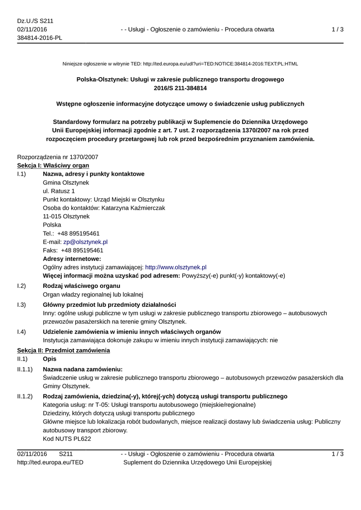 Dz.U./S S211 02/11/2016 384814-2016-PL - - Usługi - Ogłoszenie o zamówieniu - Procedura otwarta 1/3 Niniejsze ogłoszenie w witrynie TED: http://ted.europa.eu/udl?uri=TED:NOTICE:384814-2016:TEXT:PL:HTML Polska-Olsztynek: Usługi w zakresie publicznego transportu drogowego 2016/S 211-384814 Wstępne ogłoszenie informacyjne dotyczące umowy o świadczenie usług publicznych Standardowy formularz na potrzeby publikacji w Suplemencie do Dziennika Urzędowego Unii Europejskiej informacji zgodnie z art. 7 ust. 2 rozporządzenia 1370/2007 na rok przed rozpoczęciem procedury przetargowej lub rok przed bezpośrednim przyznaniem zamówienia. Rozporządzenia nr 1370/2007 Sekcja I: Właściwy organ I.1) Nazwa, adresy i punkty kontaktowe Gmina Olsztynek ul. Ratusz 1 Punkt kontaktowy: Urząd Miejski w Olsztynku Osoba do kontaktów: Katarzyna Kaźmierczak 11-015 Olsztynek Polska Tel.: +48 895195461 E-mail: [email protected] Faks: +48 895195461 Adresy internetowe: Ogólny adres instytucji zamawiającej: http://www.olsztynek.pl Więcej informacji można uzyskać pod adresem: Powyższy(-e) punkt(-y) kontaktowy(-e) I.2) Rodzaj właściwego organu Organ władzy regionalnej lub lokalnej I.3) Główny przedmiot lub przedmioty działalności Inny: ogólne usługi publiczne w tym usługi w zakresie publicznego transportu zbiorowego – autobusowych przewozów pasażerskich na terenie gminy Olsztynek. I.4) Udzielenie zamówienia w imieniu innych właściwych organów Instytucja zamawiająca dokonuje zakupu w imieniu innych instytucji zamawiających: nie Sekcja II: Przedmiot zamówienia II.1) Opis II.1.1) Nazwa nadana zamówieniu: Świadczenie usług w zakresie publicznego transportu zbiorowego – autobusowych przewozów pasażerskich dla Gminy Olsztynek. II.1.2) Rodzaj zamówienia, dziedzina(-y), której(-ych) dotyczą usługi transportu publicznego Kategoria usług: nr T-05: Usługi transportu autobusowego (miejskie/regionalne) Dziedziny, których dotyczą usługi transportu publicznego Główne miejsce lub lokalizacja robót budowlanych, miejsce realizacji dostawy lub świadczenia usług: Publiczny autobusowy transport zbiorowy. Kod NUTS PL622 02/11/2016 S211 http://ted.europa.eu/TED - - Usługi - Ogłoszenie o zamówieniu - Procedura otwarta Suplement do Dziennika Urzędowego Unii Europejskiej 1/3 Dz.U./S S211 02/11/2016 384814-2016-PL - - Usługi - Ogłoszenie o zamówieniu - Procedura otwarta 2/3 II.1.3) Krótki opis zamówienia Przedmiotem zamówienia będzie świadczenie usług w zakresie transportu zbiorowego – autobusowych przewozów. Przewozy mają za zadanie zapewnić połączenia komunikacyjne na terenie gminy Olsztynek. Zgodnie z art. 9 ust. 1 pkt 1 ustawy z 16.12.2010, o publicznym transporcie zbiorowym (tekst jednolity Dz.U. z 2015, poz. 1440, z późn. zm.) Gmina Olsztynek, licząc mniej niż 50 000 mieszkańców, nie ma obowiązku opracowywania ,,planu transportowego''. Gmina Olsztynek planuje organizowanie przewozów o charakterze użyteczności publicznej w zakresie linii komunikacyjnych albo sieci komunikacyjnych określonych przez Burmistrza, jako organu wykonującego zadania organizatora. Organizator zamierza dokonać wyboru operatora na podstawie art.19 ust. 1 pkt 1 ustawy z 16.12.2010 r. o publicznym transporcie zbiorowym w trybie ustawy z 29.1.2004 r. – Prawo zamówień publicznych (Dz.U. z 2015 r. poz. 2164, z późn, zm.) albo bezpośrednio zawrzeć umowę o świadczenie publicznych w zakresie publicznego transportu zbiorowego na podstawie art. 22 ust. 1 pkt 1–3 ustawy z 16.12.2010 r. o publicznym transporcie zbiorowym. II.1.4) Wspólny Słownik Zamówień (CPV) 60112000 II.1.5) Informacje na temat podwykonawstwa Przewidywane jest zlecenie podwykonawstwa: tak Wartość lub część zamówienia, które prawdopodobnie będzie zlecone stronom trzecim: Nieznana Krótki opis wartości/części zamówienia, które będzie zlecone podwykonawcom: Zamawiający rozważy możliwość zlecenia podwykonawcy/com transportu osób niepełnosprawnych. II.2) Ilość i/lub wartość usług: II.3) Planowana data rozpoczęcia i czas trwania zamówienia lub termin realizacji Rozpoczęcie: 1.1.2018 Okres w miesiącach: 24 (od udzielenia zamówienia) II.4) Krótki opis rodzaju i zakresu robót budowlanych Sekcja IV: Procedura IV.1) Rodzaj procedury Otwarta IV.2) Kryteria udzielenia zamówienia IV.2.1) Kryteria udzielenia zamówienia IV.2.2) Informacje na temat aukcji elektronicznej Wykorzystana będzie aukcja elektroniczna: nie IV.3) Informacje administracyjne IV.3.1) Numer referencyjny: IV.3.2) Warunki uzyskania specyfikacji i dokumentów dodatkowych Dokumenty odpłatne: nie IV.3.3) Termin składania ofert lub wniosków o dopuszczenie do udziału w postępowaniu 02/11/2016 S211 http://ted.europa.eu/TED - - Usługi - Ogłoszenie o zamówieniu - Procedura otwarta Suplement do Dziennika Urzędowego Unii Europejskiej 2/3 Dz.U./S S211 02/11/2016 384814-2016-PL - - Usługi - Ogłoszenie o zamówieniu - Procedura otwarta 3/3 30.10.2017 IV.3.4) Języki, w których można sporządzać oferty lub wnioski o dopuszczenie do udziału w postępowaniu polski. IV.3.5) Minimalny okres, w którym oferent będzie związany ofertą IV.3.6) Warunki otwarcia ofert Sekcja VI: Informacje uzupełniające VI.1) Informacje dodatkowe: Na podstawie art. 23 ust. 5 ustawy z 16.12.2010 o publicznym transporcie zbiorowym zastrzega się możliwość zmiany powyższych informacji. VI.2) Procedury odwoławcze VI.2.1) Organ odpowiedzialny za procedury odwoławcze Urząd Zamówień Publicznych ul. Postępu 17A 02-676 Warszawa Polska E-mail: [email protected] Tel.: +48 224587801 Adres internetowy: http://uzp.gov.pl Faks: +48 224587700 VI.2.2) Składanie odwołań VI.2.3) Źródło, gdzie można uzyskać informacje na temat składania odwołań VI.3) Ogłoszenie o udzieleniu zamówienia: VI.4) Data wysłania niniejszego ogłoszenia: 28.10.2016 02/11/2016 S211 http://ted.europa.eu/TED - - Usługi - Ogłoszenie o zamówieniu - Procedura 