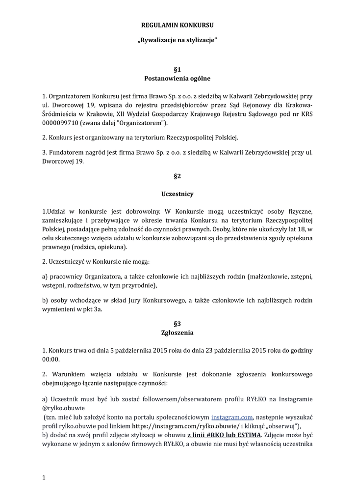 REGULAMINKONKURSU „Rywalizacjenastylizacje” §1 Postanowieniaogólne 1. Organizatorem Konkursu jest firma Brawo Sp. z o.o. z siedzibą w Kalwarii Zebrzydowskiej przy ul. Dworcowej 19, wpisana do rejestru przedsiębiorcó w przez Sąd Rejonowy dla KrakowaS' ró dmieś cia w Krakowie, XlI Wydział Gospodarczy Krajowego Rejestru Sądowego pod nr KRS 0000099710 (zwana dalej "Organizatorem"). 2. Konkurs jest organizowany na terytorium Rzeczypospolitej Polskiej. 3. Fundatorem nagró d jest firma Brawo Sp. z o.o. z siedzibą w Kalwarii Zebrzydowskiej przy ul. Dworcowej 19. §2 Uczestnicy 1.Udział w konkursie jest dobrowolny. W Konkursie mogą uczestniczyć osoby fizyczne, zamieszkujące i przebywające w okresie trwania Konkursu na terytorium Rzeczypospolitej Polskiej, posiadające pełną zdolnoś ć do czynnoś ci prawnych. Osoby, któ re nie ukoń czyły lat 18, w celu skutecznego wzięcia udziału w konkursie zobowiązani są do przedstawienia zgody opiekuna prawnego (rodzica, opiekuna). 2. Uczestniczyć w Konkursie nie mogą: a) pracownicy Organizatora, a takż e członkowie ich najbliż szych rodzin (małż onkowie, zstępni, wstępni, rodzeń stwo, w tym przyrodnie), b) osoby wchodzące w skład Jury Konkursowego, a takż e członkowie ich najbliż szych rodzin wymienieni w pkt 3a. §3 Zgłoszenia 1. Konkurs trwa od dnia 5 paź dziernika 2015 roku do dnia 23 paź dziernika 2015 roku do godziny 00:00. 2. Warunkiem wzięcia udziału w Konkursie jest dokonanie zgłoszenia konkursowego obejmującego łącznie następujące czynnoś ci: a) Uczestnik musi być lub zostać followersem/obserwatorem profilu RYŁKO na Instagramie @rylko.obuwie (tzn. mieć lub założyć konto na portalu społecznościowym instagram.com, następnie wyszukać profil rylko.obuwie pod linkiem https://instagram.com/rylko.obuwie/ i kliknąć „obserwuj”), b) dodać na swój profil zdjęcie stylizacji w obuwiu zlinii#RKOlubESTIMA. Zdjęcie może być wykonane w jednym z salonów firmowych RYŁKO, a obuwie nie musi być własnością uczestnika 1 konkursu ( w przypadku gdy zdjęcie stylizacji robione jest w jednym z salonów RYŁKO to obuwie musi zostać użyczone przez pracowników sklepu na okoliczność wykonania zdjęcia). c) do zdjęcia w opisie należy dodać hashtag (tzn. nazwa linii poprzedzona #) właściwy dla linii obuwia, z którego pochodzi fotografowany model (np. #RKO lub #ESTIMA oraz otagować (tzn. oznaczyć w treści) @rylko.obuwie. Jury wybierze 25 najbardziej interesujących i niebanalnych zdjęć stylizacji. 3. Wszystkie zgłoszenia konkursowe są zgodne z Regulaminem. Dokonanie zgłoszenia konkursowego jest ró wnoznaczne z akceptacją warunkó w zapisanych w Regulaminie. 4. Zgłoszenia będą weryfikowane przez Organizatora pod względem poprawnoś ci i zgodnoś ci z Regulaminem. 5. W przypadku naruszenia Regulaminu Organizator moż e wykluczyć uczestnika z Konkursu. Decyzja o wykluczeniu jest ostateczna. 6. Organizator samodzielnie ma prawo usunąć zgłoszenie konkursowe Uczestnika, gdy zaistnieje podejrzenie, ż e zgłoszenie to narusza prawa autorskie, bądź inne prawa osó b trzecich lub gdy jego treś ć w sposó b ewidentny nie jest związana z tematem Konkursu, jest obraź liwa lub wulgarna, bądź sprzeczna z dobrymi obyczajami. 7. Decyzja o usunięciu zgłoszenia konkursowego jest ostateczna. §4 Jury 1. Nad prawidłowym przebiegiem Konkursu czuwa, przy zachowaniu należ ytej starannoś ci, Jury Konkursowe powołane przez Organizatora. §5 Kryteria przyznania nagród 1. Laureaci Konkursu uprawnieni są do otrzymania od Organizatora Nagrody głó wnej, w postaci bonu promocyjnego o wartoś ci 300,00 (trzysta) złotych do wykorzystania wyłącznie w Sklepach wskazanych w dalszych postanowieniach Regulaminu na zakup towaró w obuwniczych marki „RYŁKO”. Nagroda (bon promocyjny) będzie miała postać wiadomoś ci e-mail, któ ra zostanie przesłana Laureatowi po uprzednim kontakcie ze strony Laureata pod adresem mailowym [email protected], w któ rym Laureat przekaż e dane osobowe niezbędne do realizacji nagrody oraz wskaż e sklep firmowy RYŁKO z załączonej listy, w któ rym deklaruje odbió r nagrody. 2. Nagroda nie moż e być wymieniona na jakiekolwiek wartoś ci pienięż ne. Bon promocyjny otrzymany od Organizatora w ramach Nagrody moż e być wykorzystany wyłącznie w celu otrzymania na zasadach niniejszego Regulaminu obuwia marki „RYŁKO” oraz innych towaró w pod marką Ryłko oferowanych w Sklepach, z wyłączeniem sklepu internetowego www.rylko.com. 3. Wraz z Nagrodą głó wną Laureat uprawniony będzie do otrzymania pienięż nej nagrody dodatkowej w wysokoś ci 33 złotych, na pokrycie podatku od wygranych w konkursach. 4. Nagrody wydaje Organizator. 5. Organizator zobowiązuje się do odprowadzenia i zapłaty należ nego podatku od Nagrody głó wnej. Laureat wyraż a zgodę na potrącenie z nagrody pienięż nej, o któ rej mowa w ust. 3 powyż ej, kwoty należ nego podatku i odprowadzenia do odpowiedniego Urzędu Skarbowego. 6. Laureat zobowiązany jest dostarczyć Organizatorowi wszelkie informacje niezbędne do 2 wypełnienia przez Organizatora wskazanego w ust. 5 obowiązku. Organizator moż e odmó wić wydania Nagrody, jeż eli Laureat nie przekaż e Organizatorowi wymaganych informacjiwterminiewskazanymprzezOrganizatora. 7. Laureatowi nie przysługuje prawo zwrotu lub wymiany Nagrody na gotó wkę ani inne wartoś cimajątkowe,niż etewskazanewRegulaminie. §6 Ogłoszeniewyników 1.RozstrzygnięcieKonkursuiogłoszeniezwycięzcynastąpi26paź dziernika2015rokudogodziny 14.00. 2. Wyniki Konkursu, nazwa profilu jakim Laureat posługuje się w serwisie INSTAGRAM oraz zwycięska praca zostanąopublikowane na oficjalnym profilu RYŁKO wserwisie Facebook oraz Instagram,nacoUczestnicywyraż ajązgodę,przystępującdoKonkursu. 2. 3. 4. 5. 6. 7. §7 Przekazanienagród 1. WarunkiemodebranianagrodyjestwysłanieprzezLaureata,wterminie7dnioddnia opublikowani