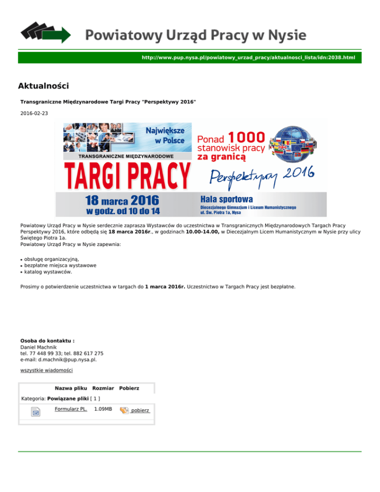 http://www.pup.nysa.pl/powiatowy_urzad_pracy/aktualnosci_lista/idn:2038.html Aktualności Transgraniczne Międzynarodowe Targi Pracy "Perspektywy 2016" 2016-02-23 Powiatowy Urząd Pracy w Nysie serdecznie zaprasza Wystawców do uczestnictwa w Transgranicznych Międzynarodowych Targach Pracy Perspektywy 2016, które odbędą się 18 marca 2016r., w godzinach 10.00-14.00, w Diecezjalnym Licem Humanistycznym w Nysie przy ulicy Świętego Piotra 1a. Powiatowy Urząd Pracy w Nysie zapewnia: ● ● ● obsługę organizacyjną, bezpłatne miejsca wystawowe katalog wystawców. Prosimy o potwierdzenie uczestnictwa w targach do 1 marca 2016r. Uczestnictwo w Targach Pracy jest bezpłatne. Formularz zgłoszeniowy potwierdzający uczestnictwo w Targach Pracy. Osoba do kontaktu : Daniel Machnik tel. 77 448 99 33; tel. 882 617 275 e-mail: [email protected]. wszystkie wiadomości Nazwa pliku Rozmiar Pobierz Kategoria: Powiązane pliki [ 1 ] Formularz PL. 1.09MB pobierz