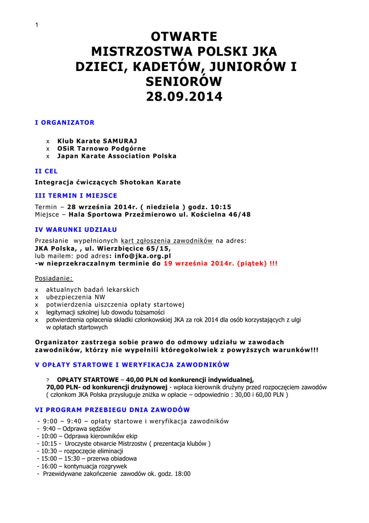 1 OTWARTE MISTRZOSTWA POLSKI JKA DZIECI, KADETÓW, JUNIORÓW I SENIORÓW 28.09.2014 I O RG ANI ZA TO R x x x K lu b K ar a te S AM UR AJ OS iR T a rn o wo P o d g ór n e Japa n K a ra te Ass oc i atio n P ols ka II C EL In teg r ac j a ć w iczą cy c h S h o to kan K ar ate II I T ER M I N I MI E J S CE Te r mi n – 28 wrz eś n i a 2 01 4r. ( ni e dz iela ) g o dz . 1 0 :1 5 Mie js ce – Ha la S p o r towa P rz eź mi ero w o u l. K ośc i eln a 46 /4 8 IV WA RUNK I UD Z IA ŁU P r ze s ł a nie w y pe ł nio ny ch kar t z gł o sze n ia z aw od nik ów na adre s : JK A P o ls ka, , ul . Wi erz bi ęc ic e 65 / 1 5, lu b ma i le m: p od adr e s : i nf o @ jka.o rg .p l -w n ie p rz ek rac z al ny m ter mi n ie do 19 w r ześ ni a 20 14r . ( p ią te k) !! ! Pos iada nie : x x x x x akt ualn ych ba da ń le ka r s kic h ube z p ie cze nia NW potw ie r dze nia ui s zcze nia o płat y s ta r tow e j legitymacji szkolnej lub dowodu tożsamości potwierdzenia opłacenia składki członkowskiej JKA za rok 2014 dla osób korzystających z ulgi w opłatach startowych O rg a niz a to r zas trz eg a s o bie pra w o d o o d mo wy ud ział u w z a wo d a c h zaw od n ikó w , któ rz y ni e w yp eł n ili k tór e g ok o lw ie k z p o wyższ yc h war u n kó w !!! V OP ŁAT Y S T AR T OW E I WE RY F IK ACJA Z AW OD N IK Ó W OPŁATY STARTOWE – 40,00 PLN od konkurencji indywidualnej, 70,00 PLN- od konkurencji drużynowej - wpłaca kierownik drużyny przed rozpoczęciem zawodów ( członkom JKA Polska przysługuje zniżka w opłacie – odpowiednio : 30,00 i 60,00 PLN ) ? VI P RO G RA M P RZE BI E G U D NI A Z A WO D Ó W - 9: 00 – 9: 40 – opł a ty s tar tow e i w e r y f ika cja z aw o dnik ów - 9:40 – Odprawa sędziów - 10:00 – Odprawa kierowników ekip - 10:15 - Uroczyste otwarcie Mistrzostw ( prezentacja klubów ) - 10:30 – rozpoczęcie eliminacji - 15:00 – 15:30 – przerwa obiadowa - 16:00 – kontynuacja rozgrywek - Przewidywane zakończenie zawodów ok. godz. 18:00 2 VI I S P OS ÓB P RZ E P RO WAD ZE NI A ZA WOD ÓW Wg przepisów JKA. ( dostępne na stronie : WWW.jka.org.pl ) KONKURENCJE - IV Mistrzostwa Polski JKA Kadetów, Juniorów i Seniorów: ? Kata ind. kobiet : 16 – 20 lat, + 21 lat ? Kata ind. mężczyzn : 16 – 20 lat, + 21 lat ? Kata drużynowe kobiet: 16 – 20 lat, + 21 lat ? Kata drużynowe mężczyzn: 16 – 20 lat, + 21 lat ? Kumite ind. kobiet: 16 – 17 lat, 18 – 20 lat, + 21 lat ? Kumite ind. mężczyzn: 16 – 17 lat, 18 – 20 lat, + 21 lat ? Kumite drużyn. kobiet: 18 – 20 lat, + 21 lat ? Kumite drużyn. mężczyzn: 18 – 20 lat, + 21 lat KONKURENCJE – MP JKA Dzieci: ? Kata ind. dziewcząt : 8 – 10 lat, 11 – 12 lat, 13 – 15 lat ? Kata ind. chłopców : 8 – 10 lat, 11 – 12 lat, 13 – 15 lat ? Kata drużynowe dziewcząt: 8 – 12 lat, 13 – 15 lat, ? Kata drużynowe chłopców: 8 – 12 lat, 13 – 15 lat, ? Kumite ind. dziewcząt: 9 – 11 lat Kihon-Ippon-Kumite, 12 – 13 lat Jyu-Ippon-Kumite, 14 -15 lat Jyu-Kumite ? Kumite ind. chłopców: 9 – 11 lat Kihon-Ippon-Kumite, 12 – 13 lat Jyu-Ippon-Kumite, 14 -15 lat Jyu-Kumite W kumite obowiązują białe napięstniki, protektory na zęby! INFORMACJE DODATKOWE - ? w konkurencjach ind. kata startujący do 12 roku życia zobowiązani są znać ( Shitei Kata !!! – losowane przez sędziego ) kata Heian 1-5, w finałach Tokui Kata ? w konkurencjach ind. kata kategoria 13-15lat startujący zobowiązani są znać ( Shitei Kata !!! – losowane przez sędziego) kata Heian 1-5 i Tekki Shodan, w finałach Tokui Kata z wyjątkiem kata podstawowych (kata Heian) ? w konkurencjach ind. kata, w wyższych kategoriach wiekowych; wg przepisów JKA eliminacje; Heian 1-5 oraz Tekki Shod an półfinały; kata średniozaawansowane ( Sentei Kata ) do wyboru z listy: Bassai-Dai, Kanku-Dai, Jion, Empi - finały; ulubione kata ( Tokui Kata ) z wyjątkiem podstawowych - ? w konkurencjach drużynowych kata należy przygotować minimum 2 kata; w rundzie finałowej należy zaprezentować inne kata niż w eliminacjach 3 ? konkurencje kumite 9 – 11 lat – Kihon-Ippon-Kumite; - trzy zapowiedziane ataki; zuki-jodan, zuki-chudan, mae-geri (morote- gedan-barai ) - finał; Jyu-Ippon-Kumite; trzy zapowiedziane ataki; zuki-jodan, zuki-chudan, mae-geri (kamae-te ) ? kumite 12-13 lat i; Jiyu-Ippon-Kumite Zuki-Jodan /Zuki-Chudan/ Mae-Geri-Chudan / Mawashi-Geri-Jodan Obrona: dowolny timing i kontratak ? Organizator zastrzega sobie prawo odwołania lub połączenia konkurencji w przypadku małej ilości zawodników ? Obowiązek ubezpieczenia zawodników spoczywa na klubie macierzystym ? Za zachowanie zawodników lub wyrządzone przez nich szkody odpowiada opiekun ekipy ? Podczas zawodów czynny będzie bufet ? W trakcie zawodów czynne będzie stoisko z akcesoriami karate VI I I N AG R OD Y me dale , d yp lo m y, pu char y x INFORMACJE : ( Mariusz Jewdokimow tel. kom. 0609-709-636 ) ( Gerard Sobkowiak tel. kom. 0607-355-132 ) IX NOCLEG I POSIŁEK ? ? ? Istnieje możliwość noclegu w dojo, które znajduje się w tym samym budynku w którym odbywać się będą zawody w cenie 10 zł za noc W bufecie będzie można zamówić obiad w cenie ok. 20 zł Prosimy o dodanie w formularzu zgłoszeniowym informacji o chęci skorzystania z noclegu w dojo lub obiadu w dzień zawodów. Uwaga: Kierownicy i trenerzy proszeni są o przybycie na godzinę 9.00 !!! przed rozpoczęciem zawodów celem potwierdzenia list startowych oraz wniesienia opłat startowych. Wpłaty będą przyjmowane: do godz. 9:40 - celem punktualnego rozpoczęcia zawodów.