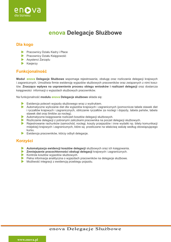 enova Delegacje Służbowe Dla kogo Pracownicy Działu Kadry i Płace Pracownicy Działu Księgowość Asystenci Zarządu Kasjerzy Funkcjonalność Moduł enova Delegacje Służbowe wspomaga rejestrowanie, obsługę oraz rozliczanie delegacji krajowych i zagranicznych. Umożliwia firmie ewidencję wyjazdów służbowych pracowników oraz związanych z nimi kosztów. Znacząco wpływa na usprawnienie procesu obiegu wniosków i rozliczeń delegacji oraz dostarcza księgowości informacji o wyjazdach służbowych pracowników. Na funkcjonalność modułu enova Delegacje służbowe składa się: Ewidencja poleceń wyjazdu służbowego wraz z wydrukiem. Automatyczne wyliczanie diet dla wyjazdów krajowych i zagranicznych (pomocnicze tabele stawek diet i ryczałtów krajowych i zagranicznych, obliczanie ryczałtów za noclegi i dojazdy, tabela państw, tabela stawek diet oraz limitów za nocleg). Automatyczne księgowanie rozliczeń kosztów delegacji służbowych. Rozliczanie delegacji z pobranymi zaliczkami pracownika na poczet delegacji służbowych. Rejestrowanie rachunków (samochód, noclegi, koszty przejazdów i inne wydatki np. bilety komunikacji miejskiej) krajowych i zagranicznych, które są przeliczane na właściwą walutę według obowiązującego kursu. Ewidencja pracowników, którzy odbyli delegacje. Korzyści Automatyzacja ewidencji kosztów delegacji służbowych oraz ich księgowania. Zmniejszenie pracochłonności obsługi delegacji krajowych i zagranicznych. Kontrola kosztów wyjazdów służbowych. Pełna informacja analityczna o wyjazdach pracowników na delegacje służbowe. Możliwość integracji z ewidencją przebiegu pojazdu. enova Delegacje Służbowe www.enova.pl