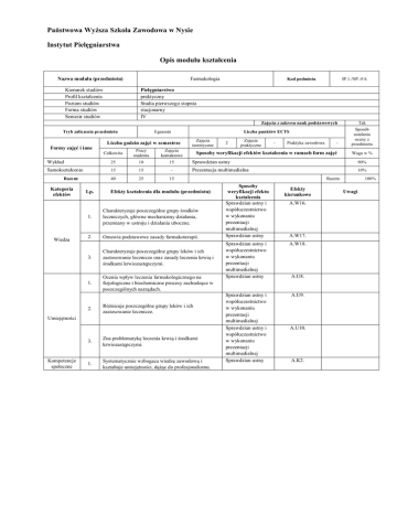 Państwowa Wyższa Szkoła Zawodowa w Nysie Instytut Pielęgniarstwa Opis modułu kształcenia Nazwa modułu (przedmiotu) Kierunek studiów Profil kształcenia Poziom studiów Forma studiów Semestr studiów Farmakologia Kod podmiotu IP.1./NP.-FA Pielęgniarstwo praktyczny Studia pierwszego stopnia stacjonarny IV Zajęcia z zakresu nauk podstawowych Tryb zaliczenia przedmiotu Formy zajęć i inne Całkowita Pracy studenta Zajęcia kontaktowe Wykład 25 10 15 Samokształcenie 15 15 - 40 25 15 Razem: Kategoria efektów Wiedza Lp. - Sposoby weryfikacji efektów kształcenia w ramach form zajęć Waga w % Liczba punktów ECTS Egzamin Liczba godzin zajęć w semestrze Zajęcia teoretyczne Zajęcia praktyczne - Praktyka zawodowa 90% Prezentacja multimedialna Efekty kształcenia dla modułu (przedmiotu) 1. 2. Omawia podstawowe zasady farmakoterapii. 3. Charakteryzuje poszczególne grupy leków i ich zastosowanie lecznicze oraz zasady leczenia krwią i środkami krwiozastępczymi. 1. Ocenia wpływ leczenia farmakologicznego na fizjologiczne i biochemiczne procesy zachodzące w poszczególnych narządach. Różnicuje poszczególne grupy leków i ich zastosowanie lecznicze. Umiejętności Kompetencje społeczne 2 Sprawdzian ustny Charakteryzuje poszczególne grupy środków leczniczych, główne mechanizmy działania, przemiany w ustroju i działania uboczne. 2. Tak Sposób ustalania oceny z przedmiotu 3. Zna problematykę leczenia krwią i środkami krwiozastępczymi. 1. Systematycznie wzbogaca wiedzę zawodową i kształtuje umiejętności, dążąc do profesjonalizmu. 10% Razem Sposoby weryfikacji efektu kształcenia Sprawdzian ustny i współuczestnictwo w wykonaniu prezentacji multimedialnej Sprawdzian ustny Efekty kierunkowe A.W16. A.W17. Sprawdzian ustny i współuczestnictwo w wykonaniu prezentacji multimedialnej Sprawdzian ustny A.W18. Sprawdzian ustny i współuczestnictwo w wykonaniu prezentacji multimedialnej Sprawdzian ustny i współuczestnictwo w wykonaniu prezentacji multimedialnej Sprawdzian ustny A.U9. A.U8. A.U10. A.K2. 100% Uwagi Prowadzący Forma zajęć Prowadzący zajęcia (tytuł/stopień naukowy, imię i nazwisko) Wykład Samokształcenie Prof. dr hab. n. med. Andrzej Brodziak Prof. dr hab. n. med. Andrzej Brodziak Treści kształcenia Wykład Lp. Metody dydaktyczne Tematyka zajęć 1. Leki naczyniowe. 2. 3. 4. Leki przeciwmiażdżycowe. Doustne leki przeciwcukrzycowe. Leki przeciwuczuleniowe. 5. 6. Farmakoterapia w osteopatii. Chemioterapia nowotworów. 7. Leki immunotropowe. 8. Postępowanie w przypadku ostrych zatruć lekami. Wykład z wykorzystaniem technik multimedialnych Tematyczne efekty kształcenia W wyniku kształcenia student: - opisze działanie leków stosowanych w leczeniu schorzeń naczyniowych. - zna działanie leków stosowanych w leczeniu miażdżycy. - wymieni grupy leków stosowanych w leczeniu cukrzycy. - zna leki przeciwuczuleniowe, - wyjaśni sposoby stosowania leków przeciwuczuleniowych. - zna leki stosowane w osteopatii. - omówi podział leków stosowanych w chemioterapii, - wymieni działania uboczne leków chemioterapeutycznych. - opisze działanie leków immunostymulujących, - wyjaśni znaczenie surowic i szczepionek w lecznictwie, - zna leki immunosupresyjne. - omówi leki stosowane do usuwania trucizn, - omówi problemy leczenia ogólnego w zatruciach, - wyjaśni postępowanie w zatruciach spowodowanych najczęściej zażywanymi środkami. Razem liczba godzin: Samokształcenie Lp. Metody dydaktyczne Tematyka zajęć 1. Leki stosowane w niedokrwistościach. 2. Leki stosowane w leczeniu padaczki. 3. Leki stosowane w leczeniu parkinsonizmu. Liczba godzin 2 2 2 1 2 2 2 2 15 Prezentacja multimedialna Tematyczne efekty kształcenia W wyniku kształcenia student: - omówi rodzajów niedokrwistości, - scharakteryzuje leki stosowane w terapii niedokrwistości. - określi zasady leczenia padaczki, - omówi zastosowanie leków przeciwpadaczkowych. - określi zasady leczenia parkinsonizmu, - opisze leki stosowane w terapii parkinsonizmu. Razem liczba godzin: 15 Literatura podstawowa: 1. 2. 3. 4. Farmakologia: podstawy farmakoterapii : podręcznik dla studentów medycyny i lekarzy / red. Wojciech Kostowski, Zbigniew S. Herman. - Wyd. 3 popr. i uzup., dodr Farmakologia : podstawy farmakoterapii : podręcznik dla studentów medycyny i lekarzy. T. 1 / red. Wojciech Kostowski, Zbigniew S. Herman; Lucyna Antkiewicz-Michaluk [et al.]. - Warszawa : Wydaw. Lekarskie PZWL, cop. 2005. Farmakologia: podstawy farmakoterapii : podręcznik dla studentów medycyny i lekarzy / red. Wojciech Kostowski, Zbigniew S. Herman. - Wyd. 3 popr. i uzup., dodr Farmakologia : podstawy farmakoterapii : podręcznik dla studentów medycyny i lekarzy. T. 2 / red. Wojciech Kostowski, Zbigniew S. Herman; Helena Baran-Furga [et al.]. - Warszawa : Wydaw. Lekarskie PZWL, cop. 2005. Farmakologia : podręcznik dla studentów i absolwentów wydziałów pielęgniarstwa i nauk o zdrowiu akademii medycznych / red. Grażyna Rajtar-Cynke; Stanisław Czuczwar [et al.]. - Lublin : Czelej, 2002. Farmakologia: podręcznik dla studentów pielęgniarstwa, kompendium dla studentów wydziałów lekarskich i farmaceutów / red. Zbigniew S. Herman, Krystyna Kmieciak-Kołada; Mariusz Adamek [et al.]. - Wyd. 2 zm. i rozsz. - Katowice : Śląska Akademia Medyczna, cop. 2001. Literatura uzupełniająca: 1. 2. Bakterie, antybiotyki, lekooporność / Zdzisław Markiewicz, Zbigniew A. Kwiatkowski; rozdz. 6 oprac. Jadwiga Baj. Warszawa : Wydaw. Naukowe PWN, 2001. Farmakologia: podstawy farmakoterapii : podręcznik dla studentów medycyny i lekarzy / red. Wojciech Kostowski; Lucyna Antkiewicz-Michaluk [et al.]. - Wyd. 2 popr. - Warszawa : Wydaw. Lekarskie PZWL, cop. 2001. ............................................................ ………………………………… Koordynator modułu (przedmiotu) Dyrektor Instytutu podpis pieczęć i podpis