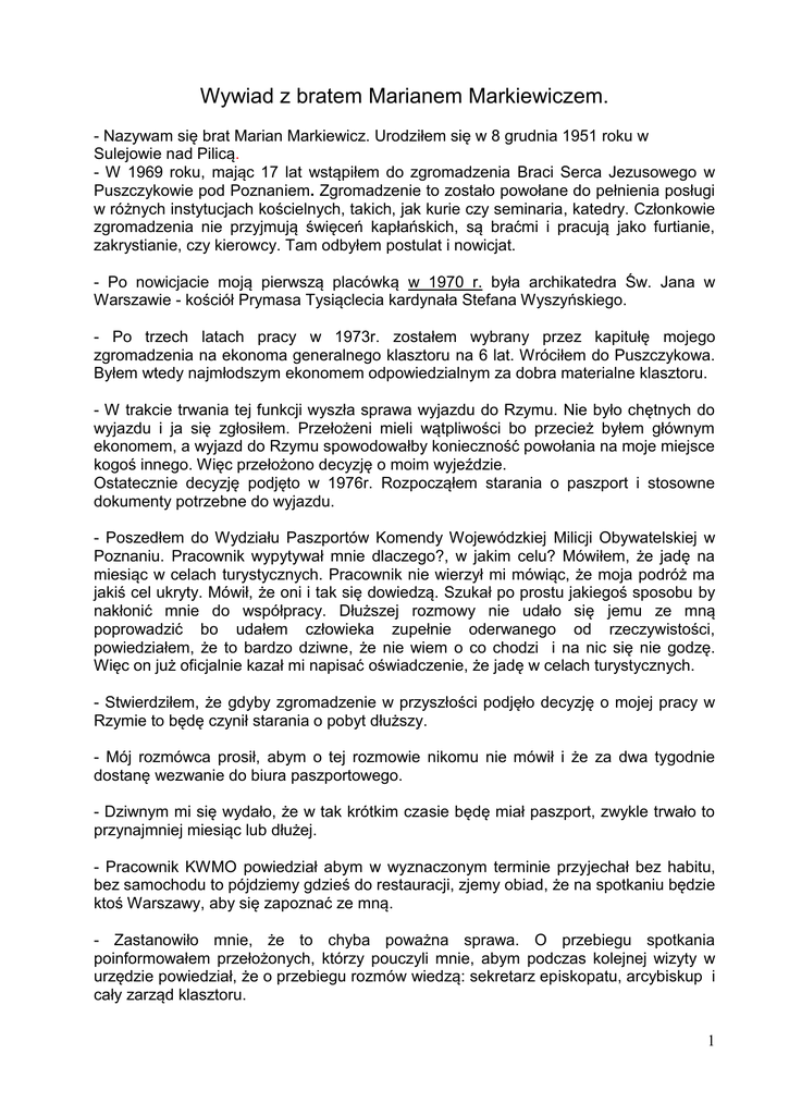 Wywiad z bratem Marianem Markiewiczem. - Nazywam się brat Marian Markiewicz. Urodziłem się w 8 grudnia 1951 roku w Sulejowie nad Pilicą. - W 1969 roku, mając 17 lat wstąpiłem do zgromadzenia Braci Serca Jezusowego w Puszczykowie pod Poznaniem. Zgromadzenie to zostało powołane do pełnienia posługi w różnych instytucjach kościelnych, takich, jak kurie czy seminaria, katedry. Członkowie zgromadzenia nie przyjmują święceń kapłańskich, są braćmi i pracują jako furtianie, zakrystianie, czy kierowcy. Tam odbyłem postulat i nowicjat. - Po nowicjacie moją pierwszą placówką w 1970 r. była archikatedra Św. Jana w Warszawie - kościół Prymasa Tysiąclecia kardynała Stefana Wyszyńskiego. - Po trzech latach pracy w 1973r. zostałem wybrany przez kapitułę mojego zgromadzenia na ekonoma generalnego klasztoru na 6 lat. Wróciłem do Puszczykowa. Byłem wtedy najmłodszym ekonomem odpowiedzialnym za dobra materialne klasztoru. - W trakcie trwania tej funkcji wyszła sprawa wyjazdu do Rzymu. Nie było chętnych do wyjazdu i ja się zgłosiłem. Przełożeni mieli wątpliwości bo przecież byłem głównym ekonomem, a wyjazd do Rzymu spowodowałby konieczność powołania na moje miejsce kogoś innego. Więc przełożono decyzję o moim wyjeździe. Ostatecznie decyzję podjęto w 1976r. Rozpocząłem starania o paszport i stosowne dokumenty potrzebne do wyjazdu. - Poszedłem do Wydziału Paszportów Komendy Wojewódzkiej Milicji Obywatelskiej w Poznaniu. Pracownik wypytywał mnie dlaczego?, w jakim celu? Mówiłem, że jadę na miesiąc w celach turystycznych. Pracownik nie wierzył mi mówiąc, że moja podróż ma jakiś cel ukryty. Mówił, że oni i tak się dowiedzą. Szukał po prostu jakiegoś sposobu by nakłonić mnie do współpracy. Dłuższej rozmowy nie udało się jemu ze mną poprowadzić bo udałem człowieka zupełnie oderwanego od rzeczywistości, powiedziałem, że to bardzo dziwne, że nie wiem o co chodzi i na nic się nie godzę. Więc on już oficjalnie kazał mi napisać oświadczenie, że jadę w celach turystycznych. - Stwierdziłem, że gdyby zgromadzenie w przyszłości podjęło decyzję o mojej pracy w Rzymie to będę czynił starania o pobyt dłuższy. - Mój rozmówca prosił, abym o tej rozmowie nikomu nie mówił i że za dwa tygodnie dostanę wezwanie do biura paszportowego. - Dziwnym mi się wydało, że w tak krótkim czasie będę miał paszport, zwykle trwało to przynajmniej miesiąc lub dłużej. - Pracownik KWMO powiedział abym w wyznaczonym terminie przyjechał bez habitu, bez samochodu to pójdziemy gdzieś do restauracji, zjemy obiad, że na spotkaniu będzie ktoś Warszawy, aby się zapoznać ze mną. - Zastanowiło mnie, że to chyba poważna sprawa. O przebiegu spotkania poinformowałem przełożonych, którzy pouczyli mnie, abym podczas kolejnej wizyty w urzędzie powiedział, że o przebiegu rozmów wiedzą: sekretarz episkopatu, arcybiskup i cały zarząd klasztoru. 1 - W wyznaczonym terminie pojechałem w habicie, pojechałem samochodem. Kiedy wszedłem i pracownik mnie zobaczył zauważyłem, że się zdenerwował i zapytał czy koś wie o naszej rozmowie. Odpowiedziałem, że wiedzą moi przełożeni. Poirytował się, że nie zachowałem tajemnicy. Stwierdziłem, że w jakieś dziwne gry nie będę się wdawał, a on: „zrobiliście świństwo, nie dostaniecie paszportu”. Odpowiedziałem: to trudno ja nie muszę jechać. - Trzymali mnie tam ze trzy godziny. Jedni wchodzili do tego gabinetu, z którego ja wyszedłem, inni wychodzili, przyglądali mi się. No i potem wołają mnie. Mówią: „pomimo, że zrobiliście świństwo – pojedziecie”, ale gdyby ode mnie ktoś Pana pozdrowił, czy Pan będzie z nim rozmawiał jak Pan tam będzie za granicą”. Odpowiedziałem, że owszem podziękuję za pozdrowienia i tak skończy się nasza rozmowa. - Oczywiście za następne dwa tygodnie albo jeszcze tego samego dnia, nie pamiętam, dostałem paszport już bez żadnych problemów, turystyczny, jednorazowy (tam i z powrotem). Po utracie ważności paszportu złożyłem wniosek w ambasadzie w Rzymie o wydanie paszportu na wielokrotne przekraczanie granicy. W piśmie nadmieniłem tak, jak we wniosku w Polsce o możliwości pracy i wydłużeniu pobytu we Włoszech. Rzeczywiście byłem w Rzymie ok. 3 lat i dopiero mogłem przyjechać na urlop. Wydanie paszportu trwało długo, ale w końcu dostałem, z możliwością wielokrotnego przekraczania granicy. Odebrałem go w ambasadzie tak jak i wiele innych pism odbierałem, ponieważ pracowałem w Papieskim Kolegium Polskim i zwykle mnie posyłano po odbiór pism z ambasady polskiej. - Do Rzymu wyjechałem 21 stycznia 1977r. Tam byłem w Papieskim Kolegium Polskim na Awentynie, gdzie mieszkają księża studenci z Polski przez prawie 6 lat. - Przez cały czas pobytu w Rzymie nikt się do mnie nie zgłaszał z „pozdrowieniami”. W 1981r., tuż przed stanem wojennym, po raz pierwszy przyjechałem na urlop do Polski. Do Włoch wróciłem ostatnim „samolotem wolności” w przeddzień wprowadzenia stanu wojennego. Bez żadnych przeszkód, kontroli, żadnego grzebania w torbie. Na drugi dzień rano otwieram radio Warszawa, a tu tylko muzyka. Potem dowiaduję się z dziennika włoskiego, że w Polsce jest stan wojenny. Stacje włoskie pokazywały ile czołgów na stronie ruskiej, ile na niemieckiej, ile na czeskiej stoi, w kraju wojsko na ulicach w gotowości bojowej, okręty na Morzu Bałtyckim. To było straszne. Wszyscy w Kolegium pytali mnie o sytuację w Polsce, bo przecież w przeddzień stanu wojennego przyleciałem z Polski. Mówiłem, że nic nie wskazywało na to, że ma być wojna. Zastanowiło mnie, dlaczego bez żadnych problemów, bez szczegółowej kontroli, wypuszczono mnie z Polski. Wszyscy nam serdecznie współczuli, że tam wojna, że taka tragedia… - W roku 1981r. nastąpił splot różnych wydarzeń, zbieg różnych okoliczności był bardzo znaczą