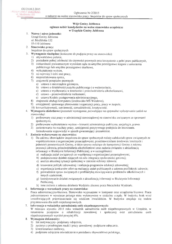 l. 2. 3. 4. Wójt Gminy Jablonna oglasza nabór l,andydlltów na wolne stanowisko ur'Lędnicze w Urzędzie Gminy Jabłonna Nazwa i adres jednostki: Urząd Gminy Jabłonna ul. Modlińska 152 05-110 JabJonna Stanowisko pracy: Inspektor do spraw społeczn yc h Wymagania niezbędne (konieczne do podjęcia pracy na stanowisku):