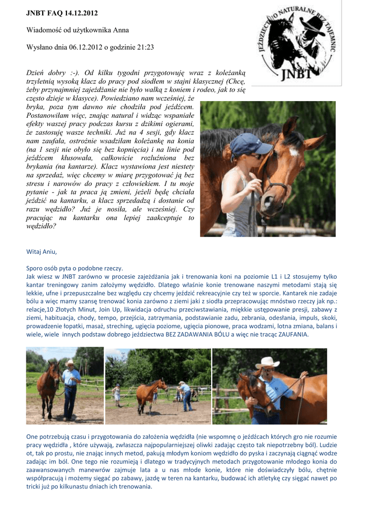 JNBT FAQ 14.12.2012 Wiadomość od użytkownika Anna Wysłano dnia 06.12.2012 o godzinie 21:23 Dzień dobry :-). Od kilku tygodni przygotowuję wraz z koleżanką trzyletnią wysoką klacz do pracy pod siodłem w stajni klasycznej (Chcę, żeby przynajmniej zajeżdżanie nie było walką z koniem i rodeo, jak to się często dzieje w klasyce). Powiedziano nam wcześniej, że bryka, poza tym dawno nie chodziła pod jeźdźcem. Postanowiłam więc, znając natural i widząc wspaniałe efekty waszej pracy podczas kursu z dzikimi ogierami, że zastosuję wasze techniki. Już na 4 sesji, gdy klacz nam zaufała, ostrożnie wsadziłam koleżankę na konia (na 1 sesji nie obyło się bez kopnięcia) i na linie pod jeźdźcem kłusowała, całkowicie rozluźniona bez brykania (na kantarze). Klacz wystawiona jest niestety na sprzedaż, więc chcemy w miarę przygotować ją bez stresu i narowów do pracy z człowiekiem. I tu moje pytanie - jak ta praca ją zmieni, jeżeli będę chciała jeździć na kantarku, a klacz sprzedadzą i dostanie od razu wędzidło? Już je nosiła, ale wcześniej. Czy pracując na kantarku ona lepiej zaakceptuje to wędzidło? Witaj Aniu, Sporo osób pyta o podobne rzeczy. Jak wiesz w JNBT zarówno w procesie zajeżdżania jak i trenowania koni na poziomie L1 i L2 stosujemy tylko kantar treningowy zanim założymy wędzidło. Dlatego właśnie konie trenowane naszymi metodami stają się lekkie, ufne i przepuszczalne bez względu czy chcemy jeździć rekreacyjnie czy też w sporcie. Kantarek nie zadaje bólu a więc mamy szansę trenować konia zarówno z ziemi jaki z siodła przepracowując mnóstwo rzeczy jak np.: relacje,10 Złotych Minut, Join Up, likwidacja odruchu przeciwstawiania, miękkie ustępowanie presji, zabawy z ziemi, habituacja, chody, tempo, przejścia, zatrzymania, podstawianie zadu, zebrania, odesłania, impuls, skoki, prowadzenie łopatki, masaż, streching, ugięcia poziome, ugięcia pionowe, praca wodzami, lotna zmiana, balans i wiele, wiele innych podstaw dobrego jeździectwa BEZ ZADAWANIA BÓLU a więc nie tracąc ZAUFANIA. One potrzebują czasu i przygotowania do założenia wędzidła (nie wspomnę o jeźdźcach których gro nie rozumie pracy wędzidła , które używają, zwłaszcza najpopularniejszej oliwki zadając często tak niepotrzebny ból). Ludzie ot, tak po prostu, nie znając innych metod, pakują młodym koniom wędzidło do pyska i zaczynają ciągnąć wodze zadając im ból. One tego nie rozumieją i dlatego w tradycyjnych metodach przygotowanie młodego konia do zaawansowanych manewrów zajmuje lata a u nas młode konie, które nie doświadczyły bólu, chętnie współpracują i możemy sięgać po zabawy, jazdę w teren na kantarku, budować ich atletykę czy sięgać nawet po tricki już po kilkunastu dniach ich trenowania. Dlatego też konie które trafiają do nas do korekty musimy najpierw odbudować w zaufaniu, wrócić do pracy na kantarku zanim z powrotem założymy wędzidło jako narzędzie do tzw „refinement” tj subtelnej komunikacji do zaawansowanego treningu. Nasi studenci dopiero na Level 3 dowiadują się niuansów o kiełznach i zaczynają być świadomi ich działania. Przygotowanie jeźdźca i konia do pracy z wędzidłem i wodzy trzymanej w 2 paluszkach z napięciem 50 gram a nie 50 kg jak często widzę, przyspiesza znakomicie rozwój takiej pary utrzymując pomimo coraz większych wymagań wobec konia prawidłowe relacje z modelu JNBT. Dlatego też przyjmujemy do zajeżdżania, treningu lub korekty konie głównie słuchaczy JNBT lub osób, które zadeklarują swój udział w szkoleniu w JNBT. Dlaczego? Bo niewyszkoleni jeźdźcy, którzy nie wiedzą jak wszechstronne zastosowanie ma kantar szkoleniowy i jak lekko przejść na używanie wędzidła, z lekkich, ufnych, dobrze skomunikowanych, przepuszczalnych wierzchowców mogą dość łatwo wytrenować konia z jednym z najczęściej spotykanych przeze mnie w większości ośrodków problemów. Konie przygotowane wg koncepcji JNBT lub też korygowane u nas są lekkie i gotowe do dalszego treningu i rozwoju tak na kantarku jak i wędzidle lub też na wyższym poziomie na wolności tzn bez niczego na łbie. Nie mniej jednak, niedoświadczony jeździec ciągnąc za wodze i wędzidło i zadając ból, może cofnąć w rozwoju każdego konia budując powszechne problemy koni znarowionych, sztywnych, zamkniętych, niechętnych, trudnych do odłączenia od zastępu, nie szanujących człowieka, ponoszących, bez kontroli, źle zatrzymujących się, nie podstawionych, ciężkich „na pysku”, kładących się na pomoce, nie „odchodzących od łydki”, nie „idących za ręką”, „wieszających się lub chowających za wędzidło”,” impulsywnych lub bez impulsu, wpadających łopatką, caplujących itd., itd., itd… Tu mogę mnożyć problemy w których rozwiązywaniu na co dzień pomagamy. Źródłem tych problemów nie są oczywiście konie lecz brak wiedzy jeźdźców. Kilka dni temu, trenując 2 trudne konie, obok mnie, na wspólnej hali, trenowali skoki czterej klasycy. Jeden z zaprzyjaźnionych jeźdźców, instruktor, o dobrym dosiadzie typowy klasyk ( którego zresztą lubię), dosiadał ładne zwierzę ćwicząc najazdy skokowe. Ilokrotnie mnie mijał rozglądałem się dookoła a mój koń podnosił zaniepokojony łeb bo coś strasznie trzeszczało. Przy kolejnych nawrotach zorientowałem się, że wierzchowiec tego skoczka tak zgrzytał zębami jakby ktoś diamentem piłował szkło. Aż mnie zęby bolały. Po 10 minutach nie mogłem tego słuchać i przeniosłem trening na maneż. Ten koń w kółko pokazywał jak bardzo nienawidzi tego co z nim robią. Czy był poprawnie skaczącym koniem?-tak. Czy był ładnie skaczącym koniem-NIE!. Przerażone, toczące pianę z pyska, nie mogące przełknąć śliny, z językiem wduszonym wędzidłem w przełyk, zakneblowane ukośnikiem, błyskające przerażeniem w oku, obolałe zwierzę nigdy nie