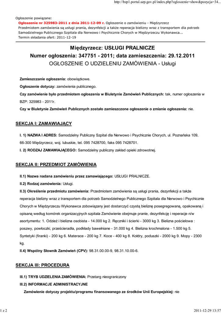 Międzyrzecz: USŁUGI PRALNICZE Numer ogłoszenia: 347751