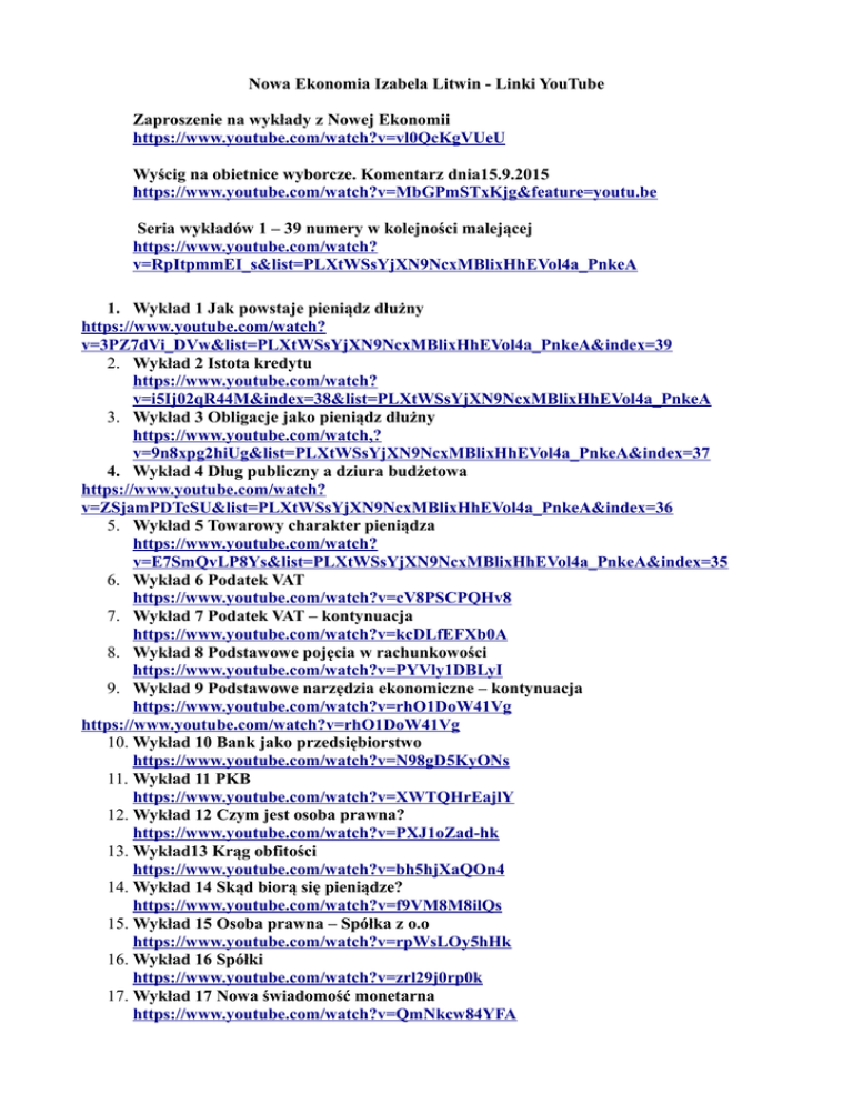 Nowa Ekonomia Izabela Litwin - Linki YouTube Zaproszenie na wykłady z Nowej Ekonomii https://www.youtube.com/watch?v=vl0QcKgVUeU Wyścig na obietnice wyborcze. Komentarz dnia15.9.2015 https://www.youtube.com/watch?v=MbGPmSTxKjg&feature=youtu.be Seria wykładów 1 – 39 numery w kolejności malejącej https://www.youtube.com/watch? v=RpItpmmEI_s&list=PLXtWSsYjXN9NcxMBlixHhEVol4a_PnkeA 1. Wykład 1 Jak powstaje pieniądz dłużny https://www.youtube.com/watch? v=3PZ7dVi_DVw&list=PLXtWSsYjXN9NcxMBlixHhEVol4a_PnkeA&index=39 2. Wykład 2 Istota kredytu https://www.youtube.com/watch? v=i5Ij02qR44M&index=38&list=PLXtWSsYjXN9NcxMBlixHhEVol4a_PnkeA 3. Wykład 3 Obligacje jako pieniądz dłużny https://www.youtube.com/watch,? v=9n8xpg2hiUg&list=PLXtWSsYjXN9NcxMBlixHhEVol4a_PnkeA&index=37 4. Wykład 4 Dług publiczny a dziura budżetowa https://www.youtube.com/watch? v=ZSjamPDTcSU&list=PLXtWSsYjXN9NcxMBlixHhEVol4a_PnkeA&index=36 5. Wykład 5 Towarowy charakter pieniądza https://www.youtube.com/watch? v=E7SmQvLP8Ys&list=PLXtWSsYjXN9NcxMBlixHhEVol4a_PnkeA&index=35 6. Wykład 6 Podatek VAT https://www.youtube.com/watch?v=cV8PSCPQHv8 7. Wykład 7 Podatek VAT – kontynuacja https://www.youtube.com/watch?v=kcDLfEFXb0A 8. Wykład 8 Podstawowe pojęcia w rachunkowości https://www.youtube.com/watch?v=PYVly1DBLyI 9. Wykład 9 Podstawowe narzędzia ekonomiczne – kontynuacja https://www.youtube.com/watch?v=rhO1DoW41Vg https://www.youtube.com/watch?v=rhO1DoW41Vg 10. Wykład 10 Bank jako przedsiębiorstwo https://www.youtube.com/watch?v=N98gD5KyONs 11. Wykład 11 PKB https://www.youtube.com/watch?v=XWTQHrEajlY 12. Wykład 12 Czym jest osoba prawna? https://www.youtube.com/watch?v=PXJ1oZad-hk 13. Wykład13 Krąg obfitości https://www.youtube.com/watch?v=bh5hjXaQOn4 14. Wykład 14 Skąd biorą się pieniądze? https://www.youtube.com/watch?v=f9VM8M8ilQs 15. Wykład 15 Osoba prawna – Spółka z o.o https://www.youtube.com/watch?v=rpWsLOy5hHk 16. Wykład 16 Spółki https://www.youtube.com/watch?v=zrl29j0rp0k 17. Wykład 17 Nowa świadomość monetarna https://www.youtube.com/watch?v=QmNkcw84YFA 18. Wykład 18 Jak uruchomić krąg obfotości? https://www.youtube.com/watch?v=WupG3uzF7bg 19. Wykład 19 Faktoring https://www.youtube.com/watch?v=vXTOIXbUA7A 20. Wykład 20 Swobodny przepływ kapitału https://www.youtube.com/watch?v=TcOLlVp_ym8 21. Wykład 21 Kredyty https://www.youtube.com/watch?v=hPZRjzvHPq4 22. Wykład 22 Czy pożyczanie pieniędzy szkodzi gospodarce? https://www.youtube.com/watch?v=8Zq1-CpGEcg 23. Wykład 23 Obecny system gospodarki finansowej – cz. I https://www.youtube.com/watch?v=LGn35AYDo2Q 24. Wykład 24 Obecny system gospofarki finansowej – cz. II https://www.youtube.com/watch?v=8FabgObq5q0 25. Wykład 25 Prawo bankowe https://www.youtube.com/watch?v=ToRTpD0oJB0 26. Wykład 26 Komentarz do wystąpienia M. Belki w Sejmie 27.3.2014 https://www.youtube.com/watch?v=vqKGoVTefec 27. Wykład 27 Tworzenie i unicestwienie kredytów – 1. https://www.youtube.com/watch?v=F4XJp1Ml9JI 28. Wykład 28 Tworzenie i unicestwienie kredytów – 2 https://www.youtube.com/watch?v=nRPazBHZHIU 29. Wykład 29 Zrozumieć kredyt https://www.youtube.com/watch?v=aYPAXSEWprE 30. Wykład 30 Upadłość https://www.youtube.com/watch?v=3TPGIz2-nR4 31. Wykład 31 Upadłość konsumencka https://www.youtube.com/watch?v=CmfsJaML-cU 32. Wykład 32 Dopłaty unijne https://www.youtube.com/watch?v=kYcIcz2K2-Y 33. Wykład 33 Pieniądz lokalny https://www.youtube.com/watch?v=vM8mGPW6TIk 34. Wykład 34 Parytet złota https://www.youtube.com/watch?v=TO_aTQBZARQ 35. Wykład 35 Bank municypalny https://www.youtube.com/watch?v=_N82JtTG9kM 36. Wykład 36 Spółdzielnie produkcyjno – konsumenckie https://www.youtube.com/watch?v=46E8SQHm2lM 37. Wykład 37 W jaki sposób uruchamia się banki? https://www.youtube.com/watch?v=YWaRsNn3GAg 38. Wykłd 38 Jak funkcjonują banki? https://www.youtube.com/watch?v=Q9TP1EdcjMk 39. Wykład 39 Dla czego nie można spłacić kredytów? https://www.youtube.com/watch? v=RpItpmmEI_s&index=1&list=PLXtWSsYjXN9NcxMBlixHhEVol4a_PnkeA