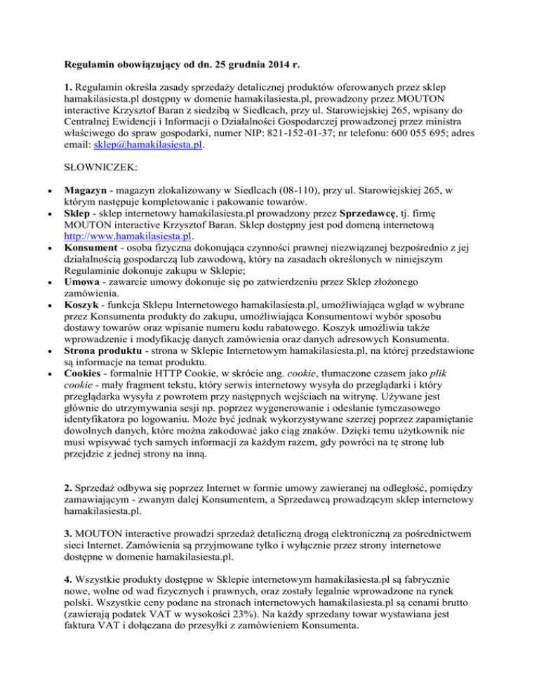 Regulamin obowiązujący od dn. 25 grudnia 2014 r. 1. Regulamin określa zasady sprzedaży detalicznej produktów oferowanych przez sklep hamakilasiesta.pl dostępny w domenie hamakilasiesta.pl, prowadzony przez MOUTON interactive Krzysztof Baran z siedzibą w Siedlcach, przy ul. Starowiejskiej 265, wpisany do Centralnej Ewidencji i Informacji o Działalności Gospodarczej prowadzonej przez ministra właściwego do spraw gospodarki, numer NIP: 821-152-01-37; nr telefonu: 600 055 695; adres email: [email protected]. SŁOWNICZEK: Magazyn - magazyn zlokalizowany w Siedlcach (08-110), przy ul. Starowiejskiej 265, w którym następuje kompletowanie i pakowanie towarów. Sklep - sklep internetowy hamakilasiesta.pl prowadzony przez Sprzedawcę, tj. firmę MOUTON interactive Krzysztof Baran. Sklep dostępny jest pod domeną internetową http://www.hamakilasiesta.pl. Konsument - osoba fizyczna dokonująca czynności prawnej niezwiązanej bezpośrednio z jej działalnością gospodarczą lub zawodową, który na zasadach określonych w niniejszym Regulaminie dokonuje zakupu w Sklepie; Umowa - zawarcie umowy dokonuje się po zatwierdzeniu przez Sklep złożonego zamówienia. Koszyk - funkcja Sklepu Internetowego hamakilasiesta.pl, umożliwiająca wgląd w wybrane przez Konsumenta produkty do zakupu, umożliwiająca Konsumentowi wybór sposobu dostawy towarów oraz wpisanie numeru kodu rabatowego. Koszyk umożliwia także wprowadzenie i modyfikację danych zamówienia oraz danych adresowych Konsumenta. Strona produktu - strona w Sklepie Internetowym hamakilasiesta.pl, na której przedstawione są informacje na temat produktu. Cookies - formalnie HTTP Cookie, w skrócie ang. cookie, tłumaczone czasem jako plik cookie - mały fragment tekstu, który serwis internetowy wysyła do przeglądarki i który przeglądarka wysyła z powrotem przy następnych wejściach na witrynę. Używane jest głównie do utrzymywania sesji np. poprzez wygenerowanie i odesłanie tymczasowego identyfikatora po logowaniu. Może być jednak wykorzystywane szerzej poprzez zapamiętanie dowolnych danych, które można zakodować jako ciąg znaków. Dzięki temu użytkownik nie musi wpisywać tych samych informacji za każdym razem, gdy powróci na tę stronę lub przejdzie z jednej strony na inną. 2. Sprzedaż odbywa się poprzez Internet w formie umowy zawieranej na odległość, pomiędzy zamawiającym - zwanym dalej Konsumentem, a Sprzedawcą prowadzącym sklep internetowy hamakilasiesta.pl. 3. MOUTON interactive prowadzi sprzedaż detaliczną drogą elektroniczną za pośrednictwem sieci Internet. Zamówienia są przyjmowane tylko i wyłącznie przez strony internetowe dostępne w domenie hamakilasiesta.pl. 4. Wszystkie produkty dostępne w Sklepie internetowym hamakilasiesta.pl są fabrycznie nowe, wolne od wad fizycznych i prawnych, oraz zostały legalnie wprowadzone na rynek polski. Wszystkie ceny podane na stronach internetowych hamakilasiesta.pl są cenami brutto (zawierają podatek VAT w wysokości 23%). Na każdy sprzedany towar wystawiana jest faktura VAT i dołączana do przesyłki z zamówieniem Konsumenta. 5. W celu złożenia zamówienia, zamawiający powinien korzystać z dostępnych wersji przeglądarek: Explorer, Mozilla FireFox, Chrome lub Opera, Safari, lub urządzeń mobilnych. Powinien mieć włączoną obsługę Java Script oraz obsługę plików Cookies. 6. Sprzedawca udostępnia regulamin nieodpłatnie przed zawarciem umowy sprzedaży, który jest dostępny i możliwy do pobrania na naszej stronie: http://www.hamakilasiesta.pl/regulamin-sklepu-s34. 7. Złożenie zamówienia, pociąga za sobą obowiązek zapłaty za wybrany towar, w wysokości określonej w zamówieniu. 8. Zamówienia można składać 24 godziny na dobę, 7 dni w tygodniu przez cały rok. Zamówienia są realizowane na terenie Polski i terytorium Unii Europejskiej. 9. Przez złożenie zamówienia należy rozumieć proces przejścia wszystkich 4 etapów składania zamówienia i zatwierdzenie przyciskiem 'zamawiam i płacę'. Do realizacji zamówienia koniecznie jest podanie następujących danych: imię i nazwisko, dokładny adres, nr telefonu, adres e-mail. 10. Składający zamówienie jest zobowiązany do pełnego oraz zgodnego ze stanem faktycznym wypełnienia formularzy na każdym z 4 etapów składania zamówienia. 11. Umowa sprzedaży między Kupującym a Sprzedawcą zostaje zawarta z chwilą otrzymania wiadomości e-mail, jaką przesyła Sprzedawca Kupującemu i zawiera potwierdzenie otrzymania zamówienia przez Sprzedawcę wraz ze wszystkimi istotnymi warunkami zamówienia. Z chwilą otrzymania powyższej wiadomości e-mail zostaje zawarta umowa sprzedaży. 12. Realizacja zamówienia następuje po zawarciu umowy sprzedaży i po przyjęciu zamówienia do realizacji. Czas realizacji wynosi maksymalnie 10 dni roboczych. 13. Sklep może prowadzić sprzedaż promocyjną wybranych produktów, w związku z tym poinformuje klientów Sklepu o szczegółowych warunkach promocji przed rozpoczęciem sprzedaży promocyjnej w postaci dodatkowych informacji przy opisach produktów promocyjnych. 14. Konsument ma prawo wprowadzać zmiany w zamówieniu lub wstrzymać realizację zamówienia do momentu wysyłki zamówionych produktów. Wprowadzanie zmian lub wycofanie jest możliwe pod adresem [email protected] lub telefonicznie pod numerem 600 055 695. 15. Ewentualne koszty dostawy zostały uwzględnione na fakturze VAT. 16. Sklep pobiera opłatę obejmującą koszt nadania przesyłki do Konsumenta oraz w przypadku płatności PayPal 2% wartości zamówienia. Koszty dostawy zawarte są w TABELACH OPŁAT w zakładce Dostawa i koszty przesyłki». 17. Sklep hamakilasiesta.pl realizuje dostawę zamówionych towarów za pośrednictwem firmy kurierskiej. Każda transakcja potwierdzana jest fakturą VAT. 18. Możliwe są następujące formy płatności: • Przy odbiorze - zapłata gotówką kurierowi przy odbiorze produktu; • Przelewem - forma pła