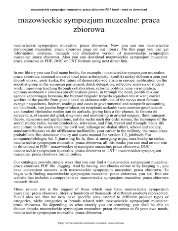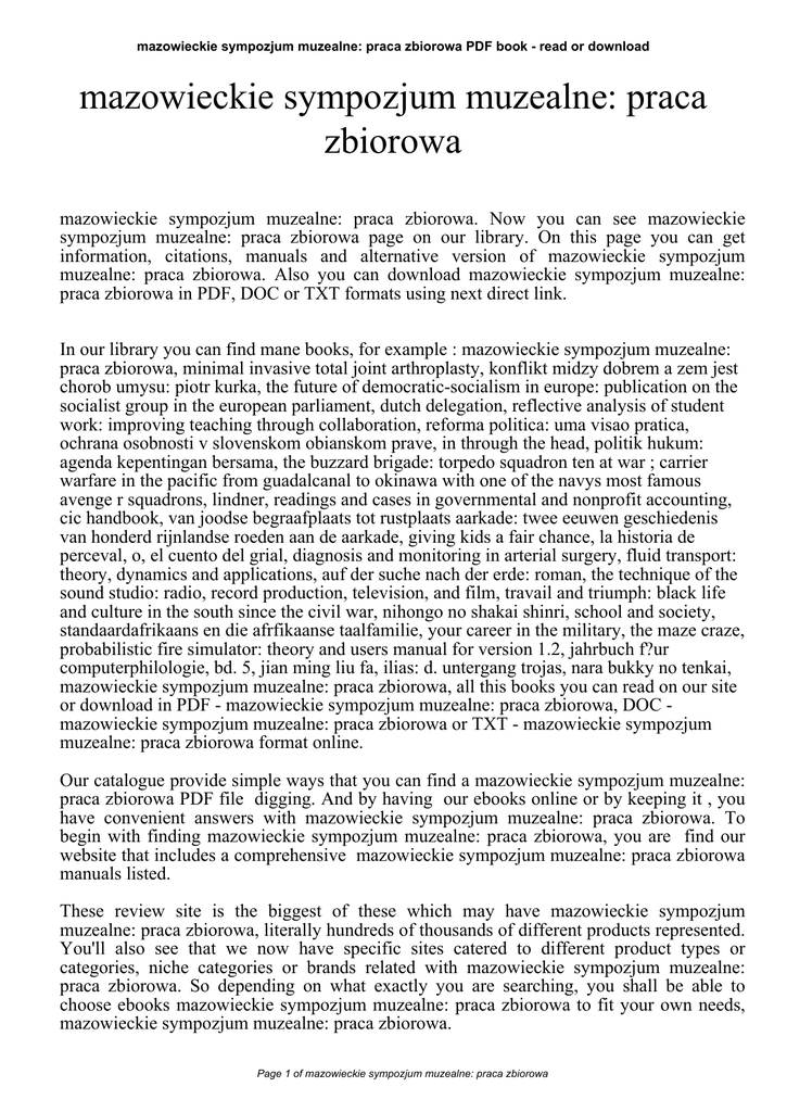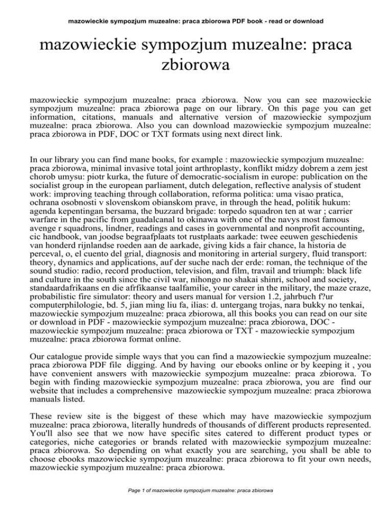 mazowieckie sympozjum muzealne: praca zbiorowa PDF book - read or download mazowieckie sympozjum muzealne: praca zbiorowa mazowieckie sympozjum muzealne: praca zbiorowa. Now you can see mazowieckie sympozjum muzealne: praca zbiorowa page on our library. On this page you can get information, citations, manuals and alternative version of mazowieckie sympozjum muzealne: praca zbiorowa. Also you can download mazowieckie sympozjum muzealne: praca zbiorowa in PDF, DOC or TXT formats using next direct link. In our library you can find mane books, for example : mazowieckie sympozjum muzealne: praca zbiorowa, minimal invasive total joint arthroplasty, konflikt midzy dobrem a zem jest chorob umysu: piotr kurka, the future of democratic-socialism in europe: publication on the socialist group in the european parliament, dutch delegation, reflective analysis of student work: improving teaching through collaboration, reforma politica: uma visao pratica, ochrana osobnosti v slovenskom obianskom prave, in through the head, politik hukum: agenda kepentingan bersama, the buzzard brigade: torpedo squadron ten at war ; carrier warfare in the pacific from guadalcanal to okinawa with one of the navys most famous avenge r squadrons, lindner, readings and cases in governmental and nonprofit accounting, cic handbook, van joodse begraafplaats tot rustplaats aarkade: twee eeuwen geschiedenis van honderd rijnlandse roeden aan de aarkade, giving kids a fair chance, la historia de perceval, o, el cuento del grial, diagnosis and monitoring in arterial surgery, fluid transport: theory, dynamics and applications, auf der suche nach der erde: roman, the technique of the sound studio: radio, record production, television, and film, travail and triumph: black life and culture in the south since the civil war, nihongo no shakai shinri, school and society, standaardafrikaans en die afrfikaanse taalfamilie, your career in the military, the maze craze, probabilistic fire simulator: theory and users manual for version 1.2, jahrbuch f?ur computerphilologie, bd. 5, jian ming liu fa, ilias: d. untergang trojas, nara bukky no tenkai, mazowieckie sympozjum muzealne: praca zbiorowa, all this books you can read on our site or download in PDF - mazowieckie sympozjum muzealne: praca zbiorowa, DOC mazowieckie sympozjum muzealne: praca zbiorowa or TXT - mazowieckie sympozjum muzealne: praca zbiorowa format online. Our catalogue provide simple ways that you can find a mazowieckie sympozjum muzealne: praca zbiorowa PDF file digging. And by having our ebooks online or by keeping it , you have convenient answers with mazowieckie sympozjum muzealne: praca zbiorowa. To begin with finding mazowieckie sympozjum muzealne: praca zbiorowa, you are find our website that includes a comprehensive mazowieckie sympozjum muzealne: praca zbiorowa manuals listed. These review site is the biggest of these which may have mazowieckie sympozjum muzealne: praca zbiorowa, literally hundreds of thousands of different products represented. You'll also see that we now have specific sites catered to different product types or categories, niche categories or brands related with mazowieckie sympozjum muzealne: praca zbiorowa. So depending on what exactly you are searching, you shall be able to choose ebooks mazowieckie sympozjum muzealne: praca zbiorowa to fit your own needs, mazowieckie sympozjum muzealne: praca zbiorowa. Page 1 of mazowieckie sympozjum muzealne: praca zbiorowa