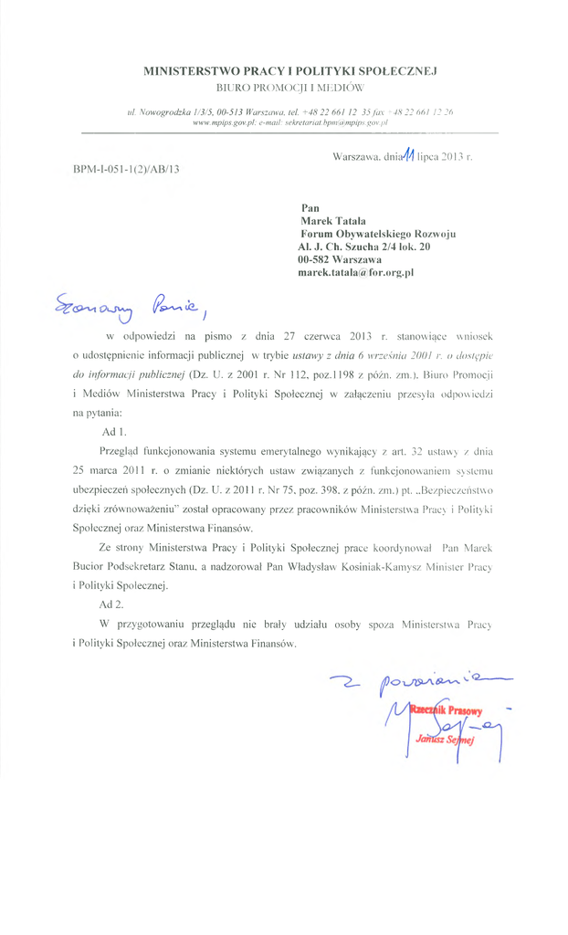 MINISTERSTWO PRACY I POLITYKI SPOŁECZNEJ BIURO PROM OCJI I M ED IÓ W ul. Nowogrodzka 1/3/5, 00-513 Warszawa, tel. +48 22 661 12 35fa x +48 22 661 12 26 www.mpips.gov.pl; e-mail: sekretariat.bpm(d}mpips.gov.pl Warszawa. dnia*^ lipca 2013 r. Pan Marek Tatała Forum Obywatelskiego Rozwoju AL J. Ch. Szucha 2/4 lok. 20 00-582 Warszawa marek.tatala(a for.org.pl (U w odpow iedzi j na pism o z dnia 27 czerwca 2013 r. stanowiące wniosek 0 udostępnienie inform acji publicznej w trybie ustawy z dnia 6 września 2001 r. o dostępie do inform acji publicznej (Dz. U. z 2001 r. Nr 112, poz.1198 z późn. zm.). Biuro Promocji 1 M ediów M inisterstwa Pracy i Polityki Społecznej w załączeniu przesyła odpowiedzi na pytania: Ad 1. Przegląd funkcjonow ania systemu em erytalnego wynikający z art. 32 ustawy z dnia 25 m arca 2011 r. o zm ianie niektórych ustaw związanych z funkcjonow aniem systemu ubezpieczeń społecznych (Dz. U. z 2011 r. N r 75, poz. 398, z późn. zm.) pt. „Bezpieczeństwo dzięki zrów now ażeniu” został opracowany przez pracow ników M inisterstwa Pracy i Polityki Społecznej oraz M inisterstwa Finansów. Ze strony M inisterstw a Pracy i Polityki Społecznej prace koordynow ał Pan Marek Bucior Podsekretarz Stanu, a nadzorował Pan W ładysław K osiniak-K am ysz M inister Pracy i Polityki Społecznej. Ad 2. W przygotow aniu przeglądu nie brały udziału osoby spoza M inisterstwa Pracy i Polityki Społecznej oraz M inisterstwa Finansów.