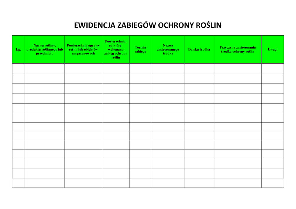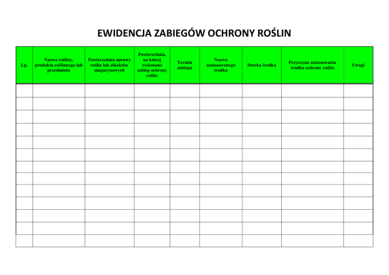 EWIDENCJA ZABIEGÓW OCHRONY ROŚLIN Lp. Nazwa rośliny, produktu roślinnego lub przedmiotu Powierzchnia uprawy roślin lub obiektów magazynowych Powierzchnia, na której wykonano zabieg ochrony roślin Termin zabiegu Nazwa zastosowanego środka Dawka środka Przyczyna zastosowania środka ochrony roślin Uwagi