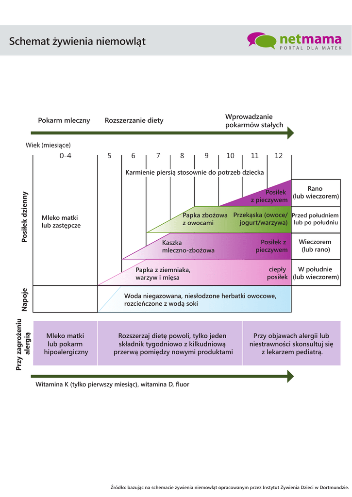 Schemat żywienia niemowląt Pokarm mleczny Wprowadzanie pokarmów stałych Rozszerzanie diety Wiek (miesiące) 0-4 5 6 7 8 9 10 11 12 Posiłek dzienny Karmienie piersią stosownie do potrzeb dziecka Rano Posiłek (lub wieczorem) z pieczywem Mleko matki lub zastępcze Papka zbożowa Przekąska (owoce/ Przed południem jogurt/warzywa) lub po południu z owocami Kaszka mleczno-zbożowa Przy zagrożeniu Napoje alergią Papka z ziemniaka, warzyw i mięsa Posiłek z pieczywem Wieczorem (lub rano) ciepły W południe posiłek (lub wieczorem) Woda niegazowana, niesłodzone herbatki owocowe, rozcieńczone z wodą soki Mleko matki lub pokarm hipoalergiczny Rozszerzaj dietę powoli, tylko jeden składnik tygodniowo z kilkudniową przerwą pomiędzy nowymi produktami Przy objawach alergii lub niestrawności skonsultuj się z lekarzem pediatrą. Witamina K (tylko pierwszy miesiąc), witamina D, fluor Źródło: bazując na schemacie żywienia niemowląt opracowanym przez Instytut Żywienia Dzieci w Dortmundzie.