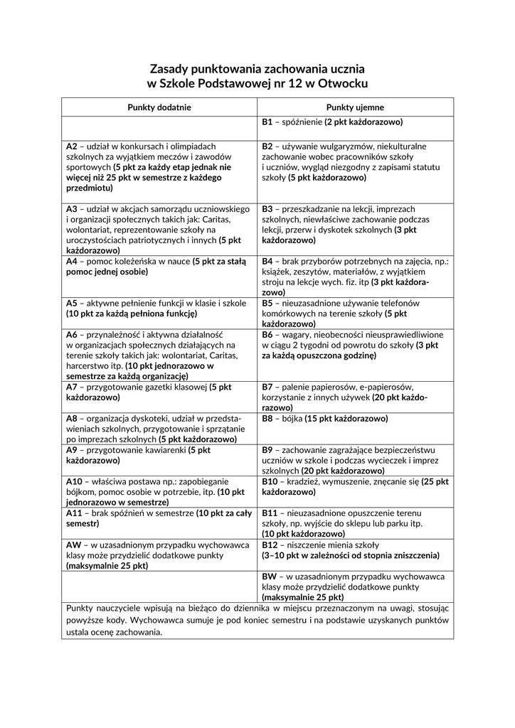 Zasady punktowania zachowania ucznia w Szkole Podstawowej nr 12 w Otwocku Punkty dodatnie Punkty ujemne B1 – spóźnienie (2 pkt każdorazowo) A2 – udział w konkursach i olimpiadach szkolnych za wyjątkiem meczów i zawodów sportowych (5 pkt za każdy etap jednak nie więcej niż 25 pkt w semestrze z każdego przedmiotu) B2 – używanie wulgaryzmów, niekulturalne zachowanie wobec pracowników szkoły i uczniów, wygląd niezgodny z zapisami statutu szkoły (5 pkt każdorazowo) A3 – udział w akcjach samorządu uczniowskiego i organizacji społecznych takich jak: Caritas, wolontariat, reprezentowanie szkoły na uroczystościach patriotycznych i innych (5 pkt każdorazowo) A4 – pomoc koleżeńska w nauce (5 pkt za stałą pomoc jednej osobie) B3 – przeszkadzanie na lekcji, imprezach szkolnych, niewłaściwe zachowanie podczas lekcji, przerw i dyskotek szkolnych (3 pkt każdorazowo) A5 – aktywne pełnienie funkcji w klasie i szkole (10 pkt za każdą pełniona funkcję) A6 – przynależność i aktywna działalność w organizacjach społecznych działających na terenie szkoły takich jak: wolontariat, Caritas, harcerstwo itp. (10 pkt jednorazowo w semestrze za każdą organizację) A7 – przygotowanie gazetki klasowej (5 pkt każdorazowo) A8 – organizacja dyskoteki, udział w przedstawieniach szkolnych, przygotowanie i sprzątanie po imprezach szkolnych (5 pkt każdorazowo) A9 – przygotowanie kawiarenki (5 pkt każdorazowo) A10 – właściwa postawa np.: zapobieganie bójkom, pomoc osobie w potrzebie, itp. (10 pkt jednorazowo w semestrze) A11 – brak spóźnień w semestrze (10 pkt za cały semestr) AW – w uzasadnionym przypadku wychowawca klasy może przydzielić dodatkowe punkty (maksymalnie 25 pkt) B4 – brak przyborów potrzebnych na zajęcia, np.: książek, zeszytów, materiałów, z wyjątkiem stroju na lekcje wych. fiz. itp (3 pkt każdorazowo) B5 – nieuzasadnione używanie telefonów komórkowych na terenie szkoły (5 pkt każdorazowo) B6 – wagary, nieobecności nieusprawiedliwione w ciągu 2 tygodni od powrotu do szkoły (3 pkt za każdą opuszczona godzinę) B7 – palenie papierosów, e-papierosów, korzystanie z innych używek (20 pkt każdorazowo) B8 – bójka (15 pkt każdorazowo) B9 – zachowanie zagrażające bezpieczeństwu uczniów w szkole i podczas wycieczek i imprez szkolnych (20 pkt każdorazowo) B10 – kradzież, wymuszenie, znęcanie się (25 pkt każdorazowo) B11 – nieuzasadnione opuszczenie terenu szkoły, np. wyjście do sklepu lub parku itp. (10 pkt każdorazowo) B12 – niszczenie mienia szkoły (3–10 pkt w zależności od stopnia zniszczenia) BW – w uzasadnionym przypadku wychowawca klasy może przydzielić dodatkowe punkty (maksymalnie 25 pkt) Punkty nauczyciele wpisują na bieżąco do dziennika w miejscu przeznaczonym na uwagi, stosując powyższe kody. Wychowawca sumuje je pod koniec semestru i na podstawie uzyskanych punktów ustala ocenę zachowania.