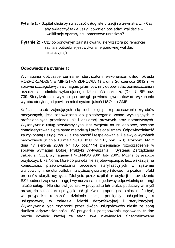 Pytanie 1: - Szpital chciałby świadczyć usługi sterylizacji na zewnątrz … - Czy aby świadczyć takie usługi powinien posiadać walidacje – kwalifikacje operacyjne i procesowe urządzeń? Pytanie 2: - Czy po ponownym zainstalowaniu sterylizatora po remoncie szpitala potrzebne jest wykonanie ponownej walidacji instalacyjnej? Odpowiedź na pytanie 1: Wymagania dotyczące centralnej sterylizatorni wykonującej usługi określa ROZPORZĄDZENIE MINISTRA ZDROWIA 1) z dnia 26 czerwca 2012 r. w sprawie szczegółowych wymagań, jakim powinny odpowiadać pomieszczenia i urządzenia podmiotu wykonującego działalność leczniczą (Dz. U. RP poz. 739).Sterylizatornia wykonująca usługi powinna gwarantować wykonanie wyrobu sterylnego i powinna mieć system jakości ISO lub GMP. Każda z osób zajmujących się technologią reprocesowania wyrobów medycznych, jest zobowiązana do przestrzegania zasad wynikających z profesjonalnych przesłanek jak i deklaracji prawnych oraz normatywnych. Wykonywanie usług sterylizacyjnych, bez względu na ich odbiorcę, powinno charakteryzować się tą samą metodyką i profesjonalizmem. Odpowiedzialność za wykonaną usługę implikuje znajomość i respektowanie: Ustawy o wyrobach medycznych (z dnia 10 maja 2010 Dz.U. nr 107, poz. 679), Rozporz. MZ z dnia 17 sierpnia 2009r Nr 135 poz.1114 zmieniające rozporządzenie w sprawie wymagań Dobrej Praktyki Wytwarzania, Systemu Zarządzania Jakością (SZJ), wymagania PN-EN-ISO 9001 luty 2009. Można by jeszcze przytoczyć kilka Norm, które co prawda nie są obowiązujące, lecz wskazują na konieczność przeprowadzania procesów sterylizacyjnych w systemie walidowanym, co stanowiłoby najwyższą gwarancję i dowód na poziom i efekt procesów sterylizacyjnych. Zdobycie przez szpital akredytacji i prowadzenie SZJ podnosi zapewne rangę i wymusza na usługodawcy odpowiednią do rangi jakość usług. Nie stanowi jednak, w przypadku ich braku, podstawy w myśl prawa, do zaniechania przyjęcia usługi. Kwestią sporną natomiast może być, w przypadku roszczeń, dzielenie usługi pomiędzy usługobiorcę a usługodawcę, w zakresie ścieżki dezynfekcyjnej i sterylizacyjnej. Wykonywanie tych czynności przez dwóch usługodawców niesie ze sobą dualizm odpowiedzialności. W przypadku postępowania sądowego trudno będzie dowieść każdej ze stron swej niewinności. Scentralizowane sterylizatornie w swym założeniu wprowadzają własną odpowiedzialność za poszczególne procedury, za profesjonalizm i jakość na wysokim poziomie. Odpowiedź na pyt. 2 Walidacja instalacyjna opisana w Normie PN EN ISO 14937 w pkt. 9.2 do 9.2.2.5 wskazuje na potrzebę dokonania specyfikacji instalacyjnej odnośnie miejsca, w którym sprzęt ma być zainstalowany łącznie z wszelkimi wymaganiami instalacyjnymi. Powinny zostać określone szczególne środki ostrożności i zabezpieczenia (na przykład osprzęt bezpieczeństwa). Instrukcja instalowania powinna być udokumentowana i powinna zawierać informacje odnoszące się do zdrowia i bezpieczeństwa personelu. Powinno się wykazać , że sprzęt i wszelkie przedmioty pomocnicze, jakie zainstalowano, działają prawidłowo. Norma wyraźnie wskazuje, że kwalifikację należy wykonać przy instalowaniu sprzętu - kwalifikacja instalacyjna IQ. Należy przyjąć, iż każda następna instalacja wymagać będzie tej samej procedury. Zgodnie z PN-EN-!4937 zadaniem walidacji (kwalifikacji) instalacyjnej „IQ” jest wykazanie że sterylizator zainstalowany zgodnie z wymaganiami instalacyjnymi (określonymi przez swego wytwórcę) na danym stanowisku pracy działa prawidłowo (p. 9.2.2.4) a status kalibracji całego oprzyrządowania jest właściwy (p.9.3.1.). „Nowa” walidacja (kwalifikacja) instalacyjna „IQ” wymaga przeprowadzenia dodatkowej kwalifikacji „OQ” i „PQ” i (powtórzonej walidacji operacyjnej i procesu ) tj rewalidacji potwierdzającej że „OQ” i „PQ” na nowym stanowisku zainstalowania są również prawidłowe i nie uległy zmianie. Zespół konsultantów PSSM Elżbieta Kutrowska Waldemar Olszak Barbara Waszak 21.10.2015