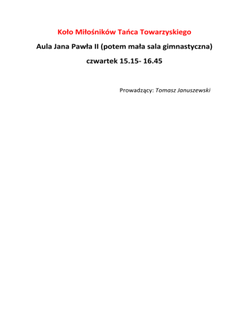Koło Miłośników Tańca Towarzyskiego Aula Jana Pawła II (potem mała sala gimnastyczna) czwartek 15.15- 16.45 Prowadzący: Tomasz Januszewski