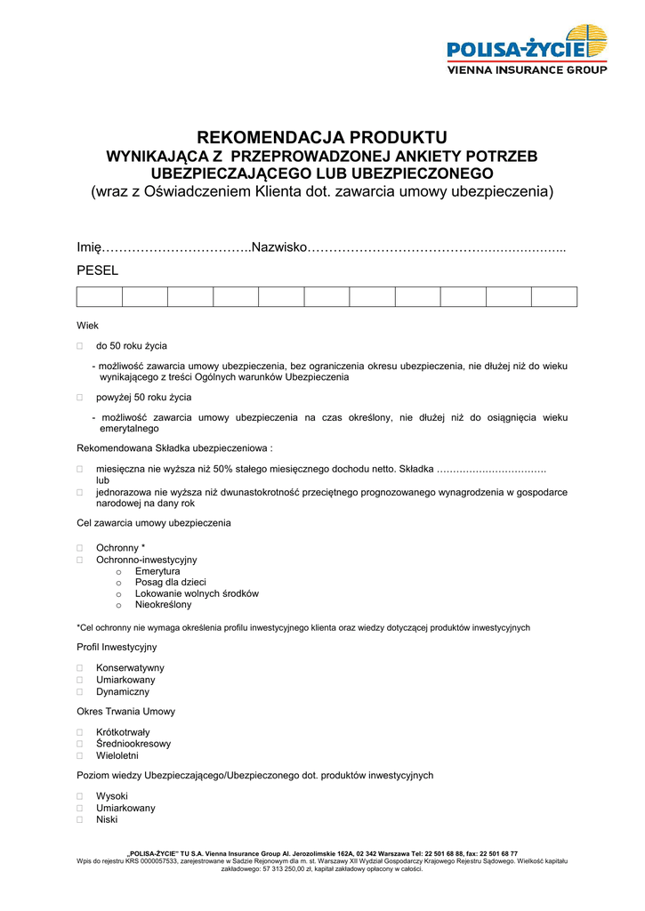 REKOMENDACJA PRODUKTU WYNIKAJĄCA Z PRZEPROWADZONEJ ANKIETY POTRZEB UBEZPIECZAJĄCEGO LUB UBEZPIECZONEGO (wraz z Oświadczeniem Klienta dot. zawarcia umowy ubezpieczenia) Imię……………………………..Nazwisko…………………………………………………….. PESEL Wiek do 50 roku życia - możliwość zawarcia umowy ubezpieczenia, bez ograniczenia okresu ubezpieczenia, nie dłużej niż do wieku wynikającego z treści Ogólnych warunków Ubezpieczenia powyżej 50 roku życia - możliwość zawarcia umowy ubezpieczenia na czas określony, nie dłużej niż do osiągnięcia wieku emerytalnego Rekomendowana Składka ubezpieczeniowa : miesięczna nie wyższa niż 50% stałego miesięcznego dochodu netto. Składka ……………………………. lub jednorazowa nie wyższa niż dwunastokrotność przeciętnego prognozowanego wynagrodzenia w gospodarce narodowej na dany rok Cel zawarcia umowy ubezpieczenia Ochronny * Ochronno-inwestycyjny o Emerytura o Posag dla dzieci o Lokowanie wolnych środków o Nieokreślony *Cel ochronny nie wymaga określenia profilu inwestycyjnego klienta oraz wiedzy dotyczącej produktów inwestycyjnych Profil Inwestycyjny Konserwatywny Umiarkowany Dynamiczny Okres Trwania Umowy Krótkotrwały Średniookresowy Wieloletni Poziom wiedzy Ubezpieczającego/Ubezpieczonego dot. produktów inwestycyjnych Wysoki Umiarkowany Niski „POLISA-ŻYCIE” TU S.A. Vienna Insurance Group Al. Jerozolimskie 162A, 02 342 Warszawa Tel: 22 501 68 88, fax: 22 501 68 77 Wpis do rejestru KRS 0000057533, zarejestrowane w Sadzie Rejonowym dla m. st. Warszawy XII Wydział Gospodarczy Krajowego Rejestru Sądowego. Wielkość kapitału zakładowego: 57 313 250,00 zł, kapitał zakładowy opłacony w całości. PODSUMOWANIE : Rekomendacja …………………………………………………………………………………………………………… …………………………………………………………………………………………………………… …………………………………………………………………………………………………………… Uzasadnienie: …………………………………………………………………………………………………………… …………………………………………………………………………………………………………… …………………………………………………………………………………………………………… …………………………………………………………………………………………………………… …………………………………………………………………………………………………………… Data i podpis Ubezpieczającego / Ubezpieczonego Podpis Agenta OŚWIADCZENIE KLIENTA DOTYCZĄCE REKOMENDACJI* Oświadczam, że po zapoznaniu się z powyższą Rekomendacją: Wyrażam zgodę na zawarcie umowy ubezpieczenia w ramach rekomendowanego produktu / ubezpieczeniowego funduszu kapitałowego; Odstępuję od zawarcia umowy ubezpieczenia; Pomimo braku możliwości zaoferowania przez „Polisa-Życie” TU S.A. Vienna Insurance Group, odpowiedniego produktu podtrzymuję wolę zawarcia umowy ubezpieczenia w ramach …………………………………………………………………………………………. (należy podać nazwę produktu ubezpieczeniowego / ubezpieczeniowego funduszu kapitałowego) Data i Podpis Ubezpieczającego / Ubezpieczonego *proszę zaznaczyć właściwą odpowiedź „POLISA-ŻYCIE” TU S.A. Vienna Insurance Group Al. Jerozolimskie 162A, 02 342 Warszawa Tel: 22 501 68 88, fax: 22 501 68 77 Wpis do rejestru KRS 0000057533, zarejestrowane w Sadzie Rejonowym dla m. st. Warszawy XII Wydział Gospodarczy Krajowego Rejestru Sądowego. Wielkość kapitału zakładowego: 57 313 250,00 zł, kapitał zakładowy opłacony w całości.