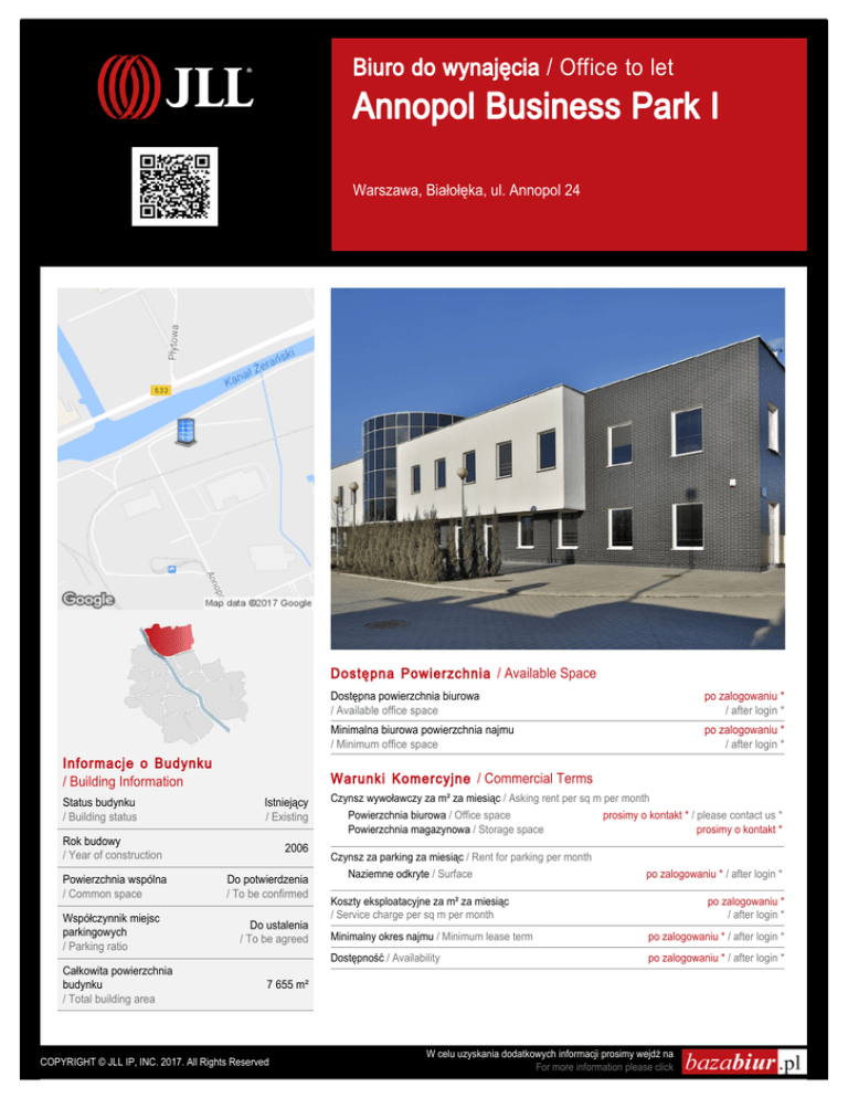 Biuro do wynajęcia / Office to let Annopol Business Park I Warszawa, Białołęka, ul. Annopol 24 Dostępna Powierzchnia / Available Space Informacje o Budynku / Building Information Status budynku / Building status Współczynnik miejsc parkingowych / Parking ratio Całkowita powierzchnia budynku / Total building area po zalogowaniu * / after login * Minimalna biurowa powierzchnia najmu / Minimum office space po zalogowaniu * / after login * Warunki Komercyjne / Commercial Terms Istniejący / Existing Rok budowy / Year of construction Powierzchnia wspólna / Common space Dostępna powierzchnia biurowa / Available office space 2006 Do potwierdzenia / To be confirmed Do ustalenia / To be agreed Czynsz wywoławczy za m² za miesiąc / Asking rent per sq m per month Powierzchnia biurowa / Office space prosimy o kontakt * / please contact us * Powierzchnia magazynowa / Storage space prosimy o kontakt * Czynsz za parking za miesiąc / Rent for parking per month Naziemne odkryte / Surface po zalogowaniu * / after login * Koszty eksploatacyjne za m² za miesiąc / Service charge per sq m per month po zalogowaniu * / after login * Minimalny okres najmu / Minimum lease term po zalogowaniu * / after login * Dostępność / Availability po zalogowaniu * / after login * 7 655 m² COPYRIGHT © JLL IP, INC. 2017. All Rights Reserved W celu uzyskania dodatkowych informacji prosimy wejdź na For more information please click Dostępna Powierzchnia / Available Space Budynek biurowy Piętro / Floor 0 Powierzchnia wolna / Vacant space Dostępność / Availability prosimy o kontakt * / please contact us * prosimy o kontakt * / please contact us * Razem / Total po zalogowaniu * / after login * Hala 1 Piętro / Floor 0 *** Powierzchnia wolna / Vacant space Dostępność / Availability prosimy o kontakt * / please contact us * prosimy o kontakt * / please contact us * Razem / Total po zalogowaniu * / after login * (***) Powierzchnia magazynowa / Storage space Standardowe Wykończenie / Standard Fit-Out Typowy Plan Piętra / Typical Floor Plan Klimatyzacja / Air conditioning Podwieszany sufit / Suspended ceiling Okablowanie elektryczne / Power cabling Podział powierzchni ściankami / Wall partitioning Ochrona budynku / Security Kontrola dostępu do budynku / Access control W celu uzyskania dodatkowych informacji lub zorganizowania spotkania prosimy o kontakt: / For more information or to arrange a viewing please contact: +48 22 167 00 00 Niniejsze warunki mają charakter wyłącznie informacyjny i nie stanowią części wiążącej oferty lub umowy. / The Property Particulars are for information purposes only and do not form any part of binding offer or contract. COPYRIGHT © JLL IP, INC. 2017. All Rights Reserved W celu uzyskania dodatkowych informacji prosimy wejdź na For more information please click