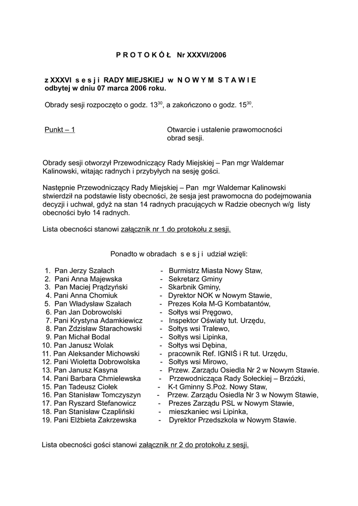 Protokół Nr XXXVI/2006 z XXXVI sesji Rady Miejskiej w Nowym