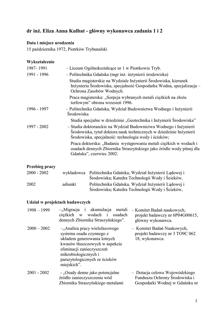 dr inŜ. Eliza Anna Kulbat - główny wykonawca zadania 1 i 2 Data i miejsce urodzenia 15 października 1972, Piotrków Trybunalski Wykształcenie 1987- 1991 1991 - 1996 1996 - 1997 1997 - 2002 Przebieg pracy 2000 - 2002 2002 – Liceum Ogólnokształcące nr 1 w Piotrkowie Tryb. – Politechnika Gdańska (mgr inŜ. inŜynierii środowiska) Studia magisterskie na Wydziale InŜynierii Środowiska, kierunek InŜynieria Środowiska, specjalność Gospodarka Wodna, specjalizacja – Ochrona Zasobów Wodnych. Praca magisterska: „Sorpcja wybranych metali cięŜkich na złoŜu torfowym” obrona wrzesień 1996. – Politechnika Gdańska, Wydział Budownictwa Wodnego i InŜynierii Środowiska Studia specjalne w dziedzinie „Geotechnika i InŜynierii Środowiska” – Studia doktoranckie na Wydział Budownictwa Wodnego i InŜynierii Środowiska, tytuł doktora nauk technicznych w dziedzinie InŜynierii Środowiska, specjalność: technologia wody i ścieków; Praca doktorska: „Badania występowania metali cięŜkich w wodach i osadach dennych Zbiornika Straszyńskiego jako źródle wody pitnej dla Gdańska”, czerwiec 2002. wykładowca Politechnika Gdańska, Wydział InŜynierii Lądowej i Środowiska; Katedra Technologii Wody i Ścieków, adiunkt Politechnika Gdańska, Wydział InŜynierii Lądowej i Środowiska; Katedra Technologii Wody i Ścieków, Udział w projektach badawczych 1998 – 1999 –„Migracja i akumulacja metali – Komitet Badań naukowych, cięŜkich w wodach i osadach projekt badawczy nr 6P04G00615, dennych Zbiornika Straszyńskiego”. główny wykonawca. 2000 – 2002 –„Analiza pracy wielofazowego systemu osadu czynnego z układem generowania lotnych kwasów tłuszczowych w aspekcie eliminacji zanieczyszczeń mikrobiologicznych i parazytologicznych ze ścieków miejskich”. – Komitet Badań Naukowych, projekt badawczy nr 3 TO9C 062 18, wykonawca. 2001 - 2002 - „Osady denne jako potencjalne źródło zanieczyszczenia wód Zbiornika Straszyńskiego metalami – Dotacja celowa Wojewódzkiego Funduszu Ochrony Środowiska i Gospodarki Wodnej w Gdańsku nr 1 cięŜkimi”. 2007 - 2008 2007 – 2009 2007-2010 –„Występowanie bakterii lekoopornych w wodnych ekosystemach śródlądowych poddawanych presji antropogenicznej”, –„Zmienność zagroŜeń ekotoksykologicznych i mikrobiologicznych towarzysząca biologicznemu oczyszczaniu odcieków ze składowisk odpadów komunalnych” –„New methods for emission reduction of selected pollutants and application of by-products from wastewater treatment plants”, Task 2: „ Metody dezynfekcji ścieków oczyszczonych odprowadzanych do wód powierzchniowych WFOŚ/D/201/103/2001, główny wykonawca. – Ministerstwo Nauki i Szkolnictwa WyŜszego, projekt badawczy nr N305 085 32/2959, wykonawca, – Ministerstwo Nauki i Szkolnictwa WyŜszego, projekt badawczy nr N523 077 32/2900 wykonawca – Norweski Mechanizm Finansowy, projekt badawczy nr PL0085SGE-00153-E-V2-EEA FM, główny wykonawca Nagrody i wyróŜnienia za działalność naukową 2003 - Nagroda Rektora Politechniki Gdańskiej (zespołowa) III stopnia za szczególne osiągnięcia w działalności naukowej, 2