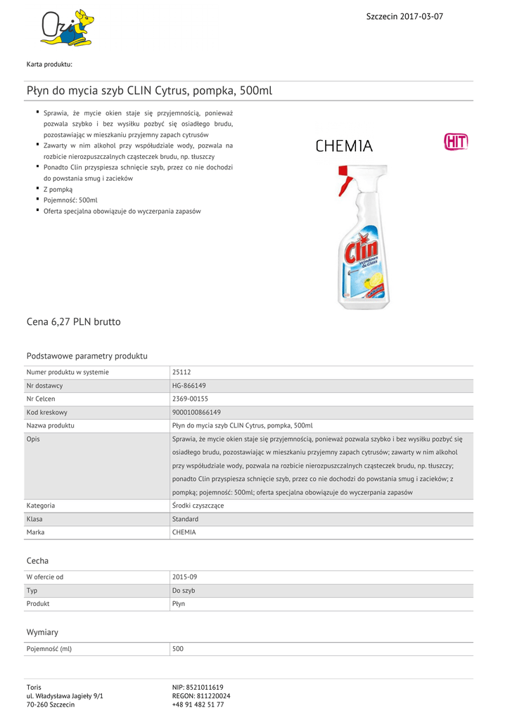 Szczecin 2017-03-07 Karta produktu: Płyn do mycia szyb CLIN Cytrus, pompka, 500ml Sprawia, że mycie okien staje się przyjemnością, ponieważ pozwala szybko i bez wysiłku pozbyć się osiadłego brudu, pozostawiając w mieszkaniu przyjemny zapach cytrusów Zawarty w nim alkohol przy współudziale wody, pozwala na rozbicie nierozpuszczalnych cząsteczek brudu, np. tłuszczy Ponadto Clin przyspiesza schnięcie szyb, przez co nie dochodzi do powstania smug i zacieków Z pompką Pojemność: 500ml Oferta specjalna obowiązuje do wyczerpania zapasów Cena 6,27 PLN brutto Podstawowe parametry produktu Numer produktu w systemie 25112 Nr dostawcy HG-866149 Nr Celcen 2369-00155 Kod kreskowy 9000100866149 Nazwa produktu Płyn do mycia szyb CLIN Cytrus, pompka, 500ml Opis Sprawia, że mycie okien staje się przyjemnością, ponieważ pozwala szybko i bez wysiłku pozbyć się osiadłego brudu, pozostawiając w mieszkaniu przyjemny zapach cytrusów; zawarty w nim alkohol przy współudziale wody, pozwala na rozbicie nierozpuszczalnych cząsteczek brudu, np. tłuszczy; ponadto Clin przyspiesza schnięcie szyb, przez co nie dochodzi do powstania smug i zacieków; z pompką; pojemność: 500ml; oferta specjalna obowiązuje do wyczerpania zapasów Kategoria Środki czyszczące Klasa Standard Marka CHEMIA Cecha W ofercie od 2015-09 Typ Do szyb Produkt Płyn Wymiary Pojemność (ml) 500 Toris ul. Władysława Jagieły 9/1 70-260 Szczecin NIP: 8521011619 REGON: 811220024 +48 91 482 51 77 Szczecin 2017-03-07 Karta katalogowa produktu cd. Płyn do mycia szyb CLIN Cytrus, pompka, 500ml Wspólny słownik zamówień CPV 39830000-9 Środki czyszczące Certyfikaty Hit Hit Nowy produkt w ofercie Standard Serdecznie zapraszamy do współpracy Toris zespół. Toris ul. Władysława Jagieły 9/1 70-260 Szczecin NIP: 8521011619 REGON: 811220024 +48 91 482 51 77