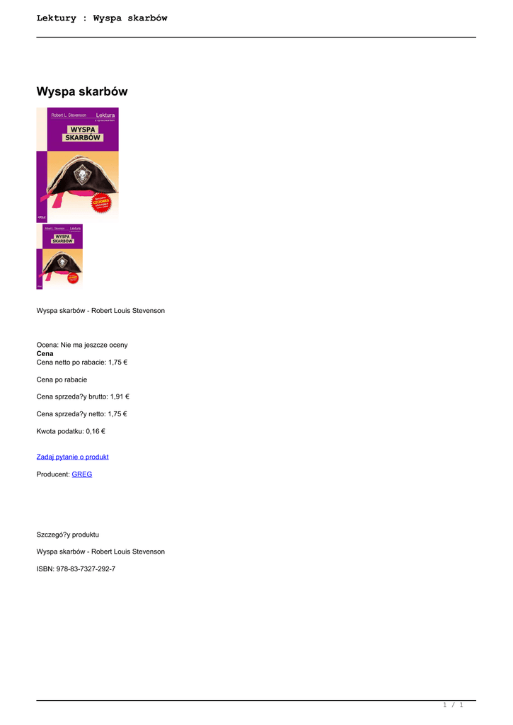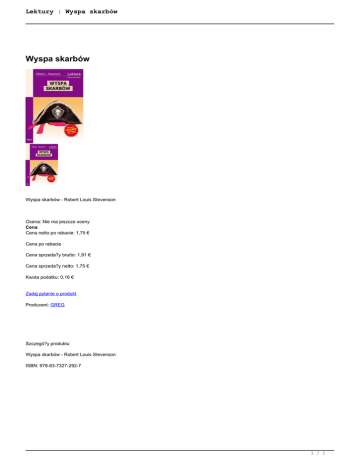 Lektury : Wyspa skarbów Wyspa skarbów Wyspa skarbów - Robert Louis Stevenson Ocena: Nie ma jeszcze oceny Cena Cena netto po rabacie: 1,75 € Cena po rabacie Cena sprzeda?y brutto: 1,91 € Cena sprzeda?y netto: 1,75 € Kwota podatku: 0,16 € Zadaj pytanie o produkt Producent: GREG Szczegó?y produktu Wyspa skarbów - Robert Louis Stevenson ISBN: 978-83-7327-292-7 1 / 1 Powered by TCPDF (www.tcpdf.org)